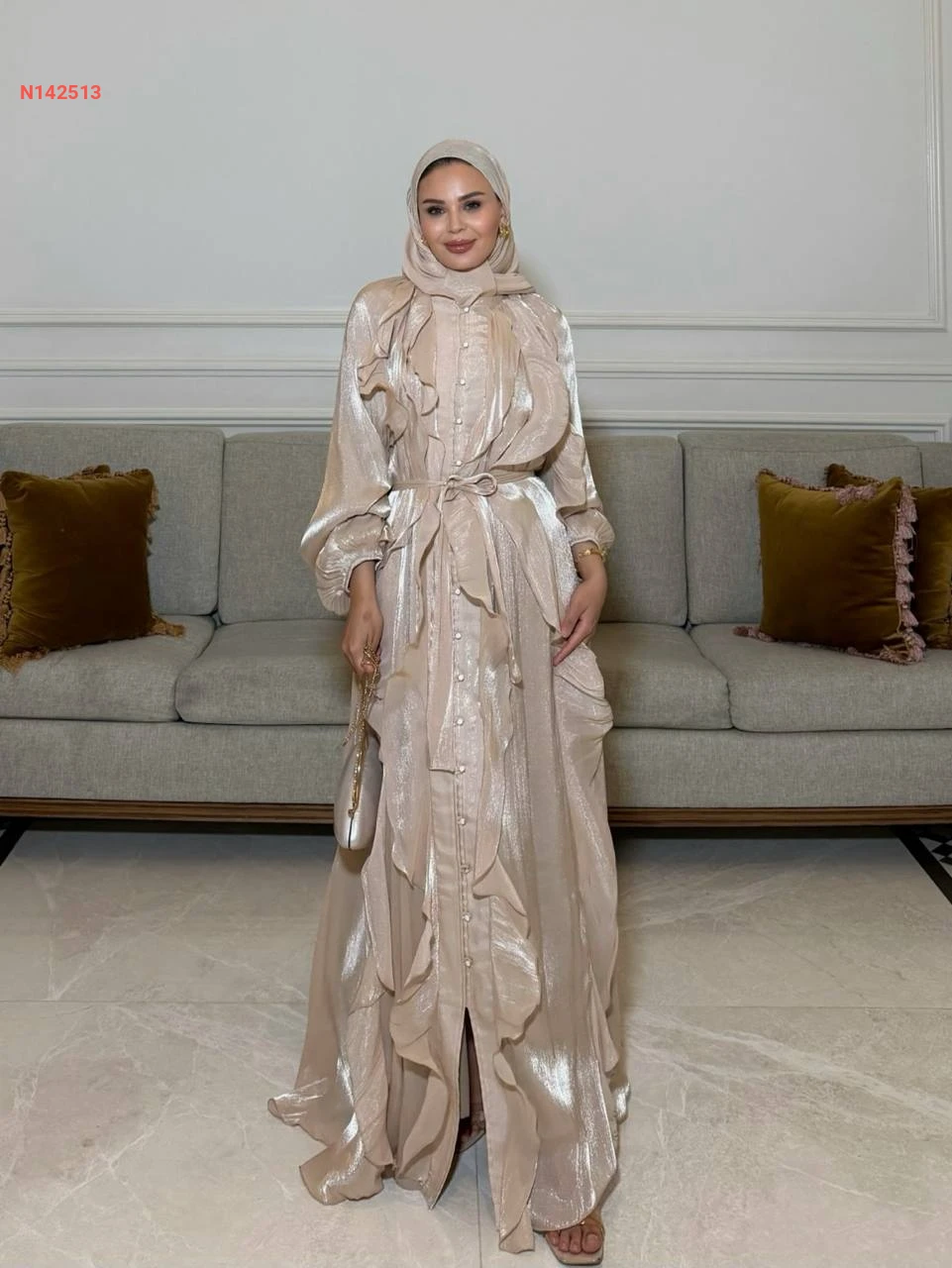 فستان طويل لميع بتفاصيل كشكش وأزرار