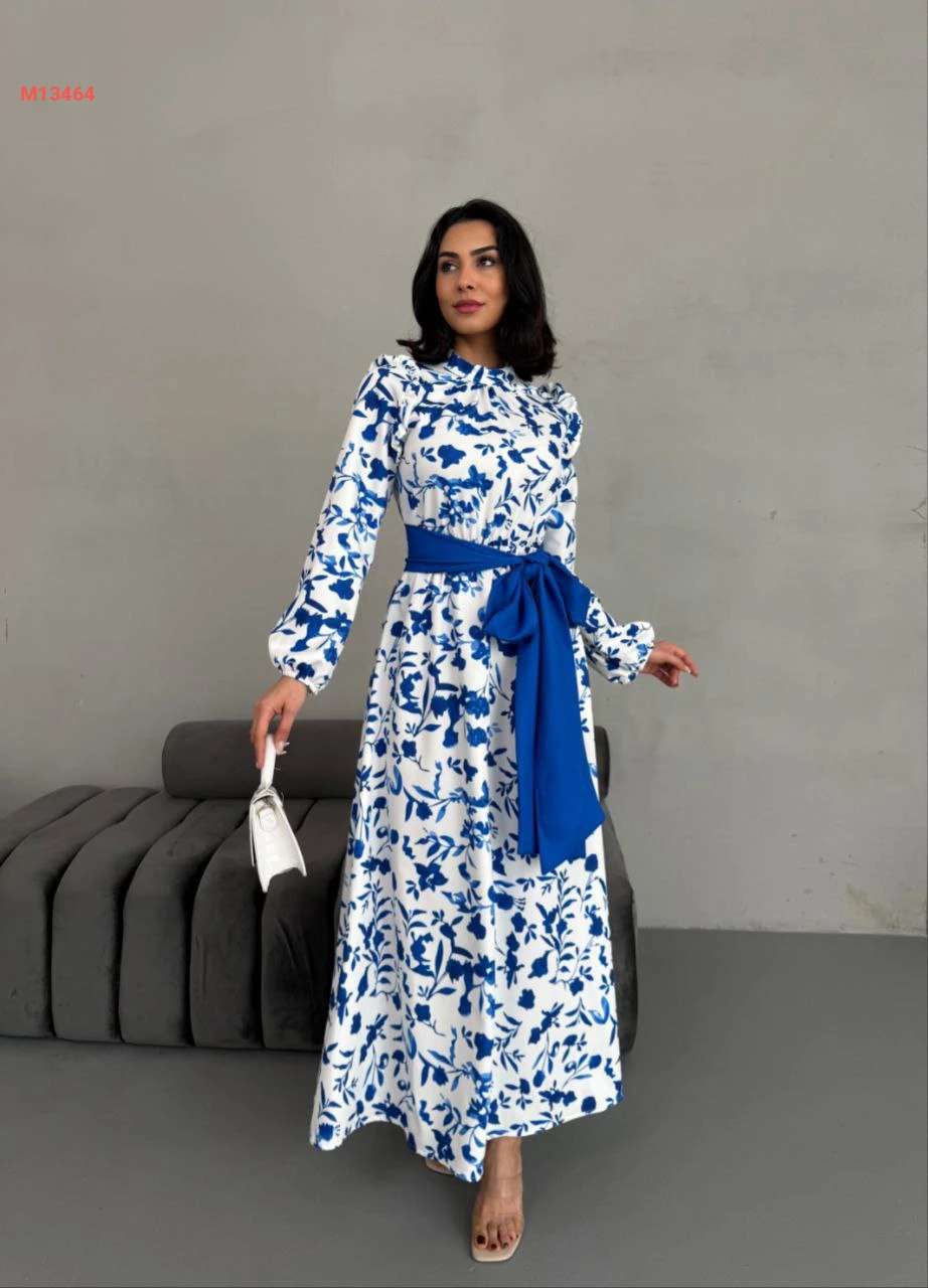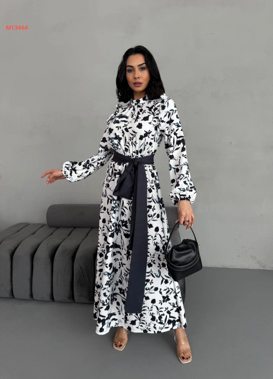 فستان طويل منقوش مع زنار