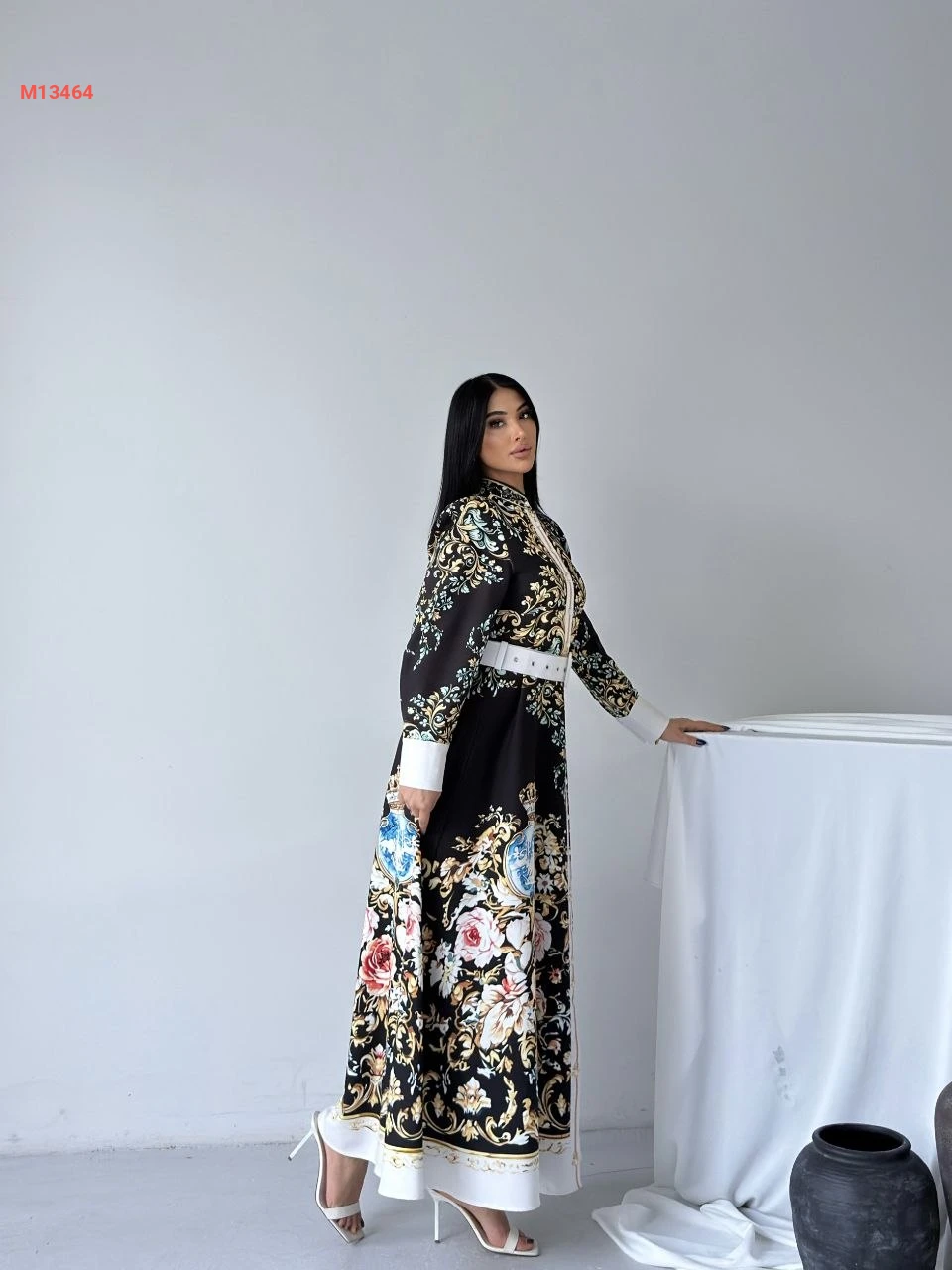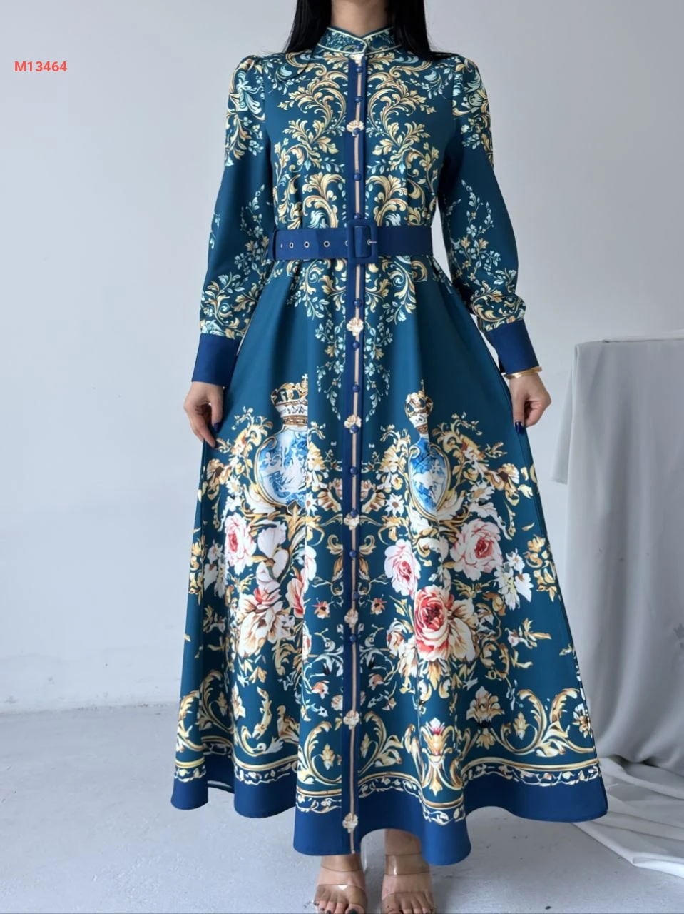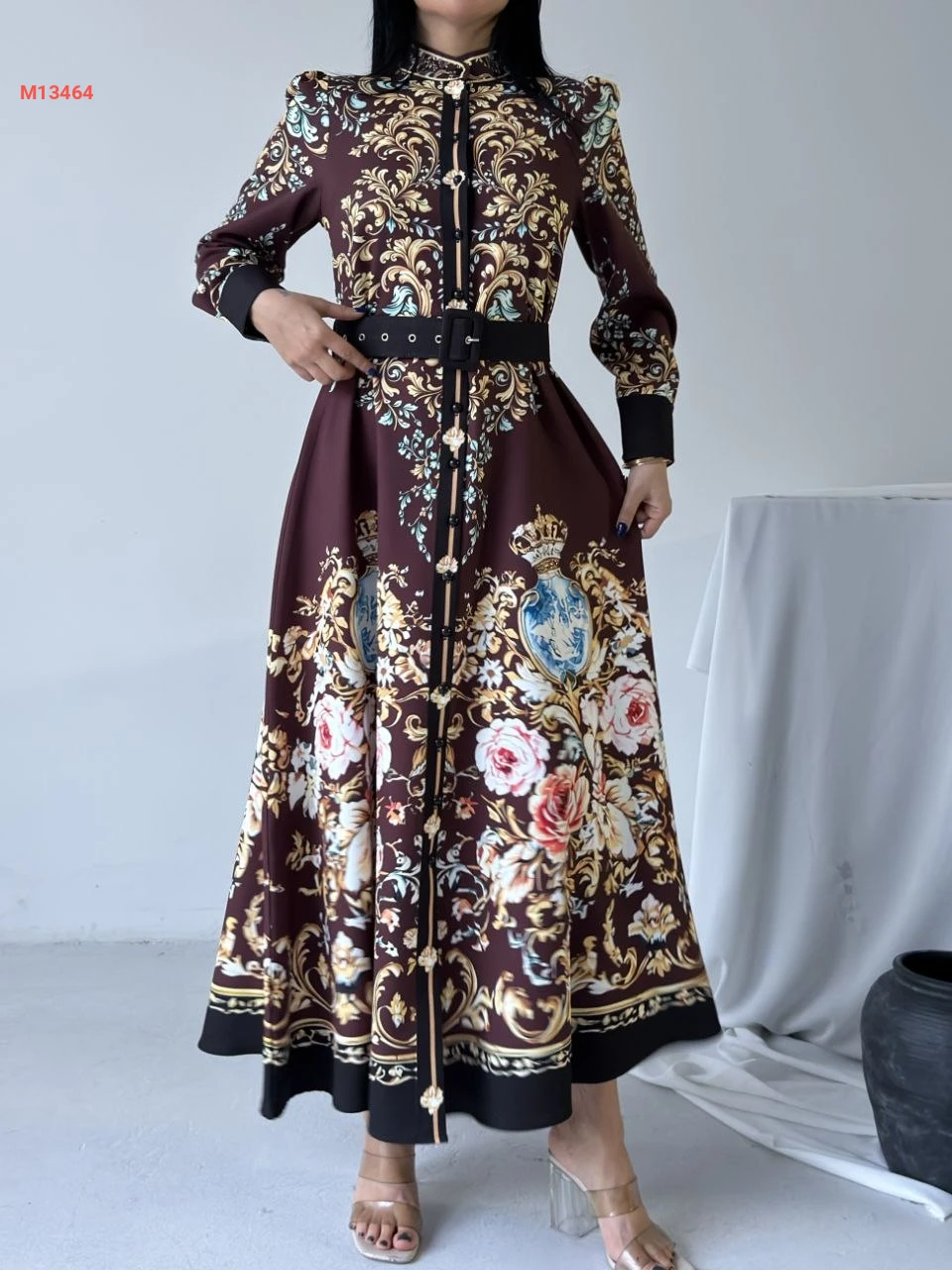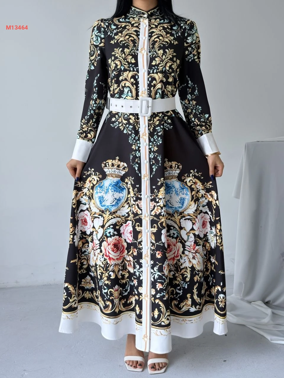 فستان طويل منقوش بأزرار