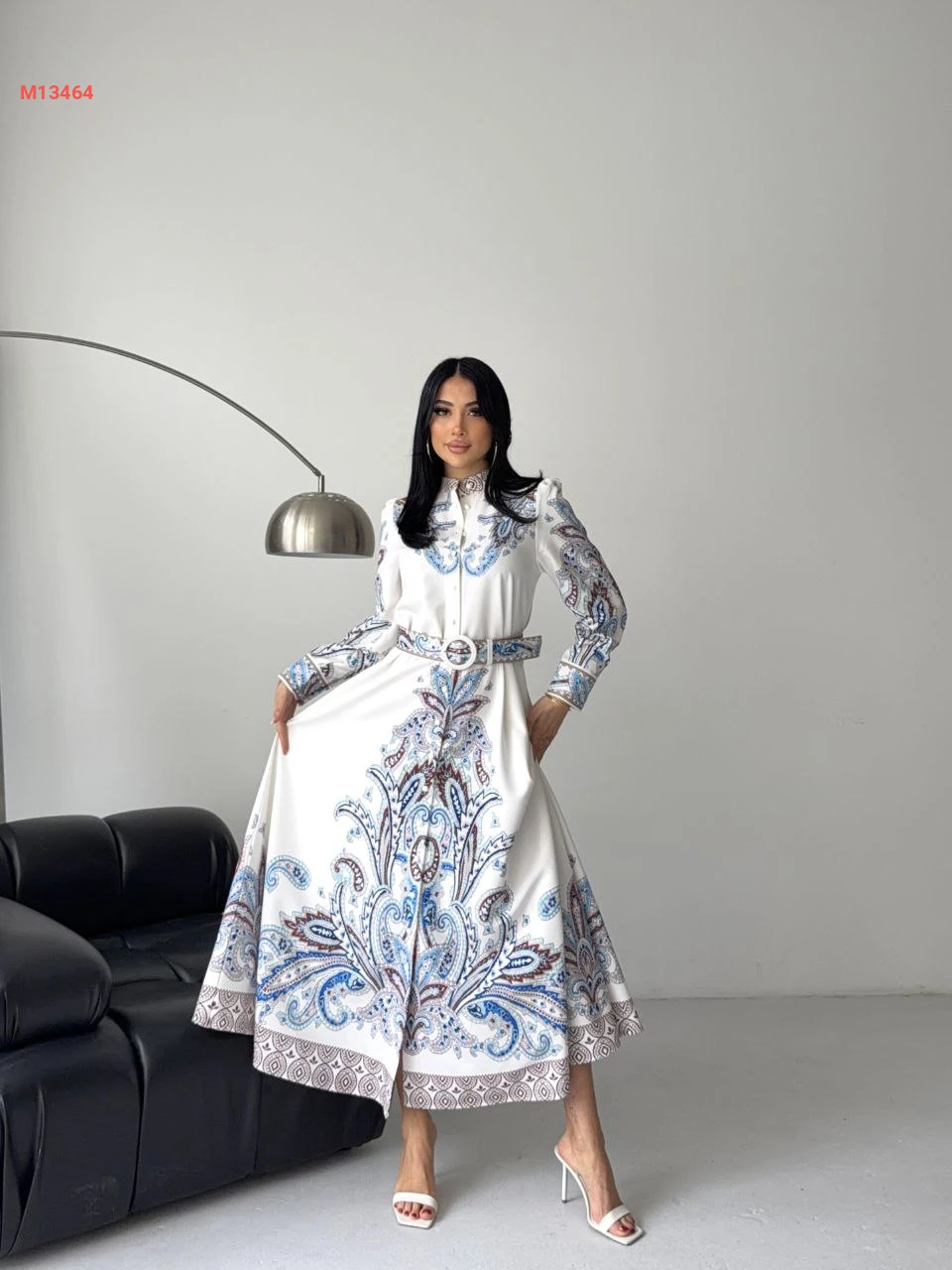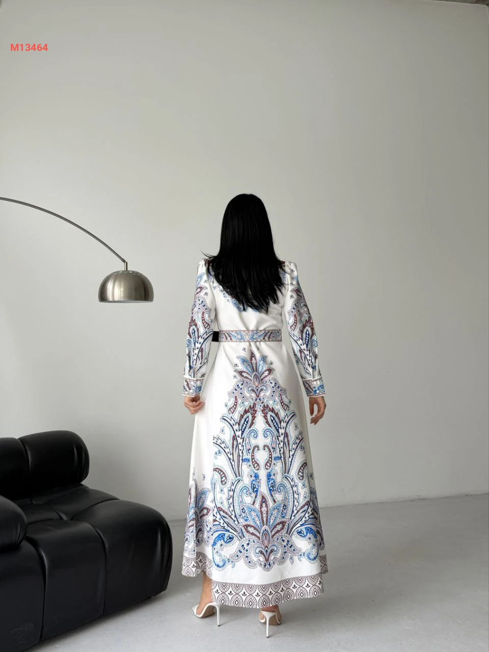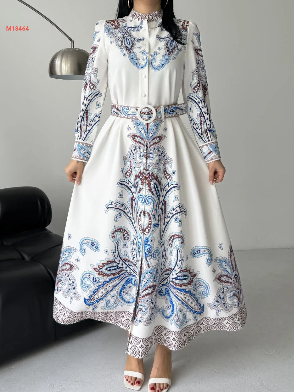 فستان طويل منقوش بأزرار وحزام