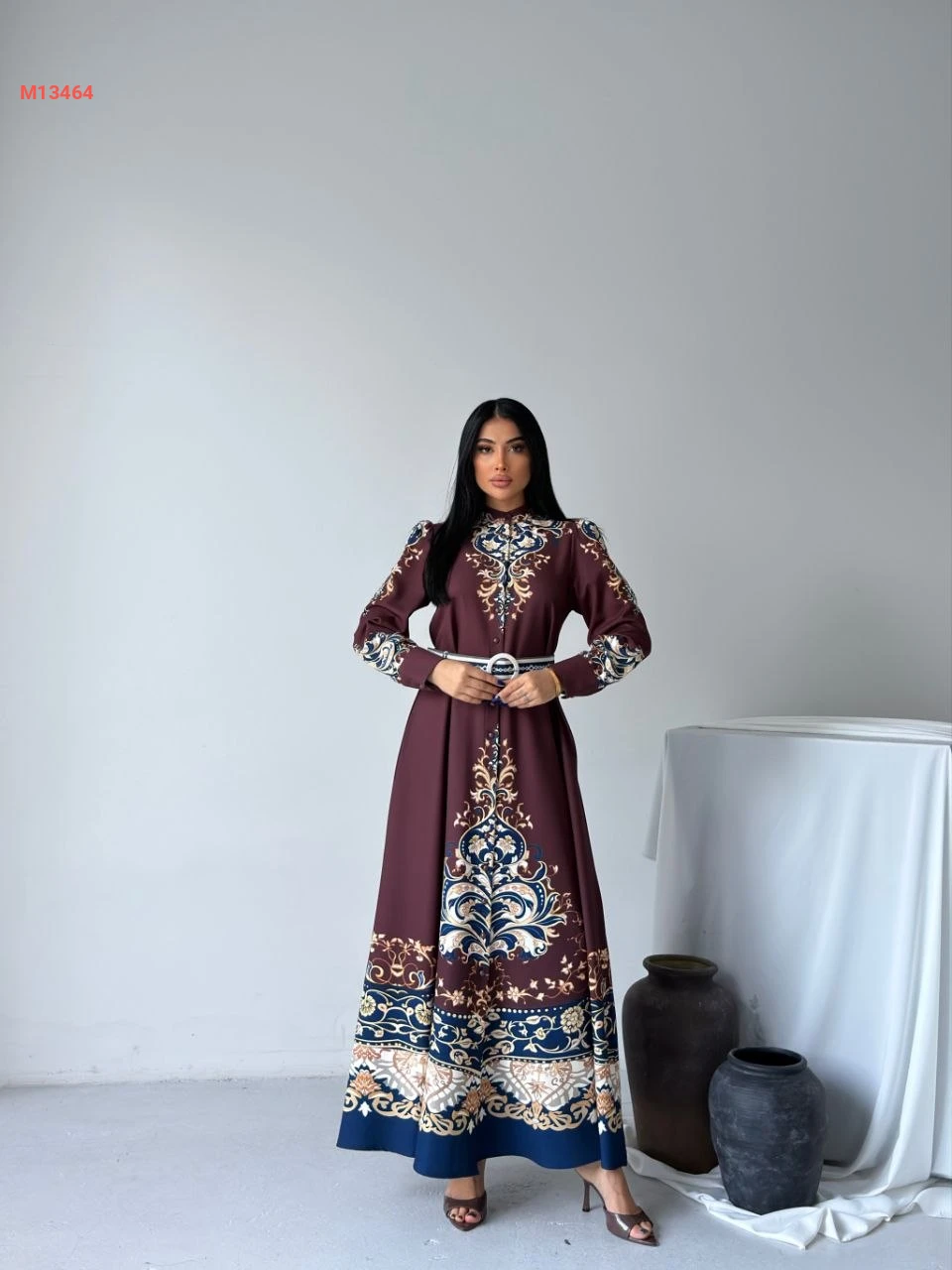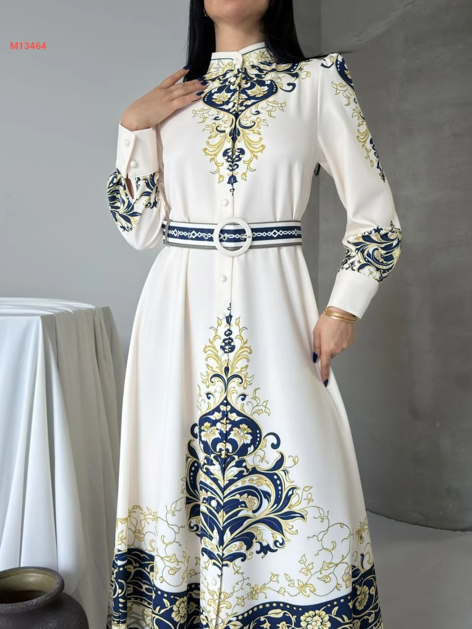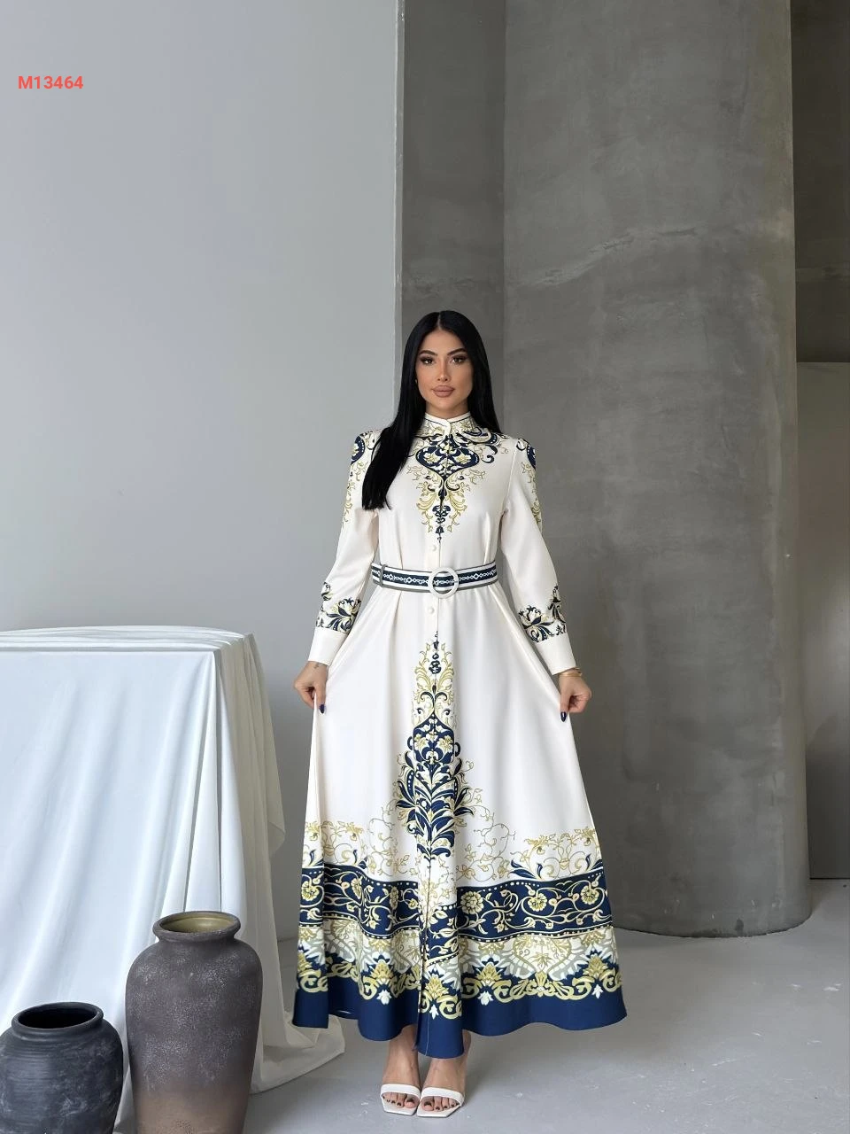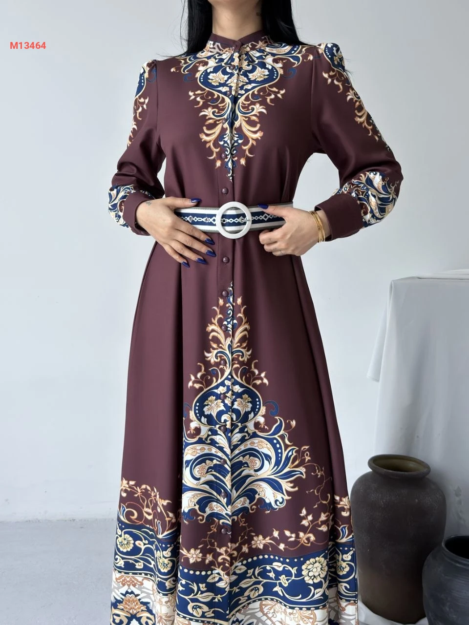 فستان طويل منقوش بأزرار