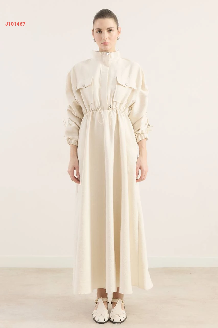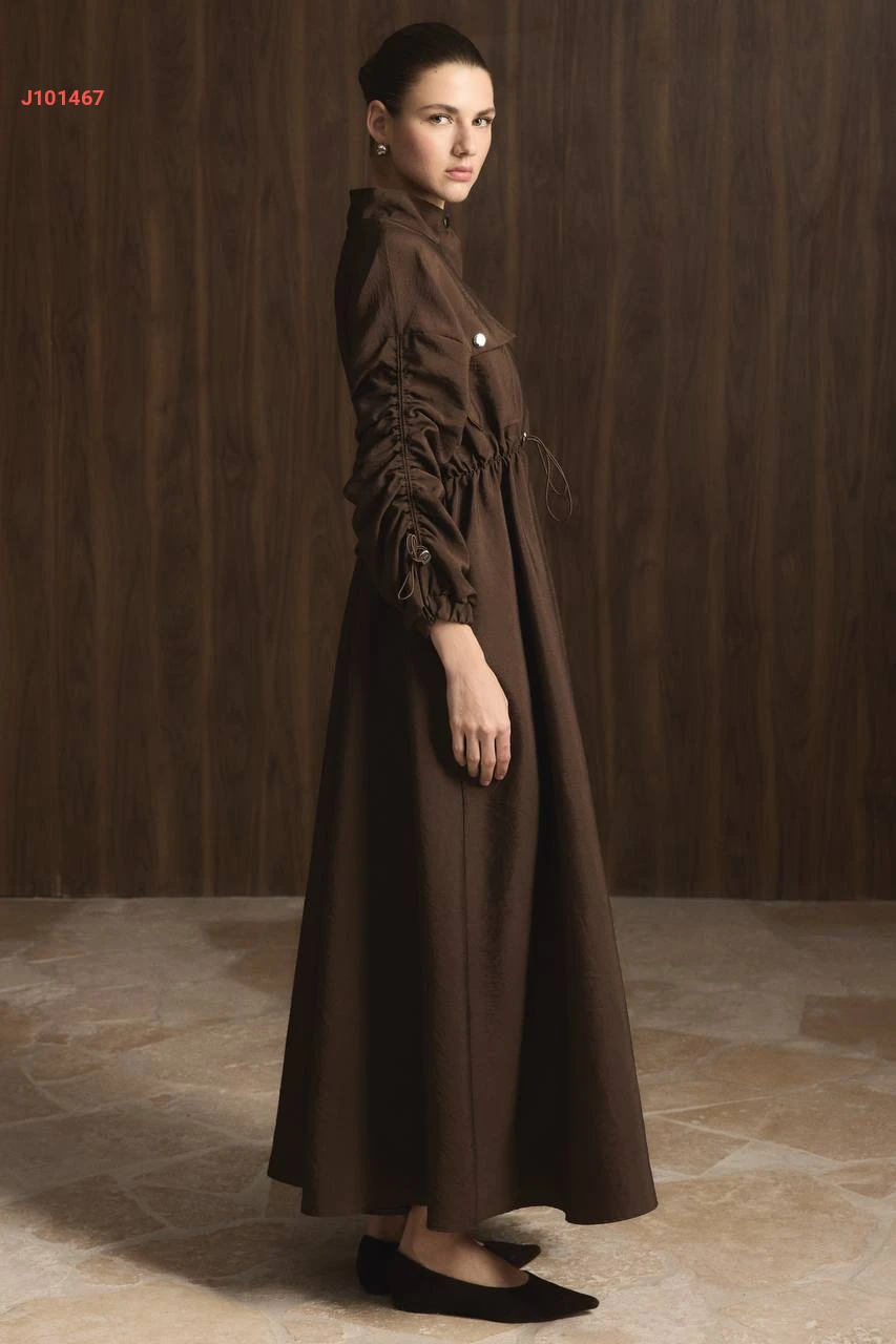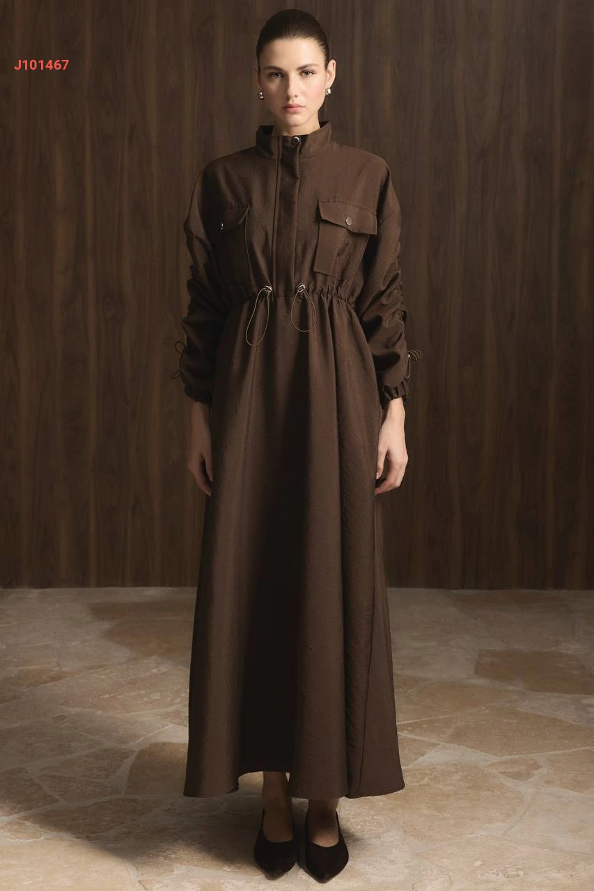 فستان طويل سادة بياقة مرتفعة مع زمة خصر وجيب