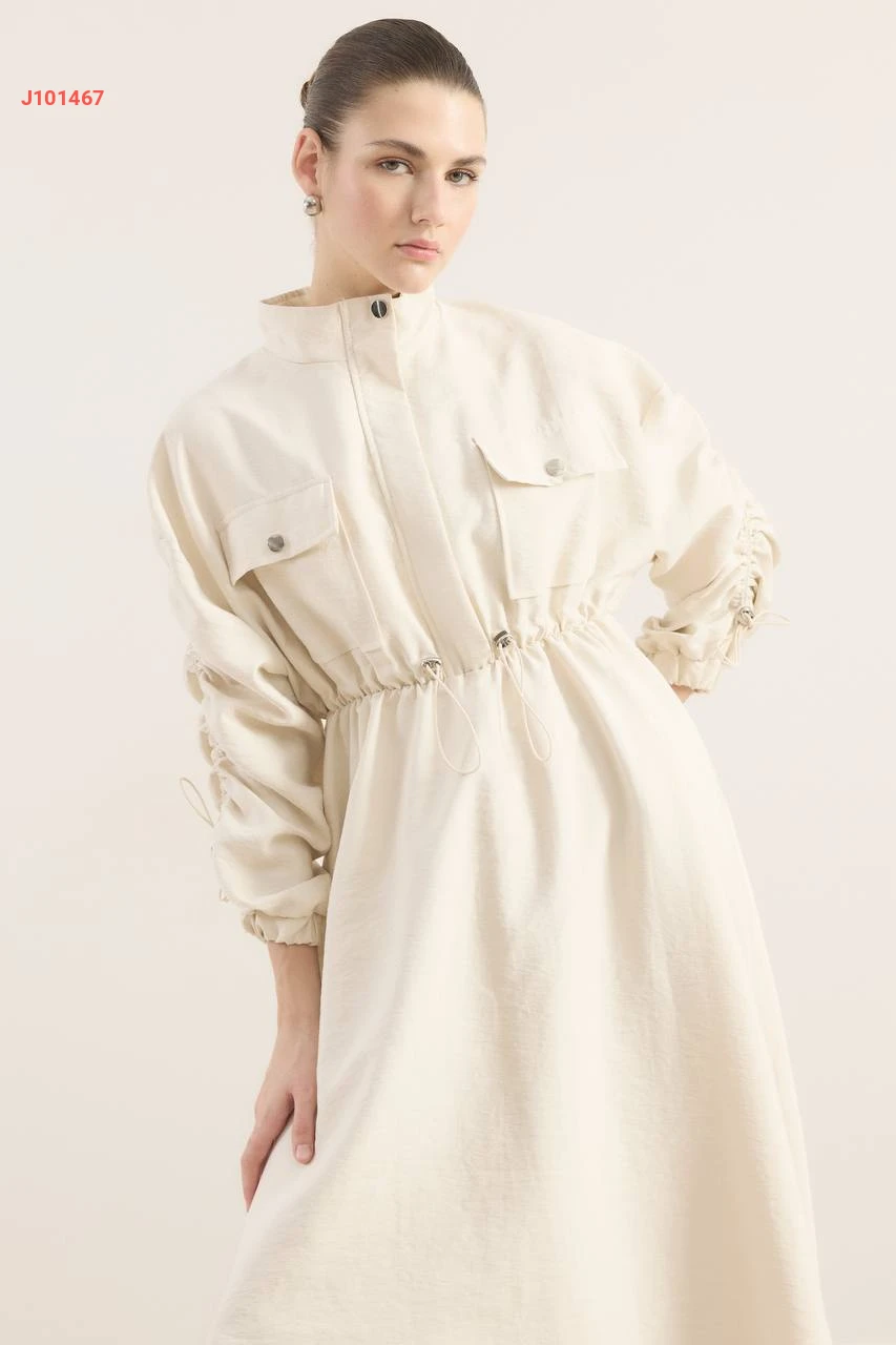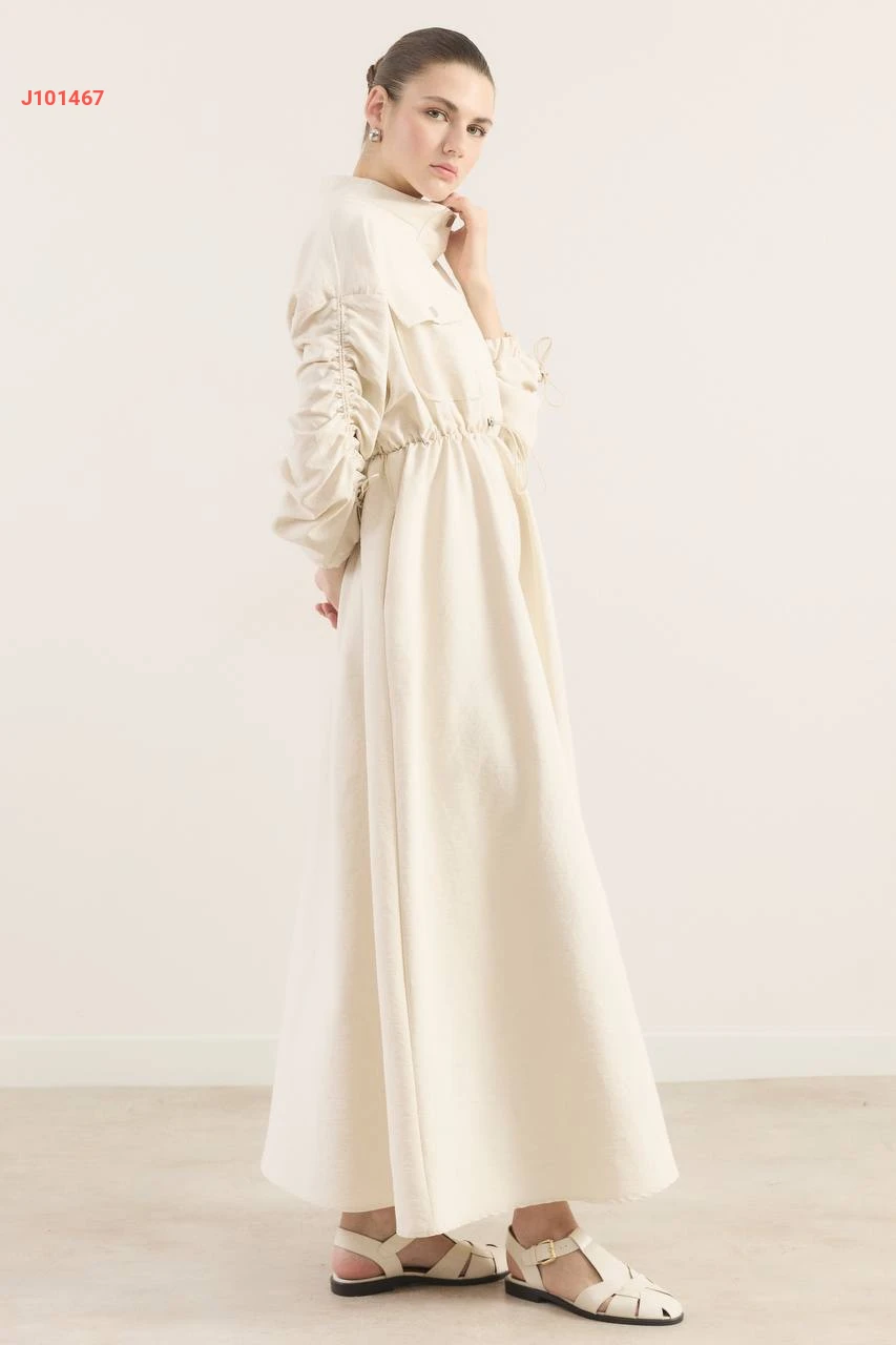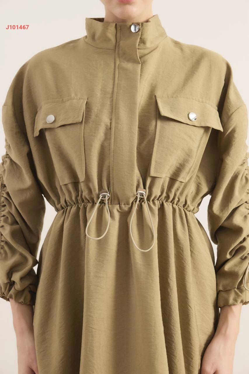 فستان طويل سادة بياقة مرتفعة مع زمة خصر وجيب
