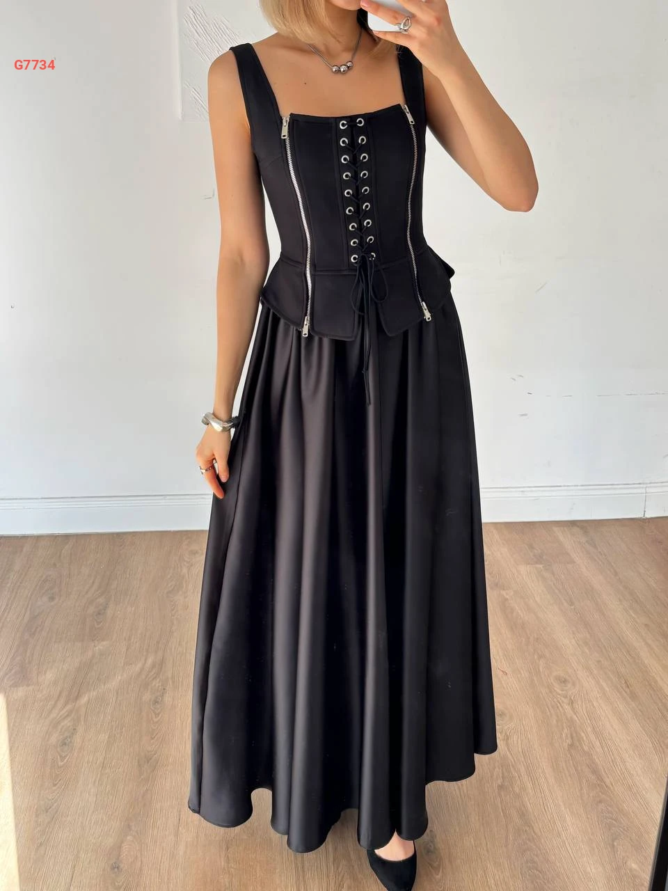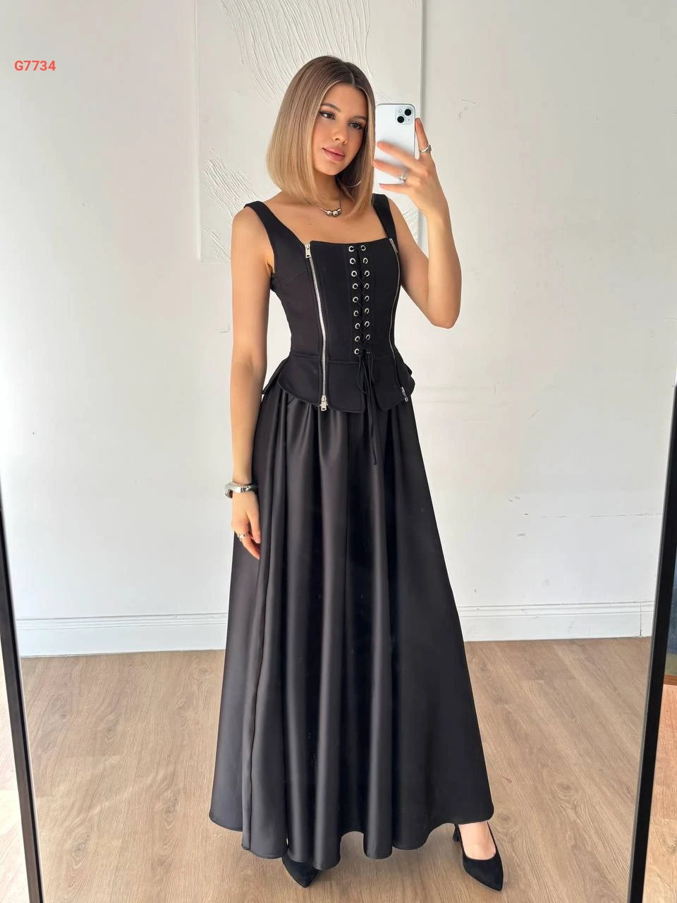 فستان طويل كلوش حفر بسحابات وربطات