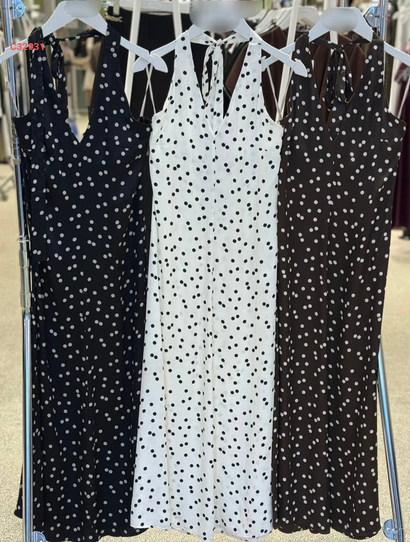 فستان طويل منقط بربطة خلفية عالرقبة