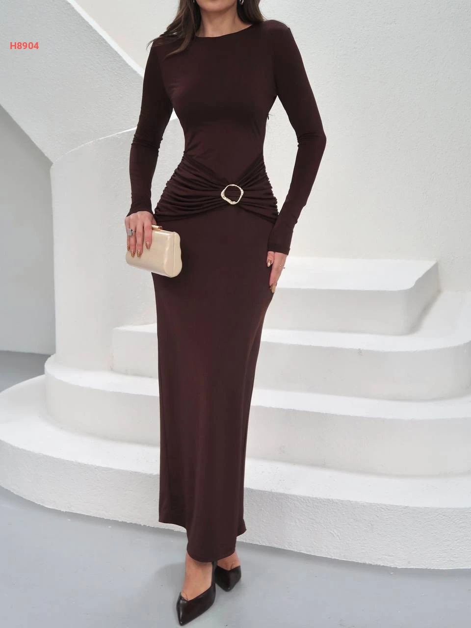 فستان ساندي طويل مجمع بإبزيم