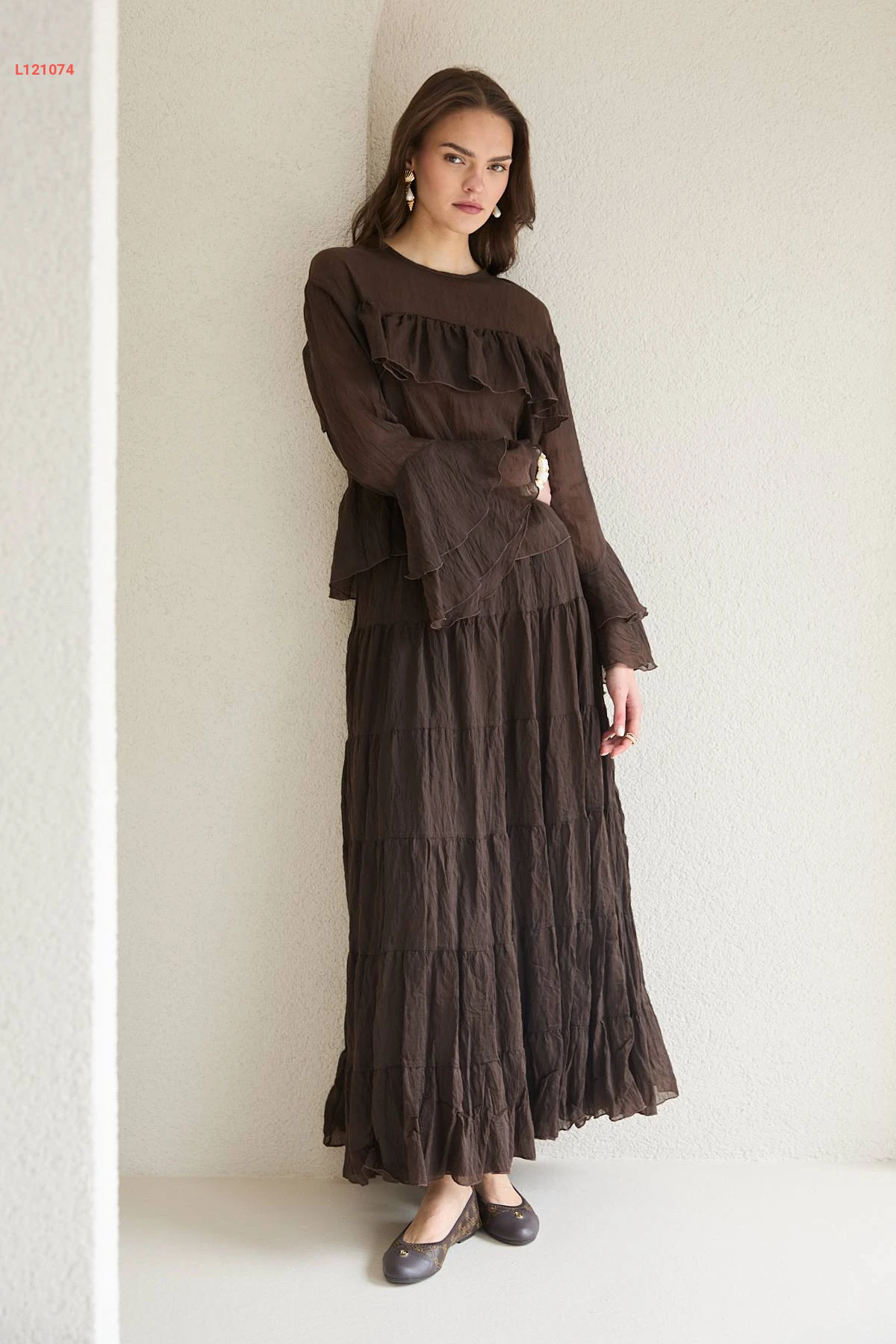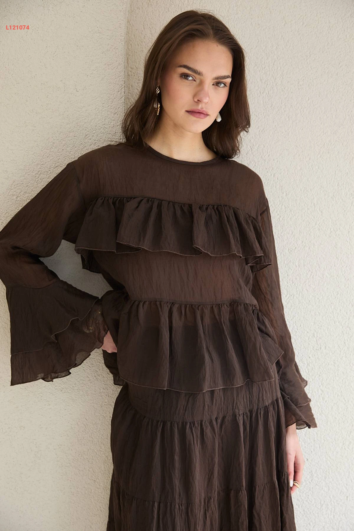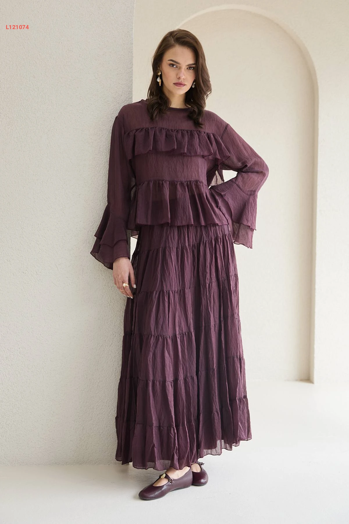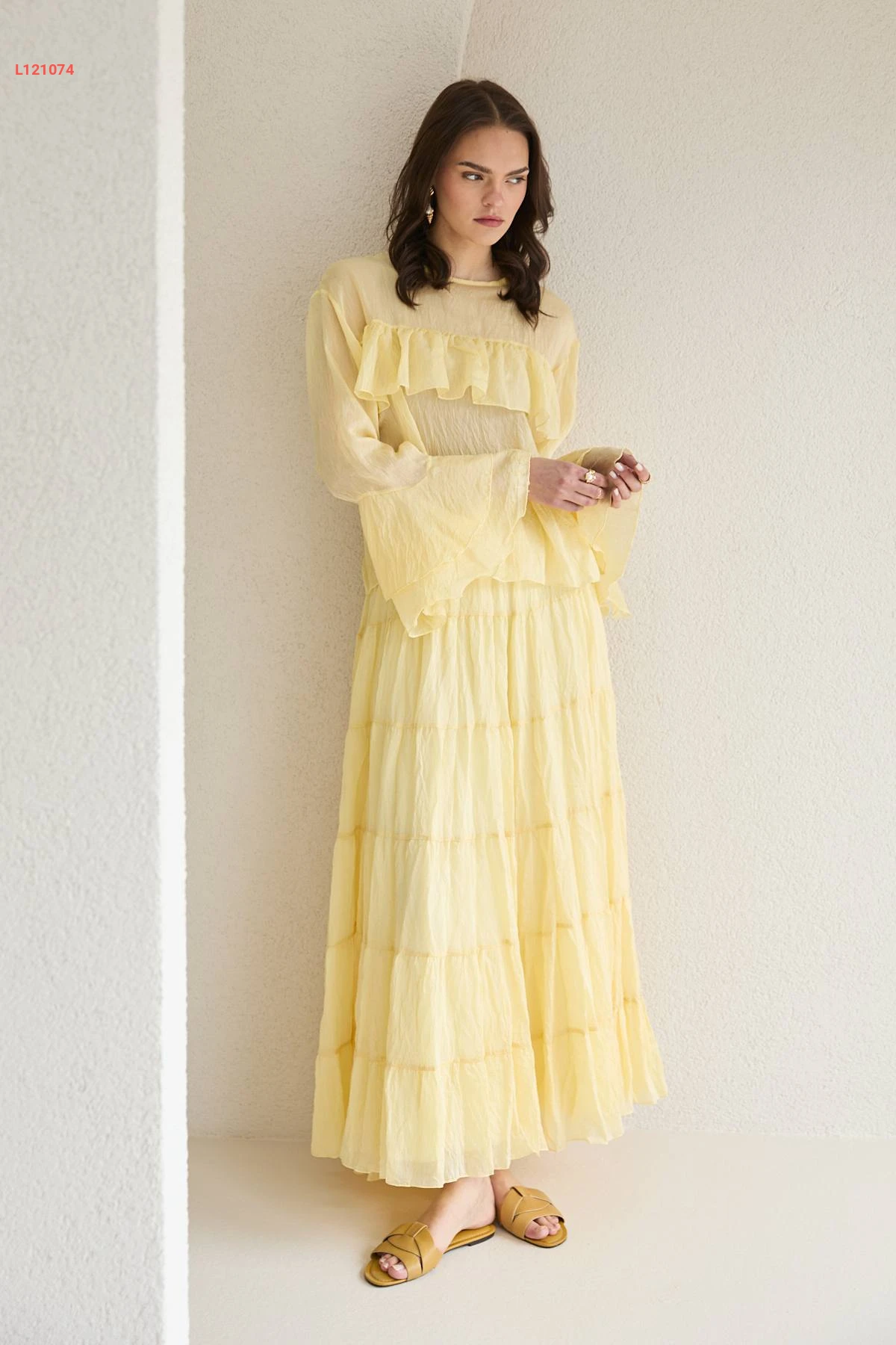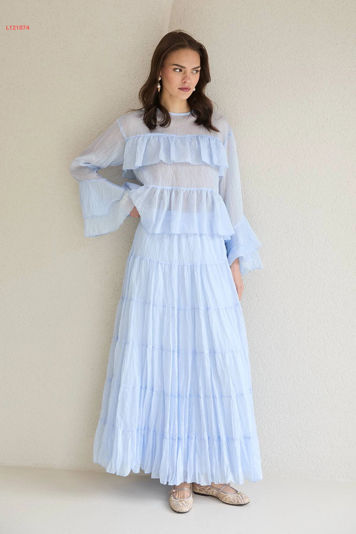 طقم تنورة طويل شفاف وبلوزة كشكش