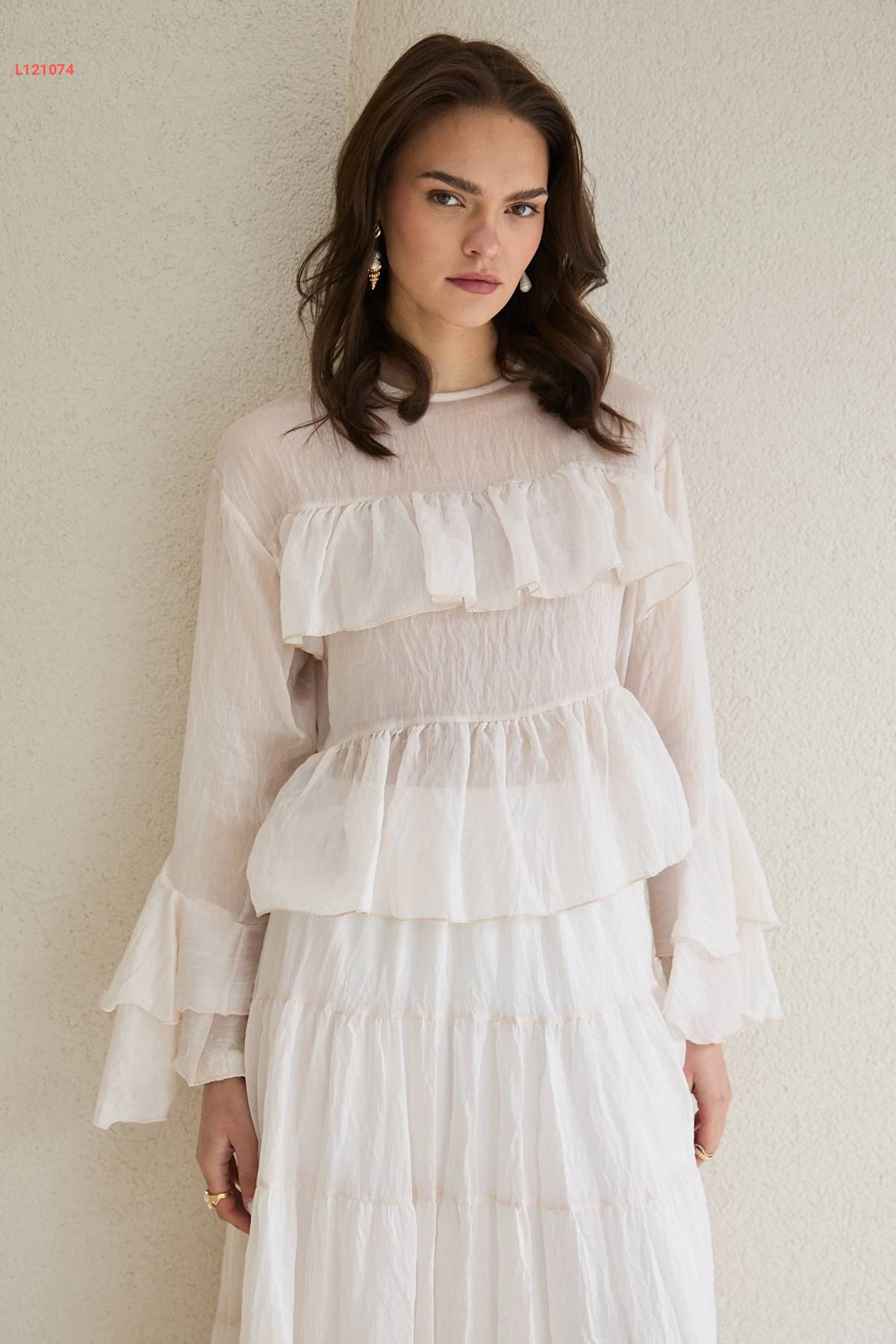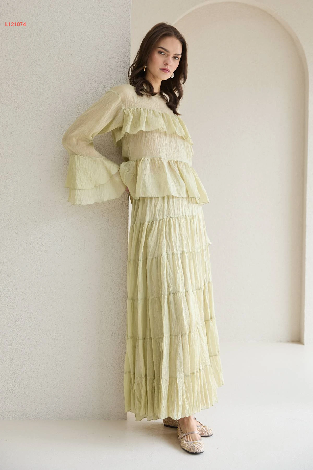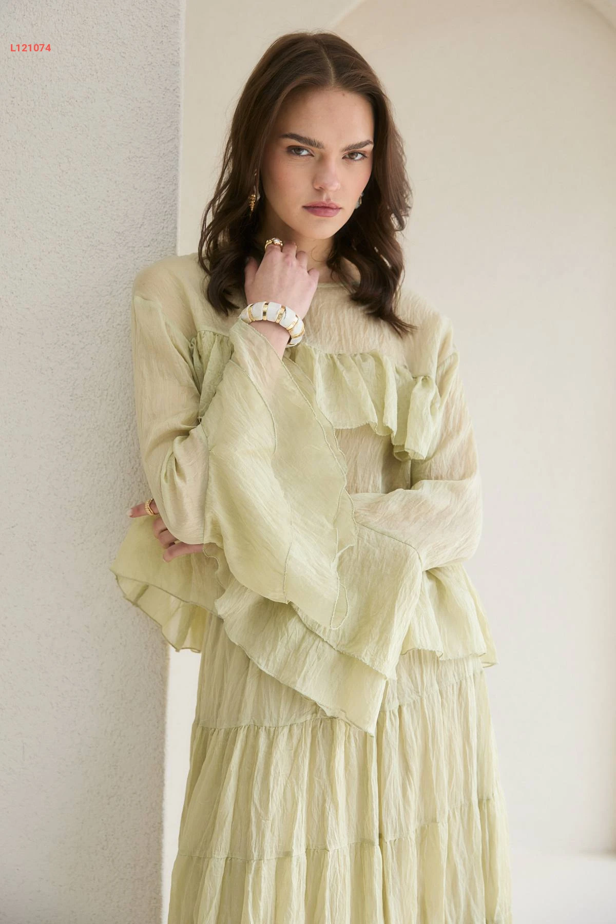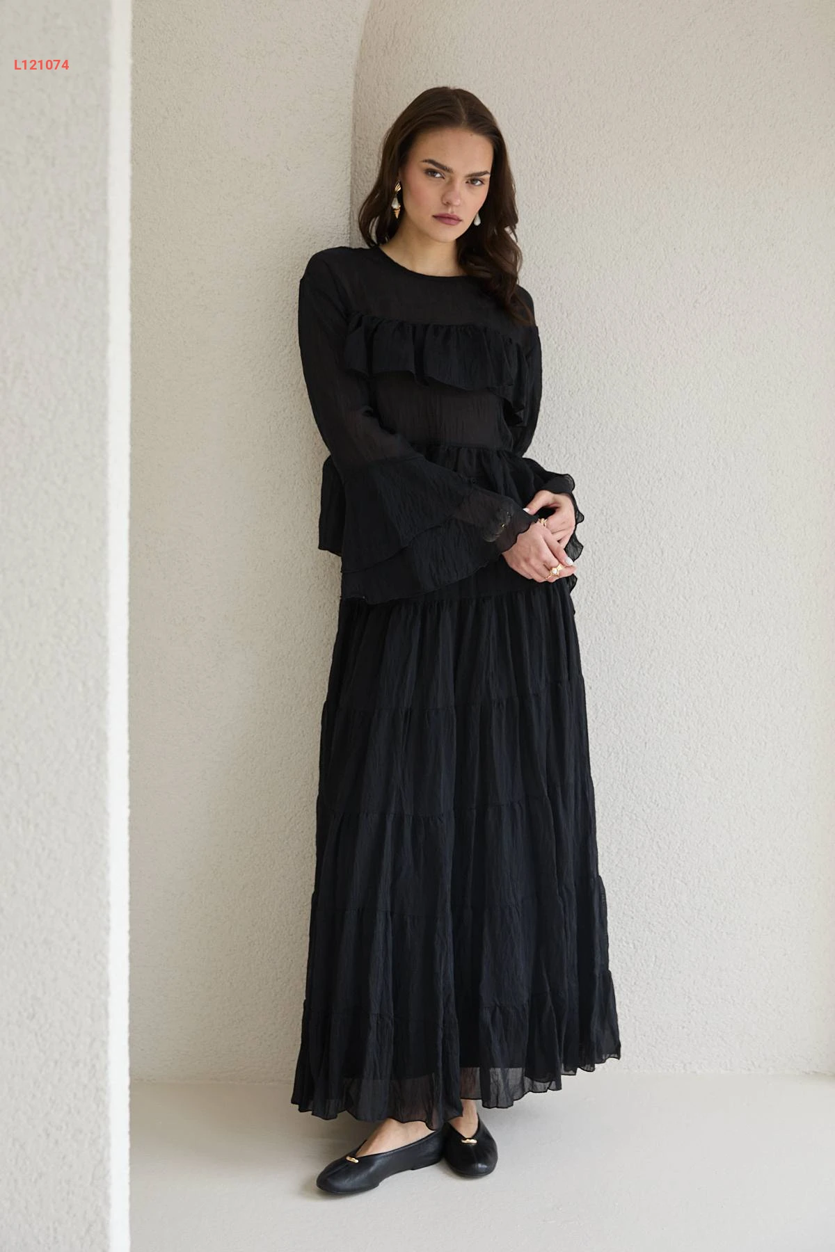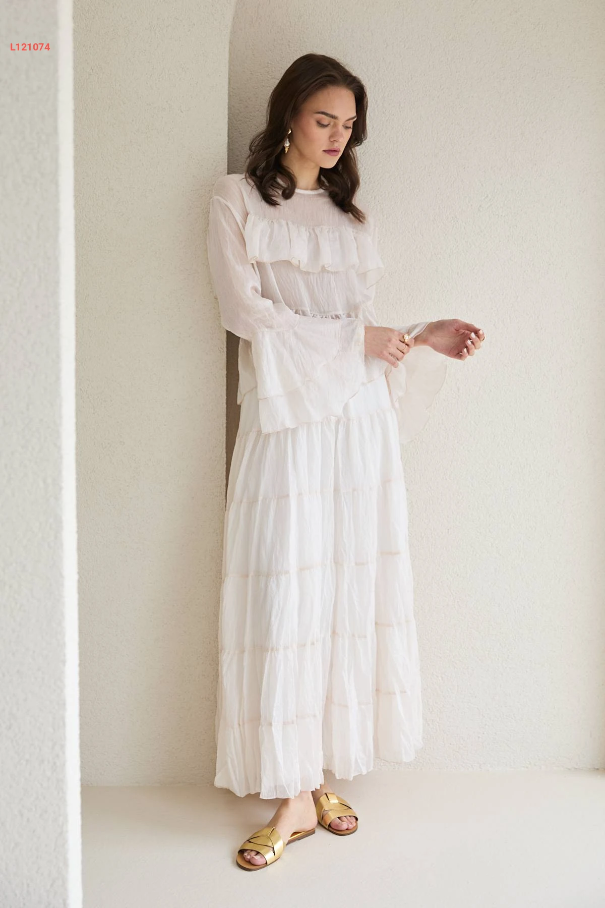 طقم تنورة طويل شفاف وبلوزة كشكش