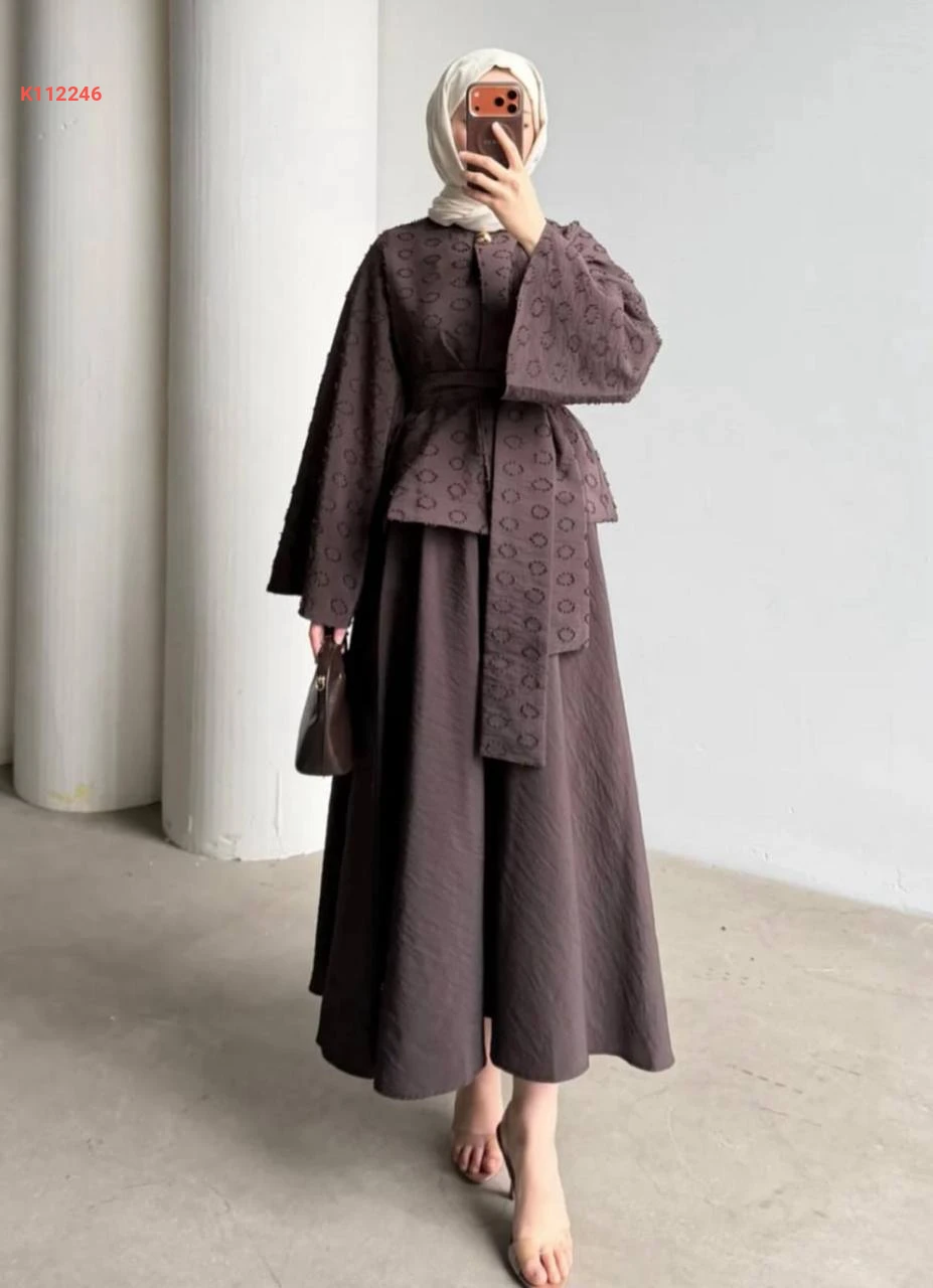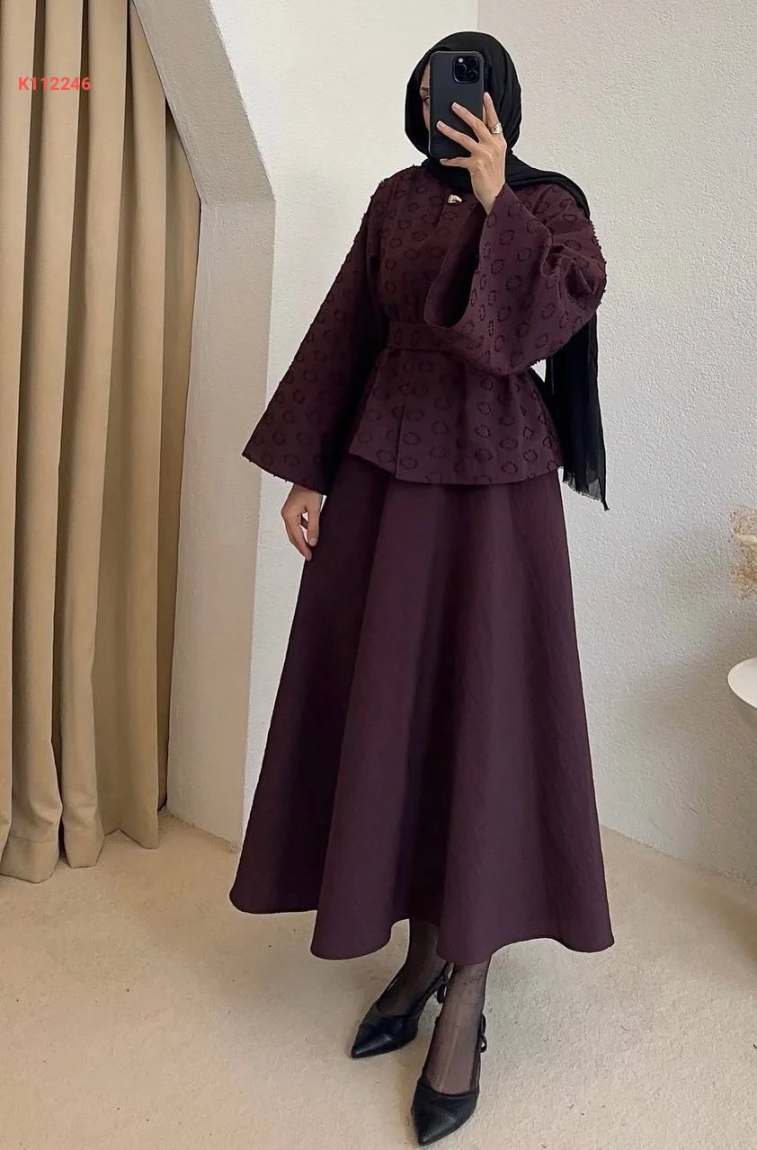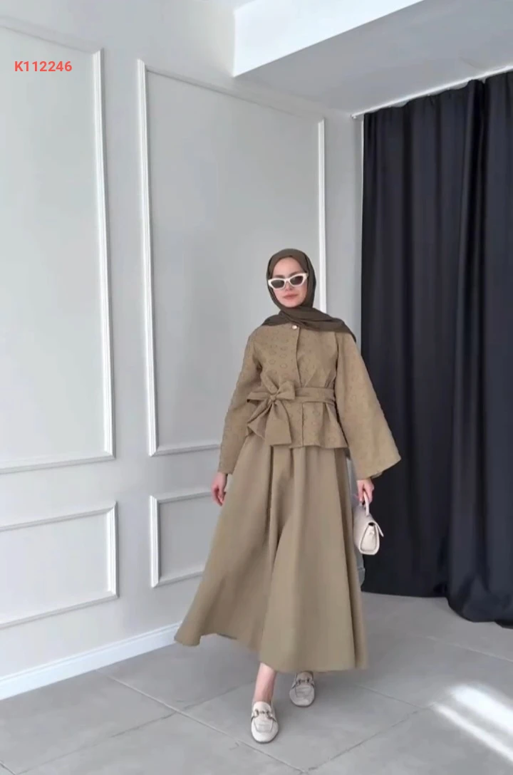 طقم تنورة طويل وجاكيت بزنار ربط