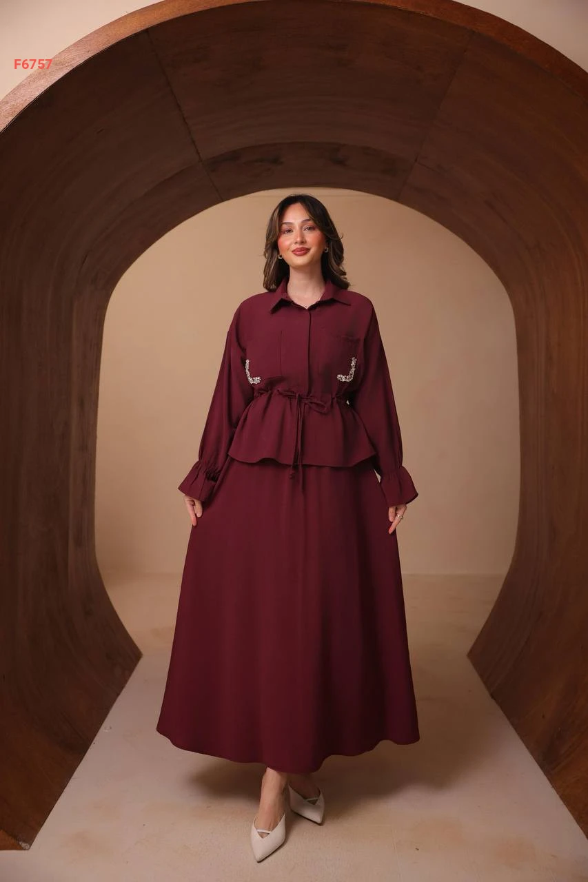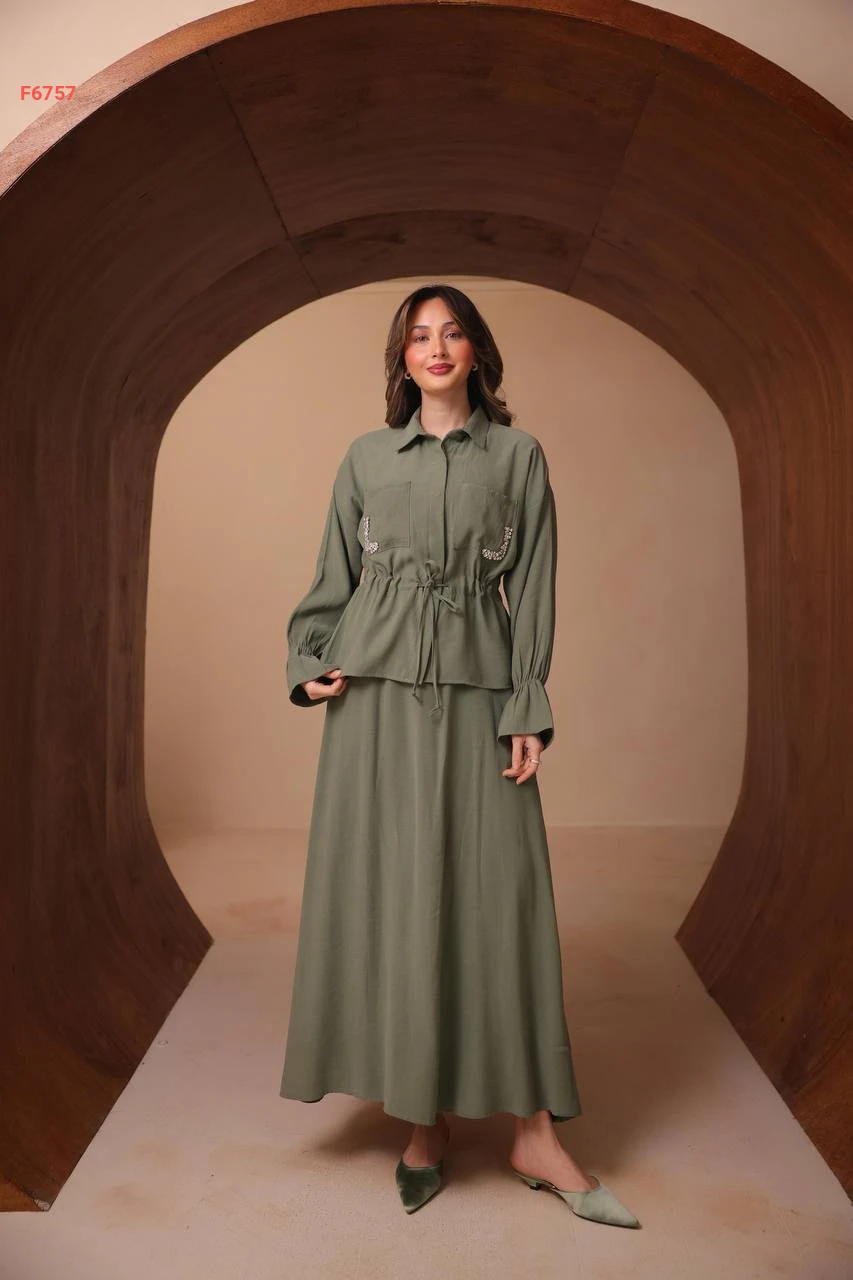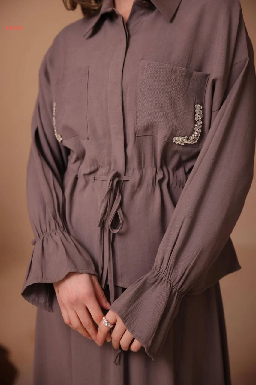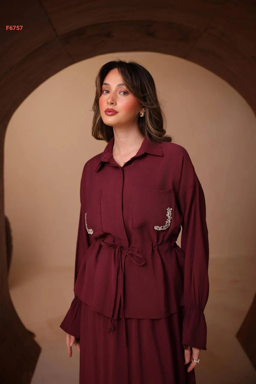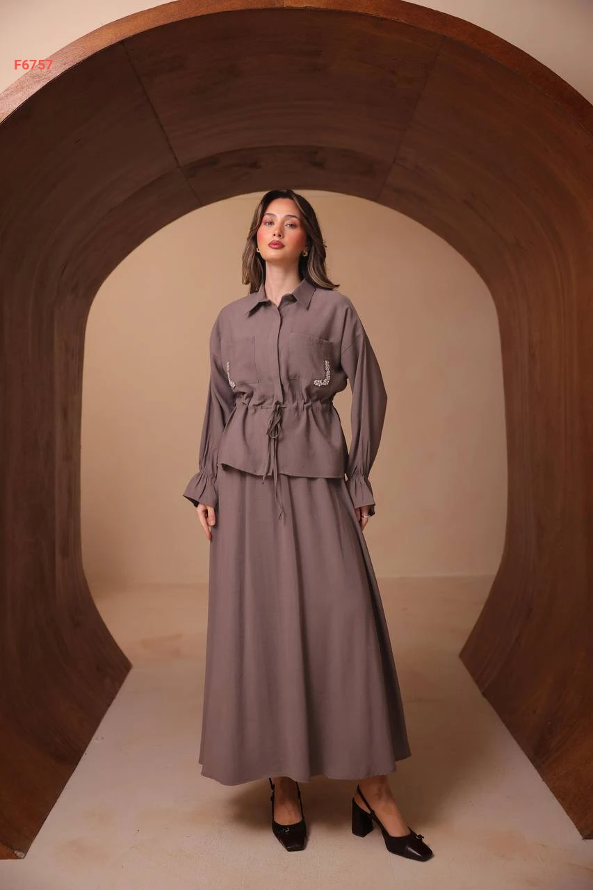 طقم تنورة طويل وقميص بجيوب مطرزة