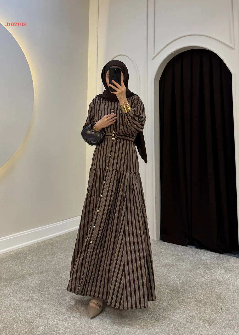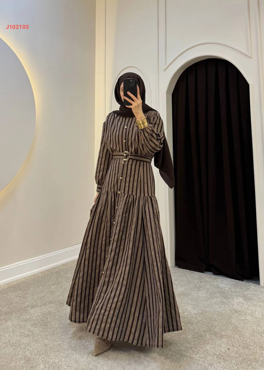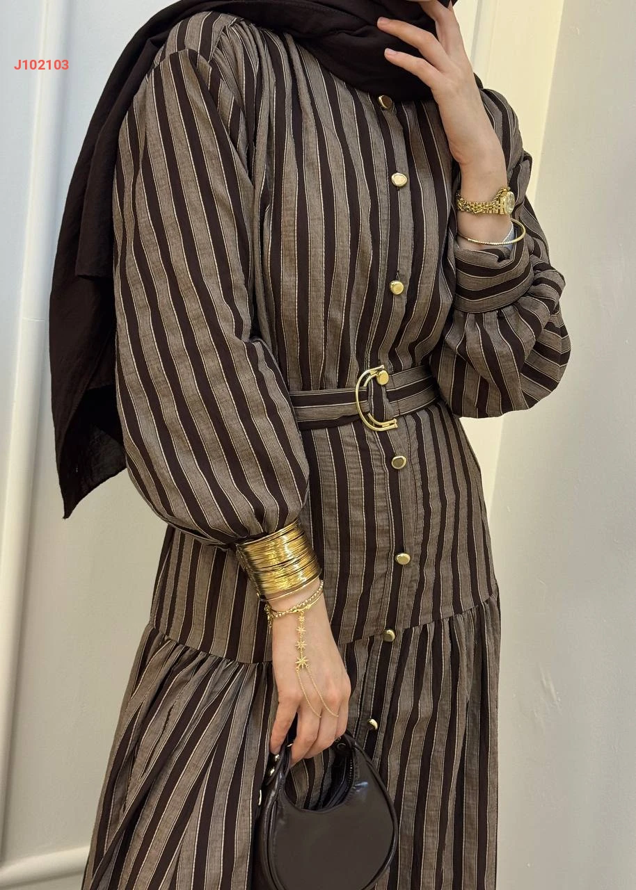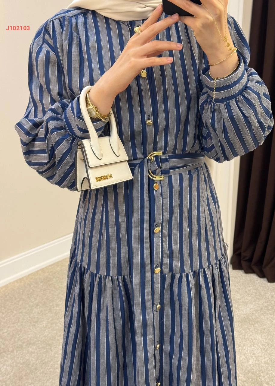 فستان طويل بأزرار مخطط مع حزام
