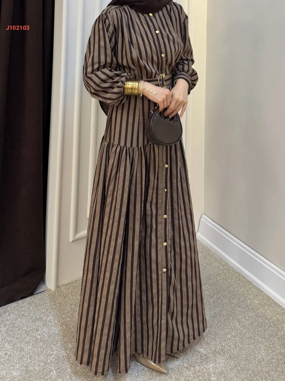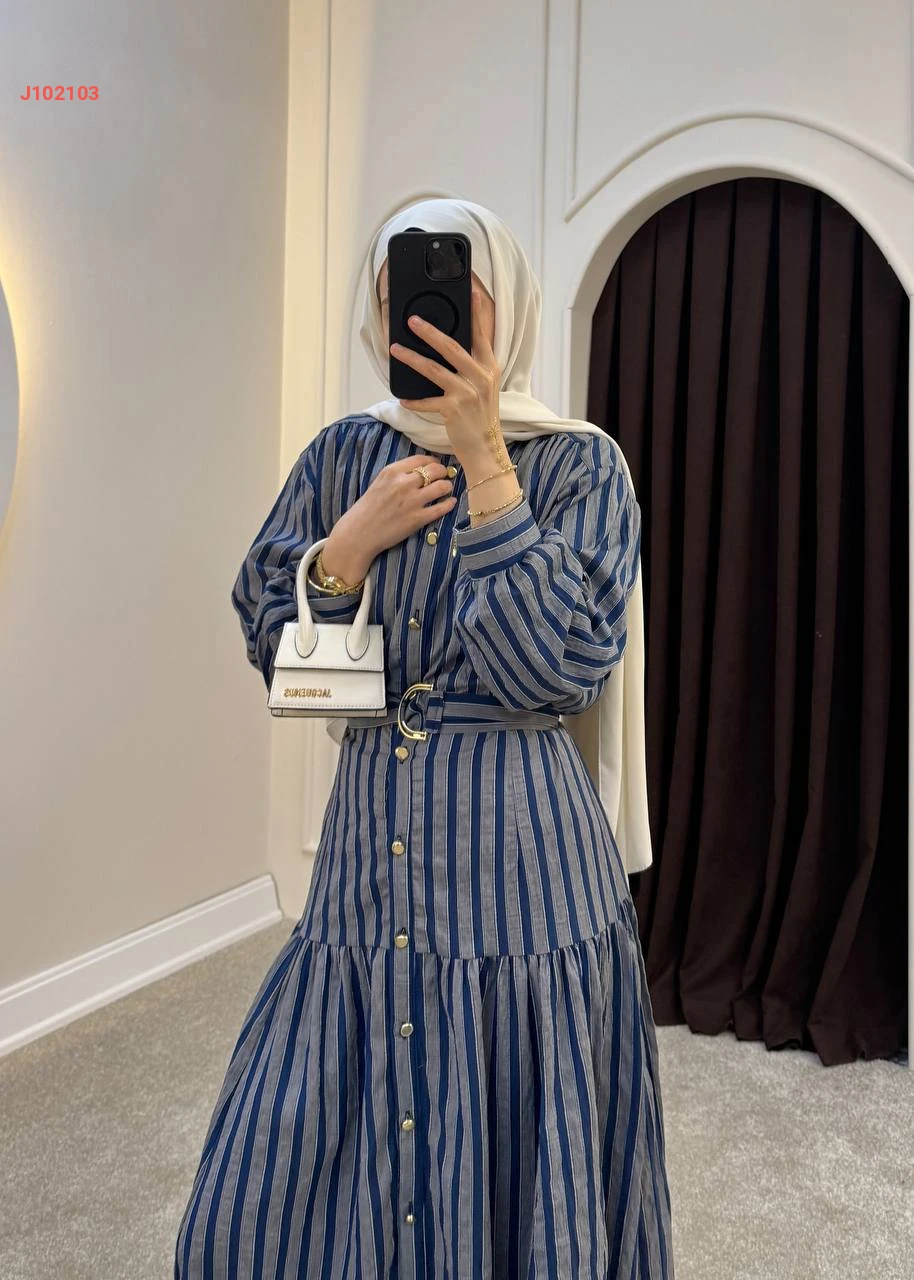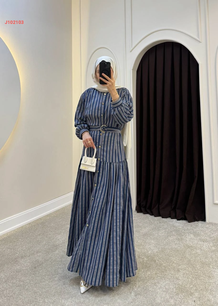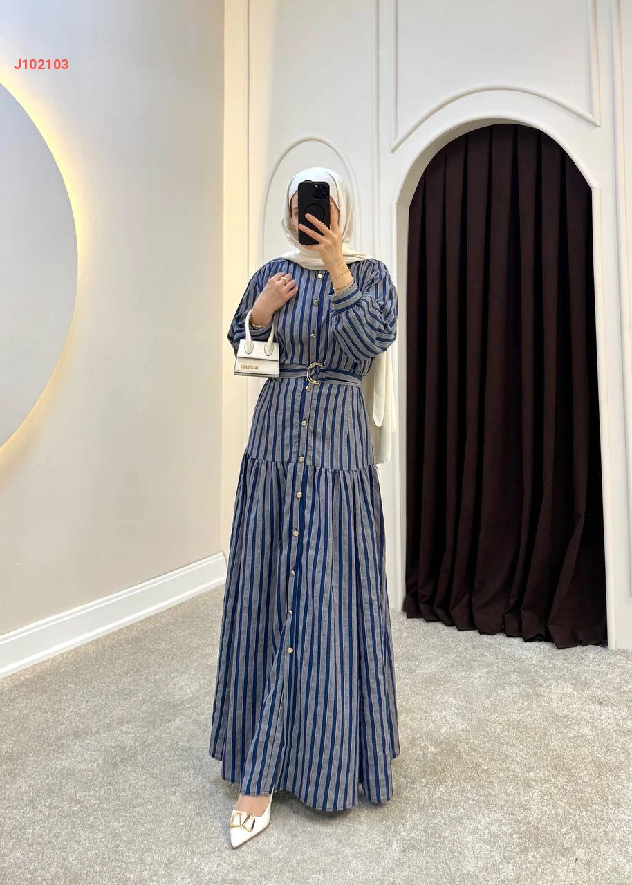فستان طويل بأزرار مخطط مع حزام