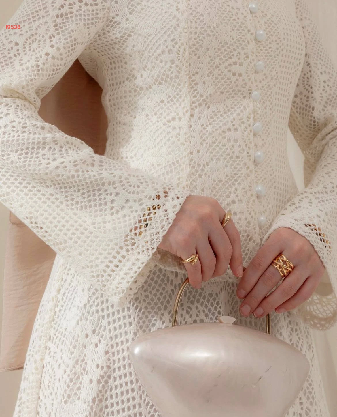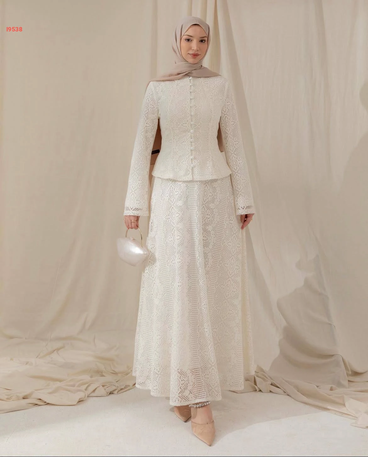 طقم "دانتيل" أبيض فاخر يتكون من جاكيت قصير بأزرار لؤلؤية وتنورة واسعة