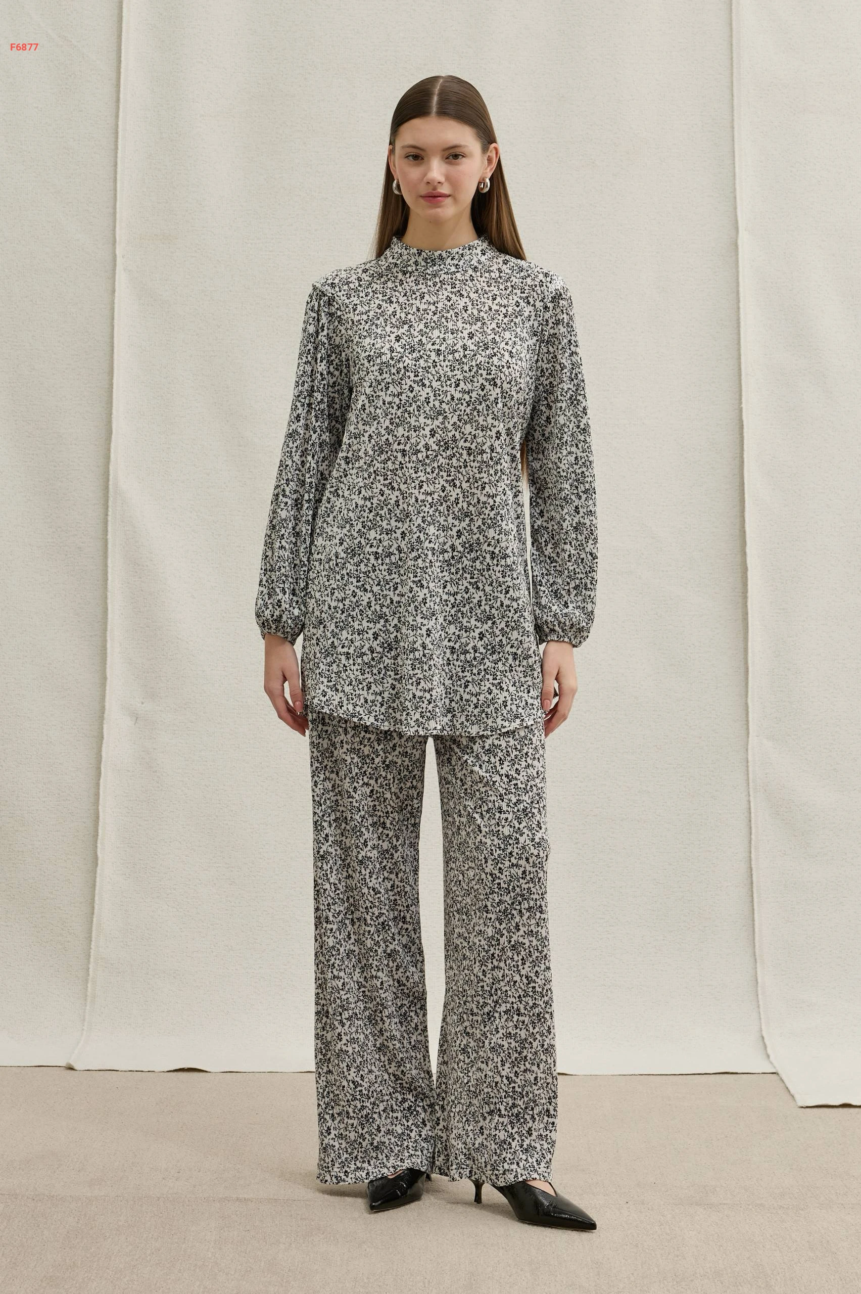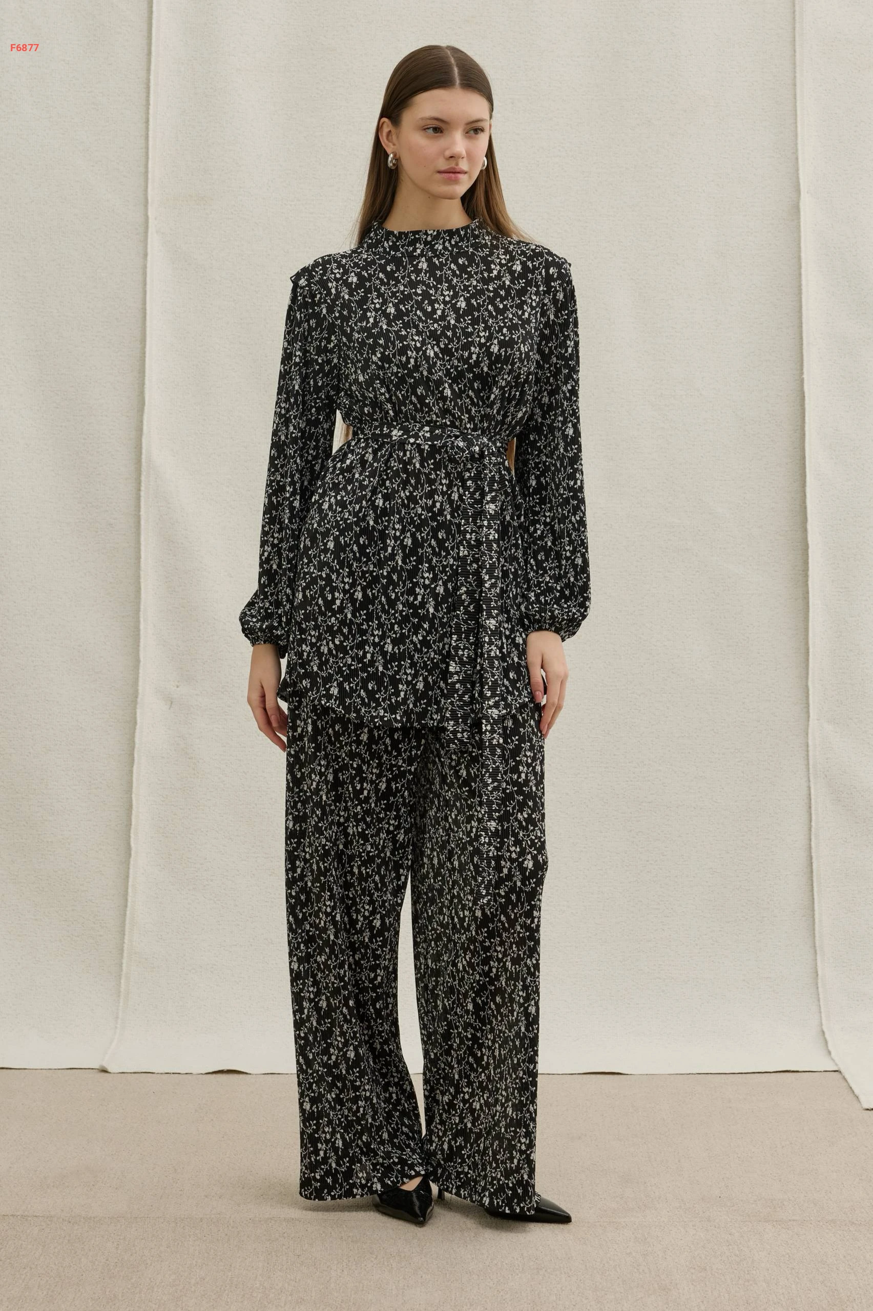 طقم عصري ومريح بنقشة زهور دقيقة، يتألف من بلوزة طويلة بحزام خصر وبنطال واسع