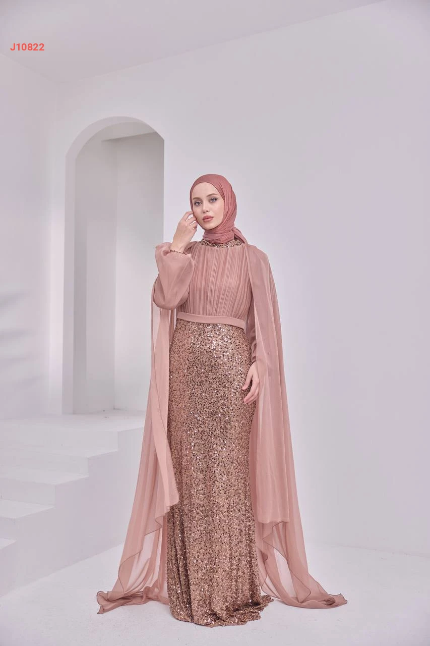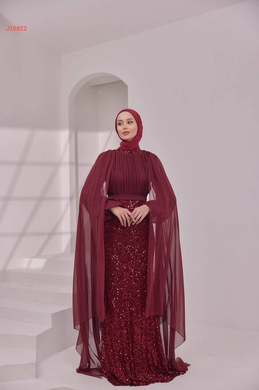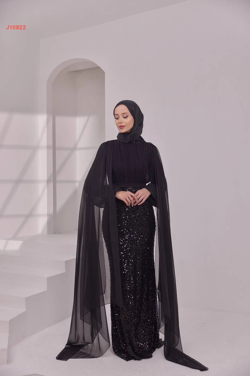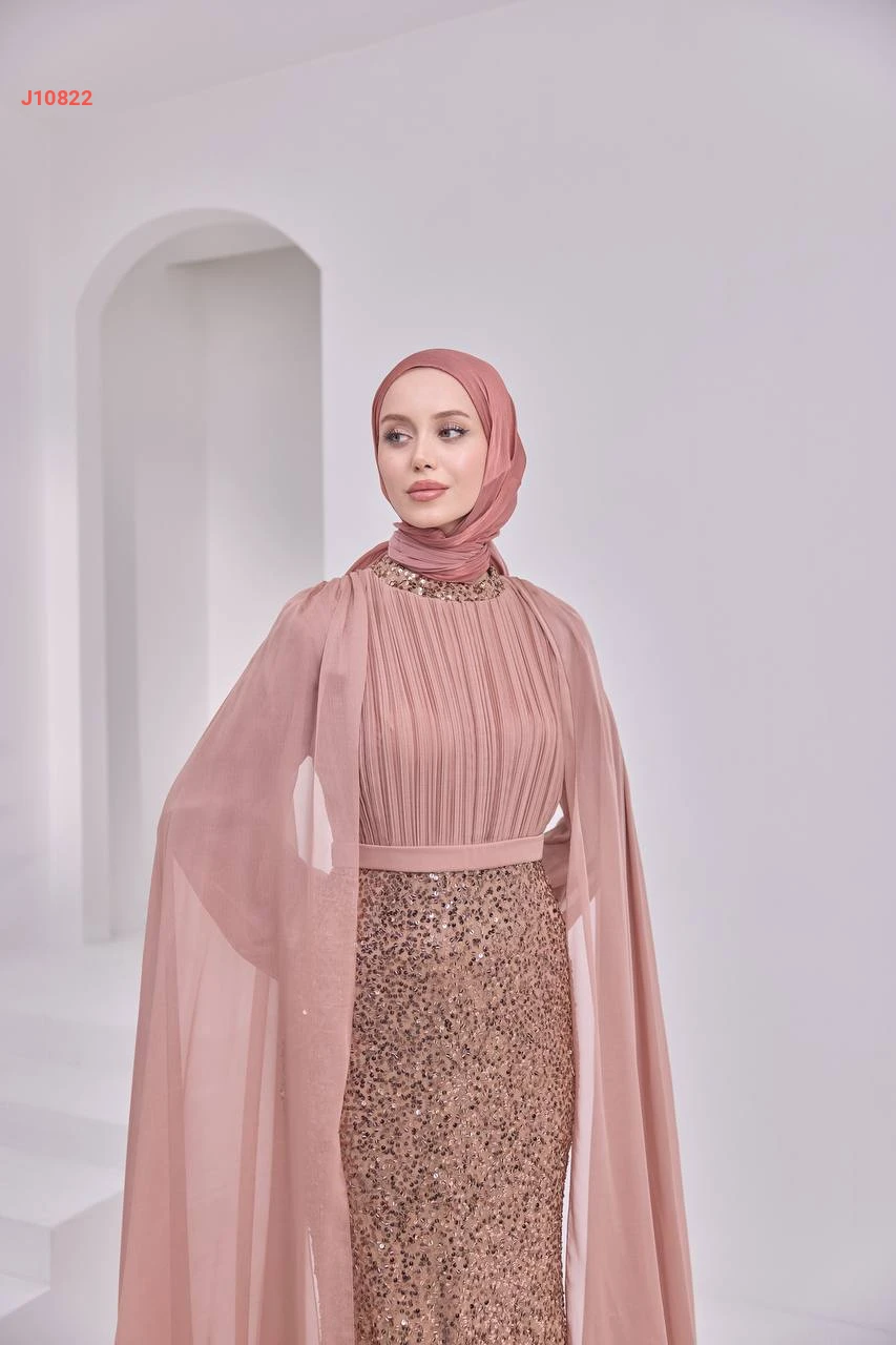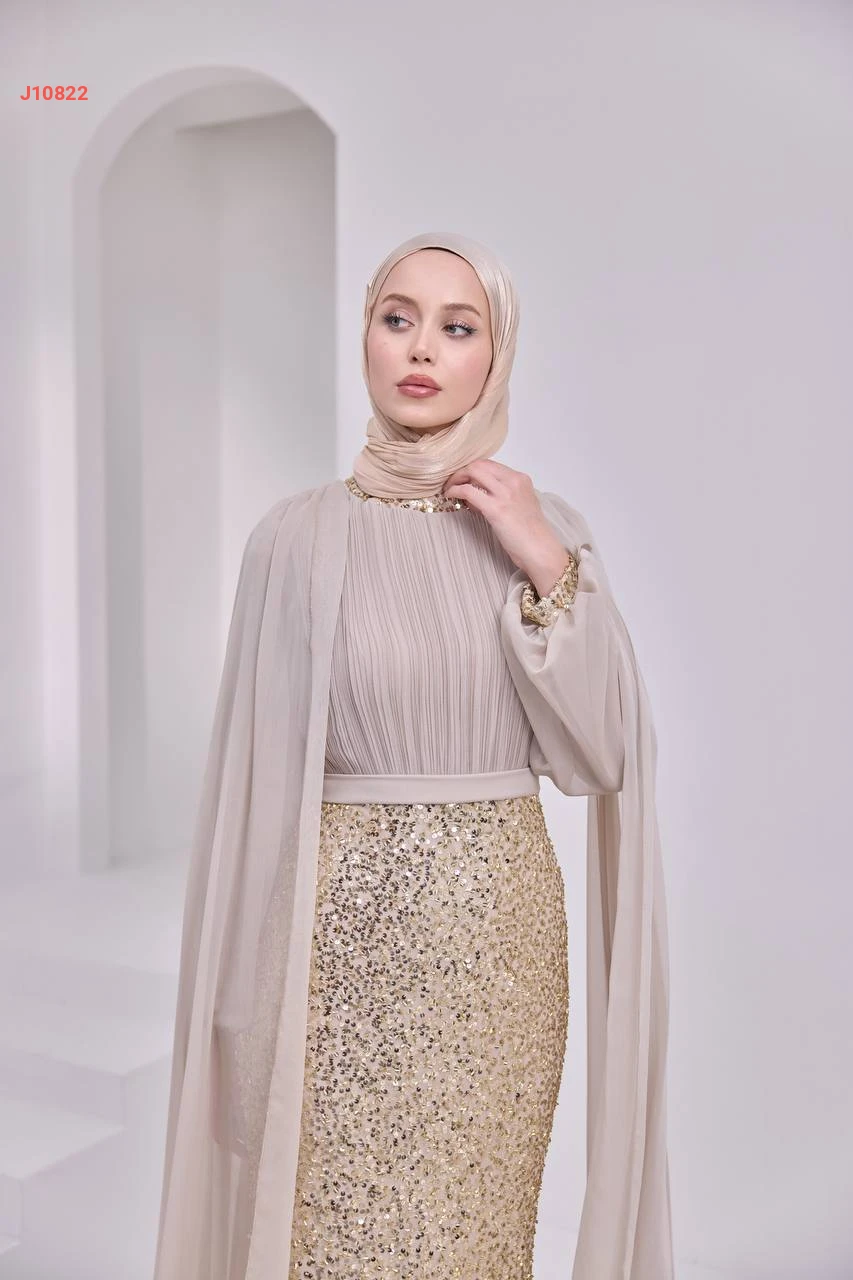 فستان سهرة محتشم مرصع بالبرق والخرز مع ياقة دائرية بأكتاف شيفون مع شاحط