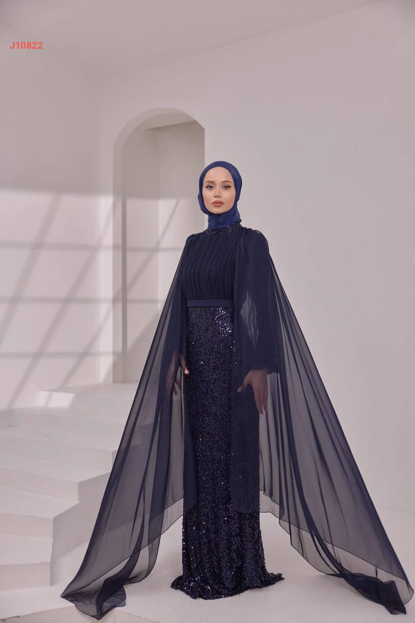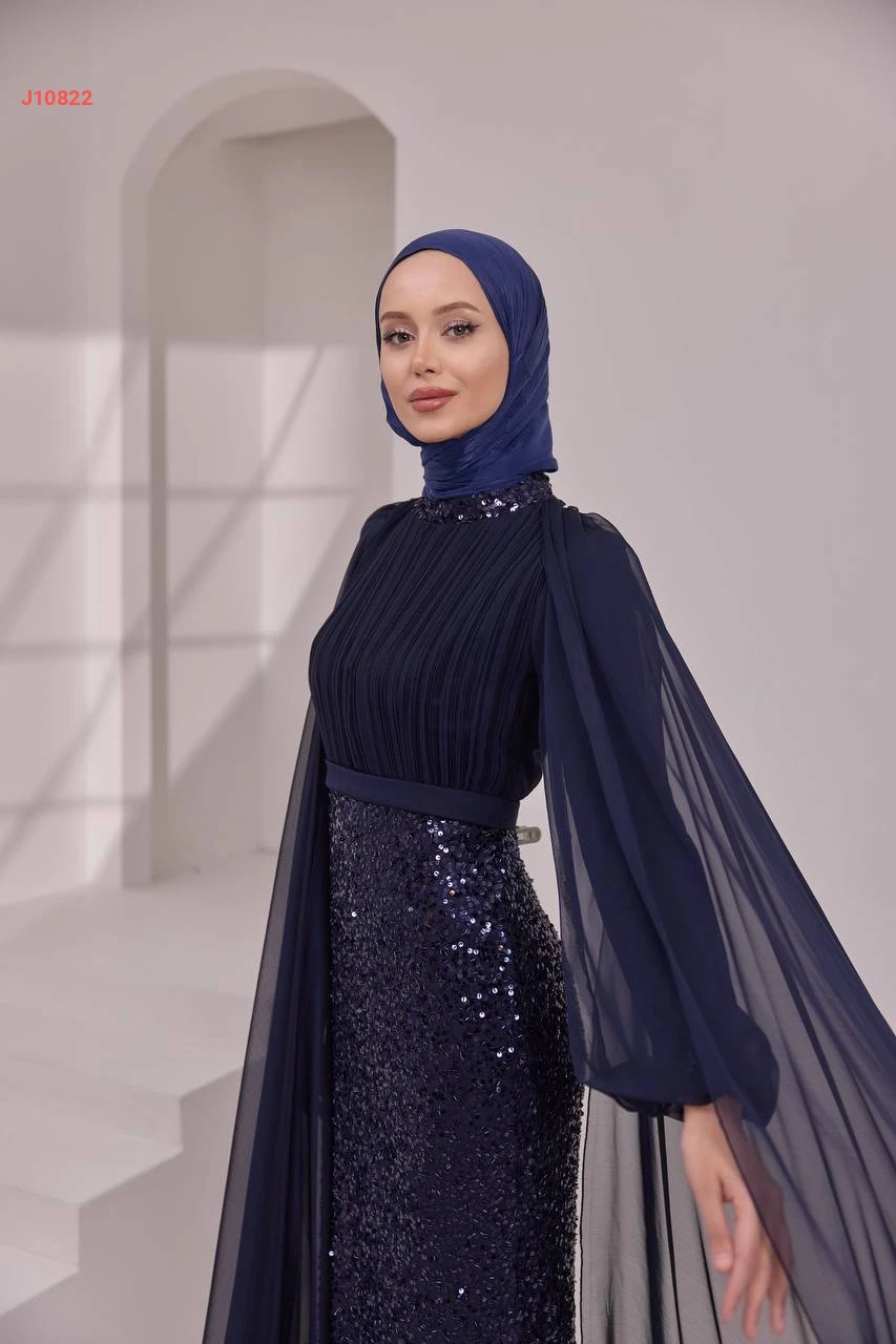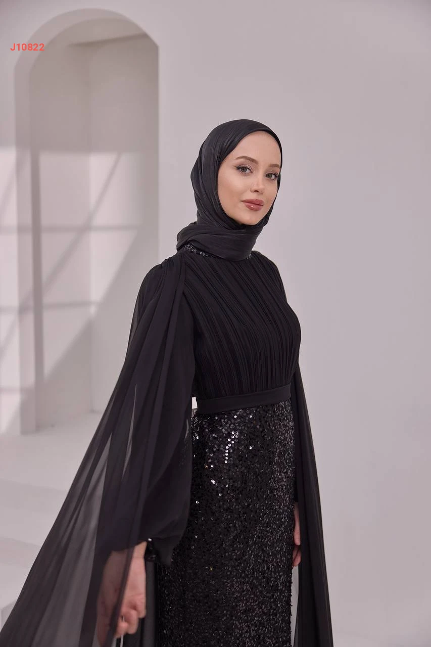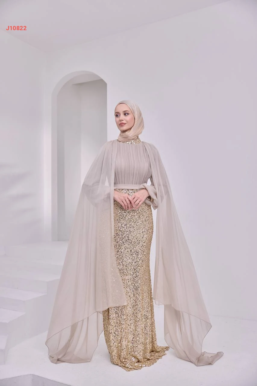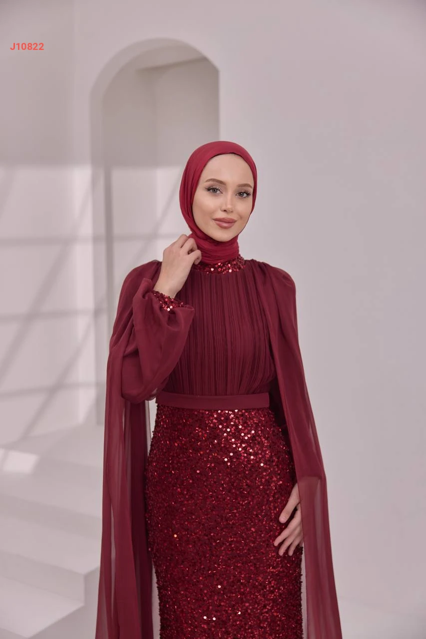 فستان سهرة محتشم مرصع بالبرق والخرز مع ياقة دائرية بأكتاف شيفون مع شاحط