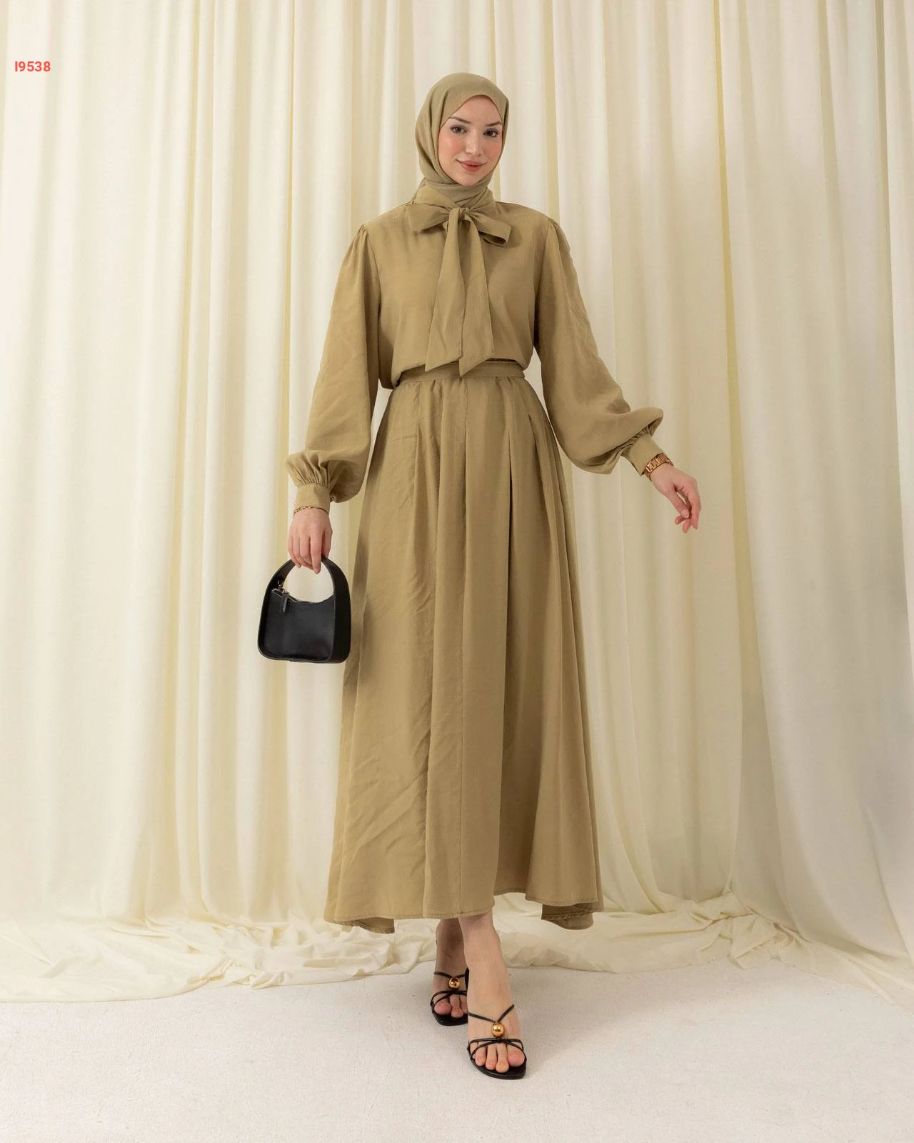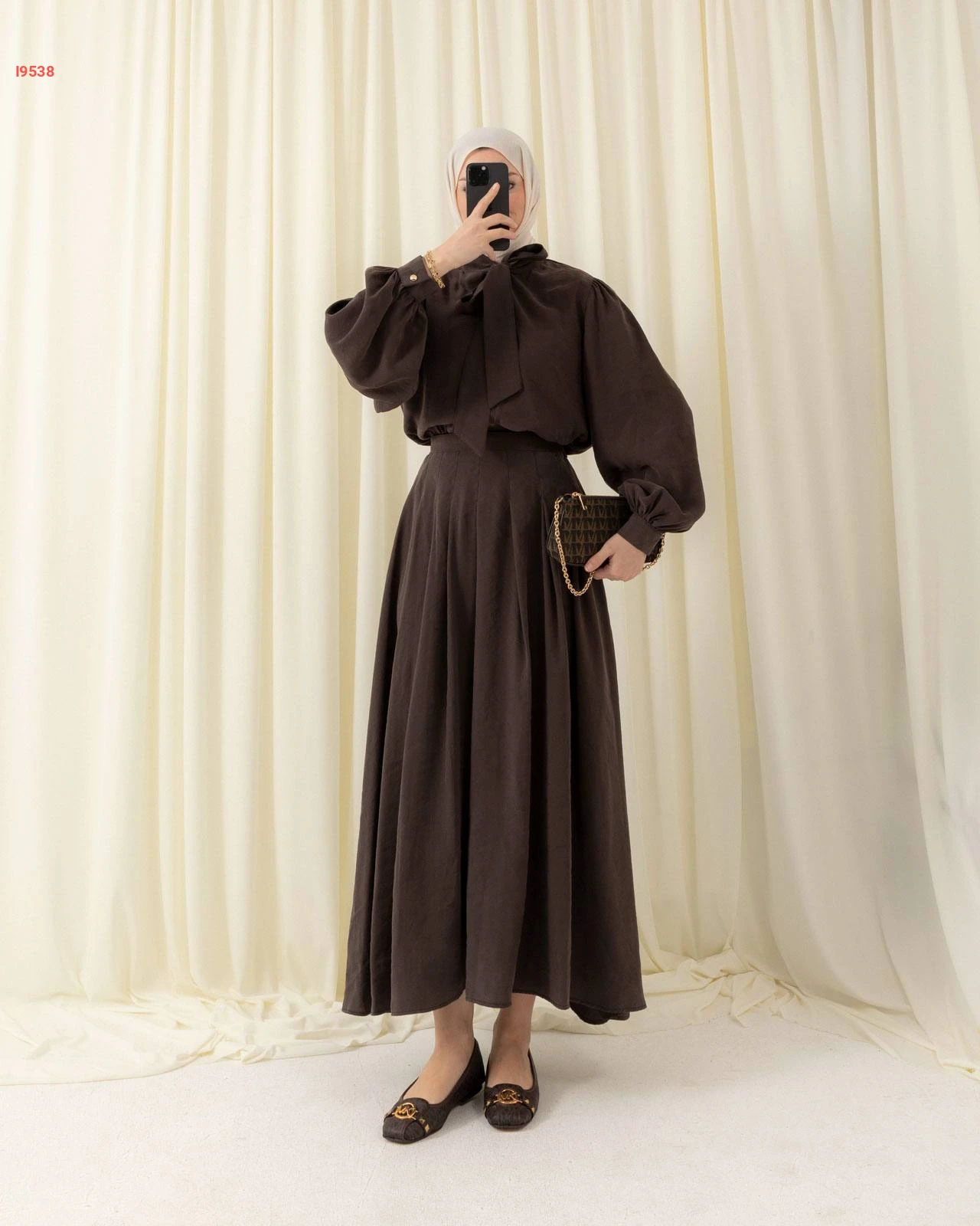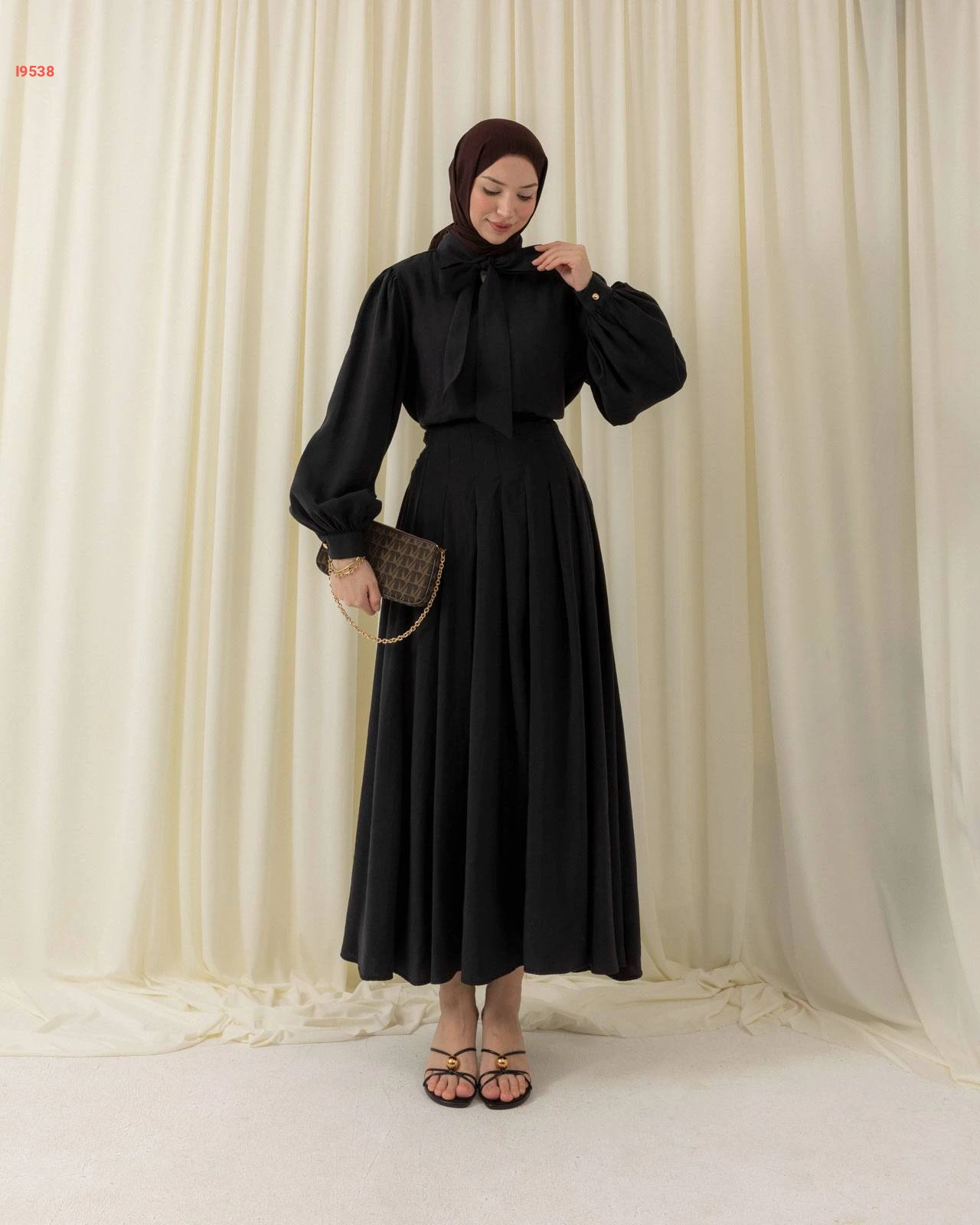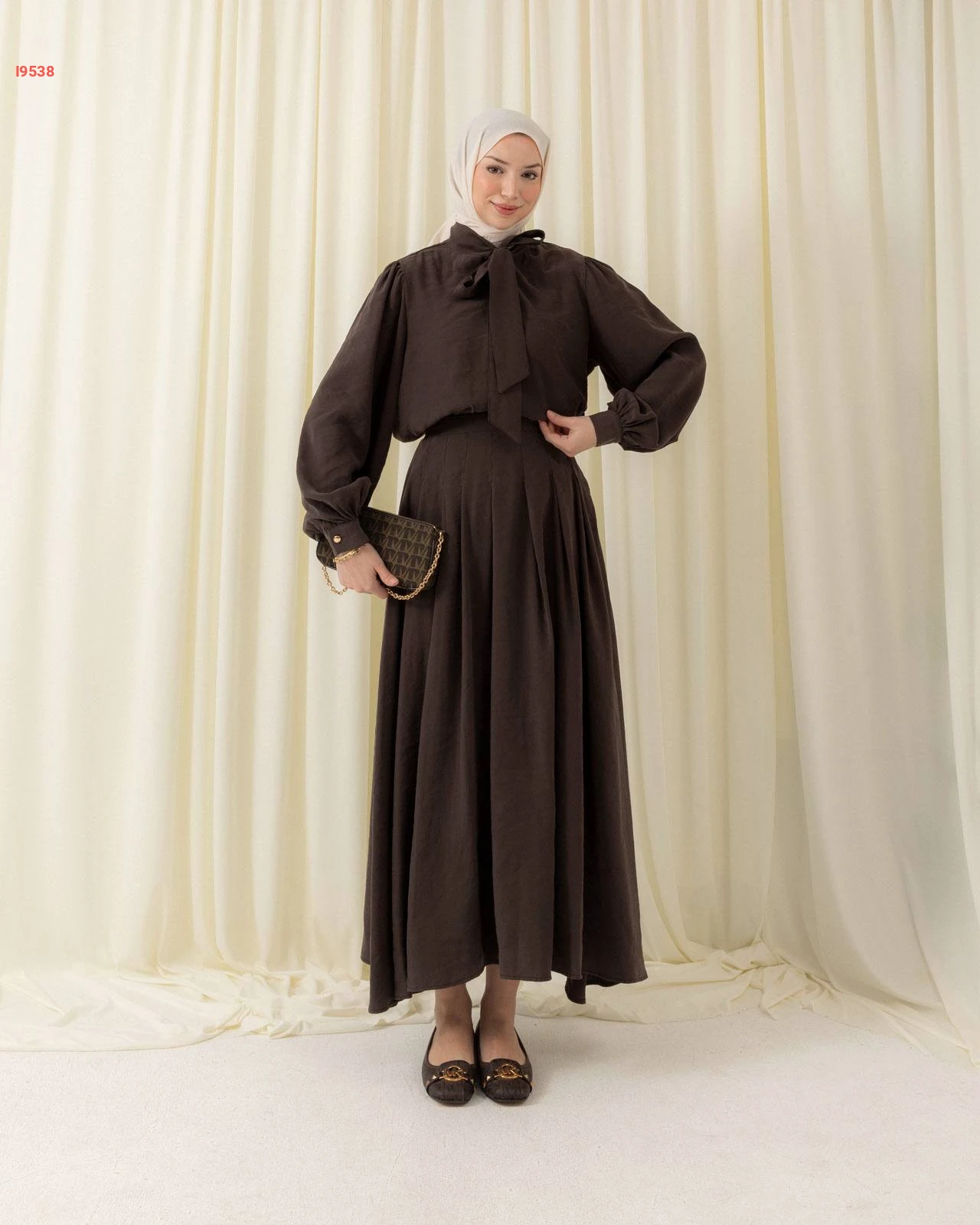 طقم محتشم تنورة طويلة بكسرات وقميص بأكمام منفوخة مزين بربطة عنق