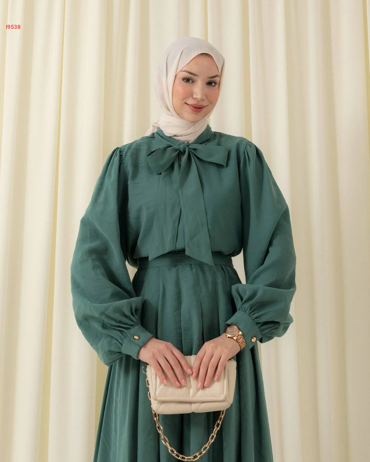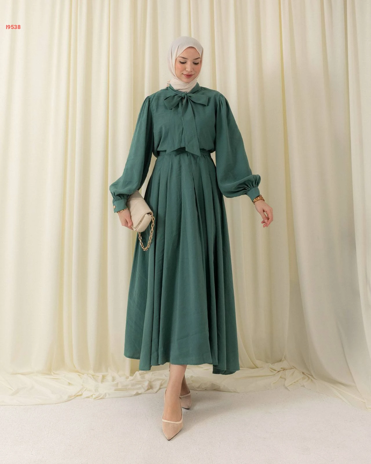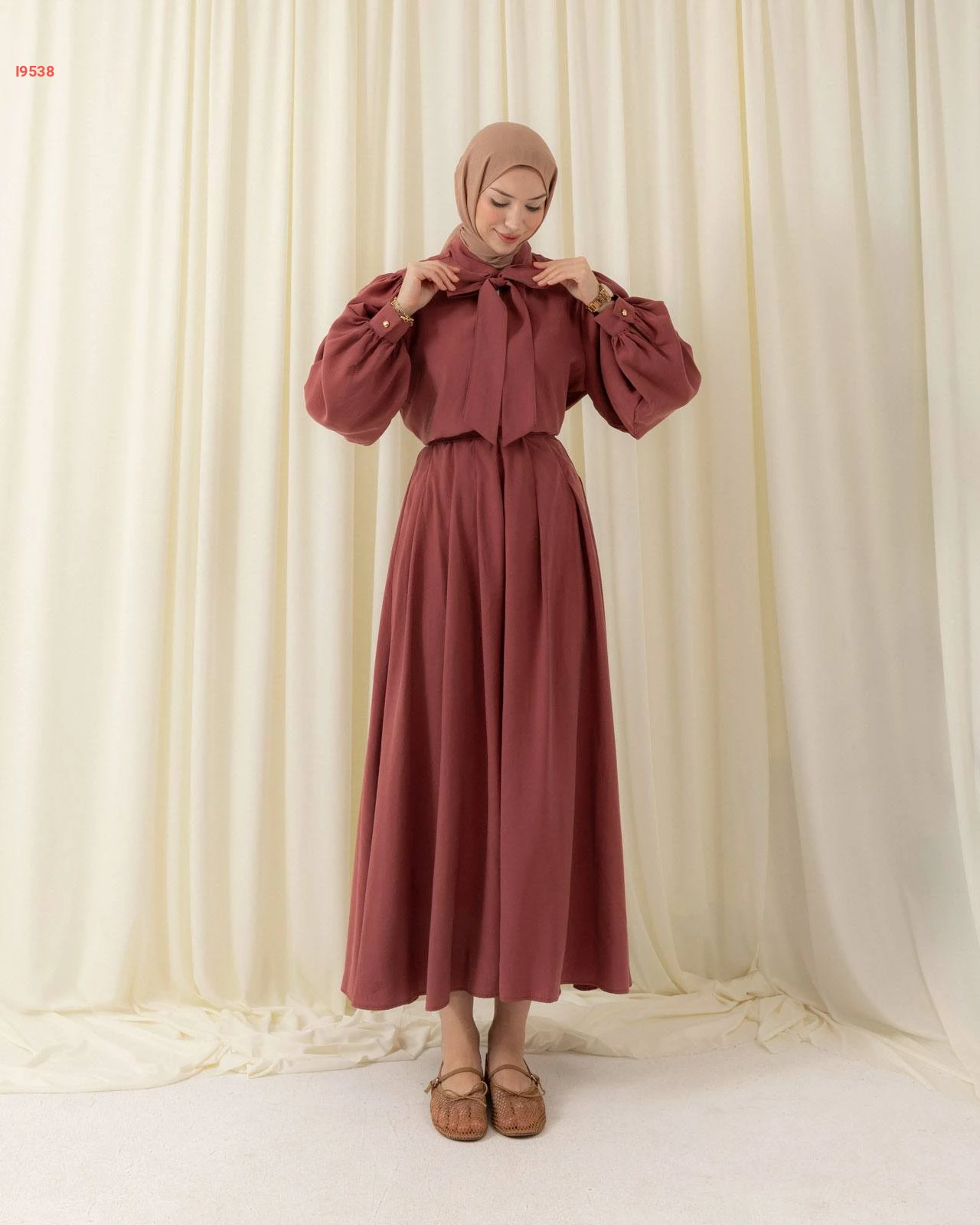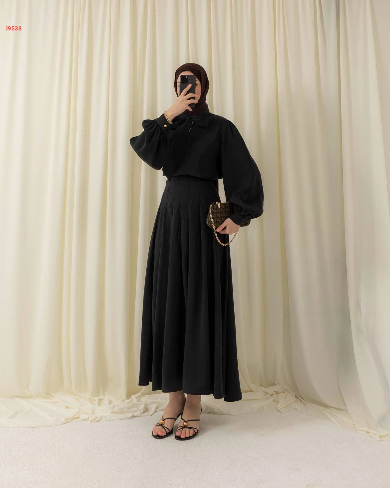 طقم محتشم تنورة طويلة بكسرات وقميص بأكمام منفوخة مزين بربطة عنق