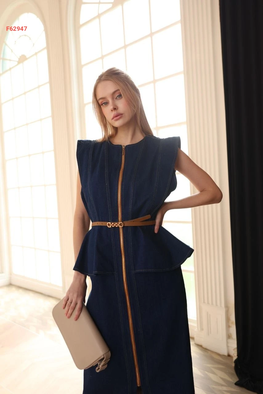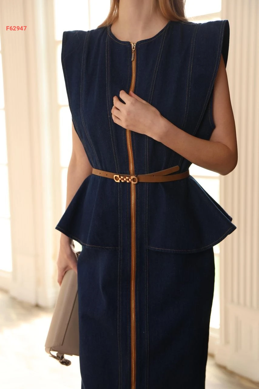فستان "ميدي"كحلي، يتميز بتصميم "ببلم" عند الخصر مع سحاب أمامي ذهبي كامل وحزام رفيع يبرز القوام.