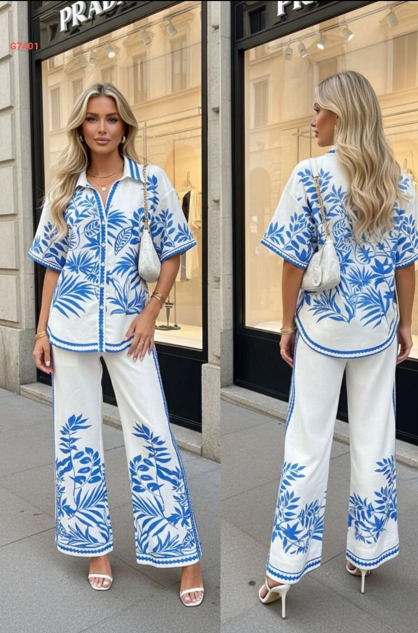 طقم بنطال كتان منقوش وقميص صيفي