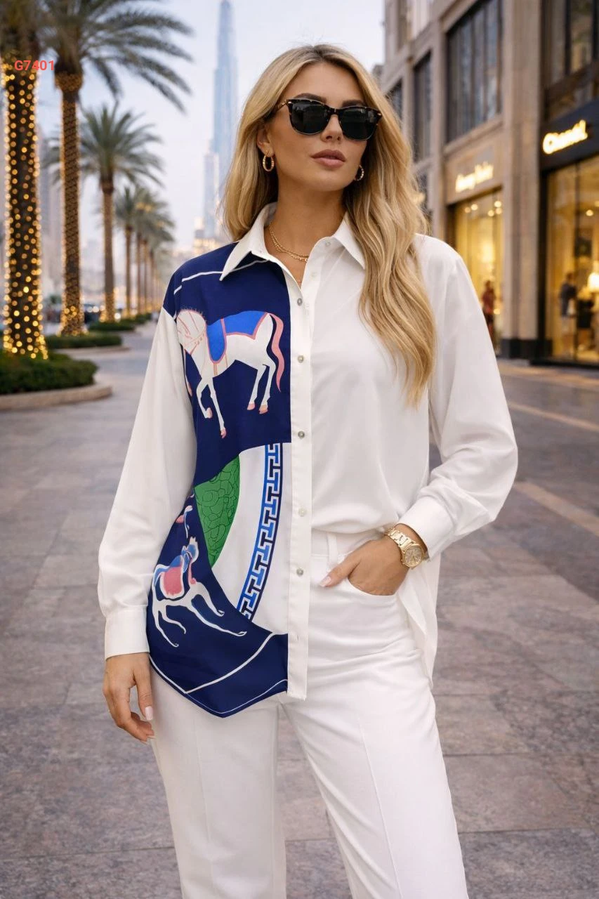 قميص منقوش بتفاصيل شال لف عالخصر