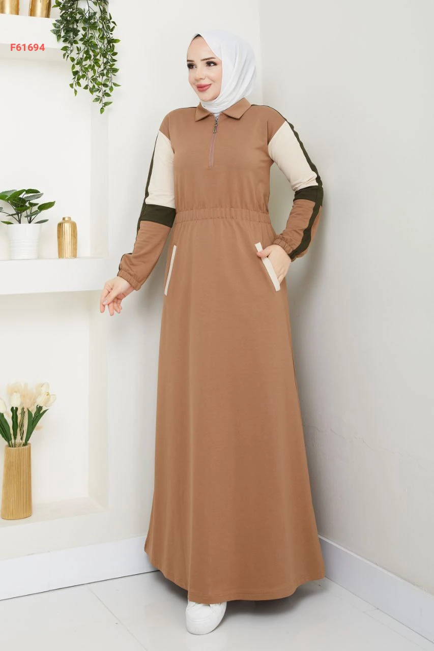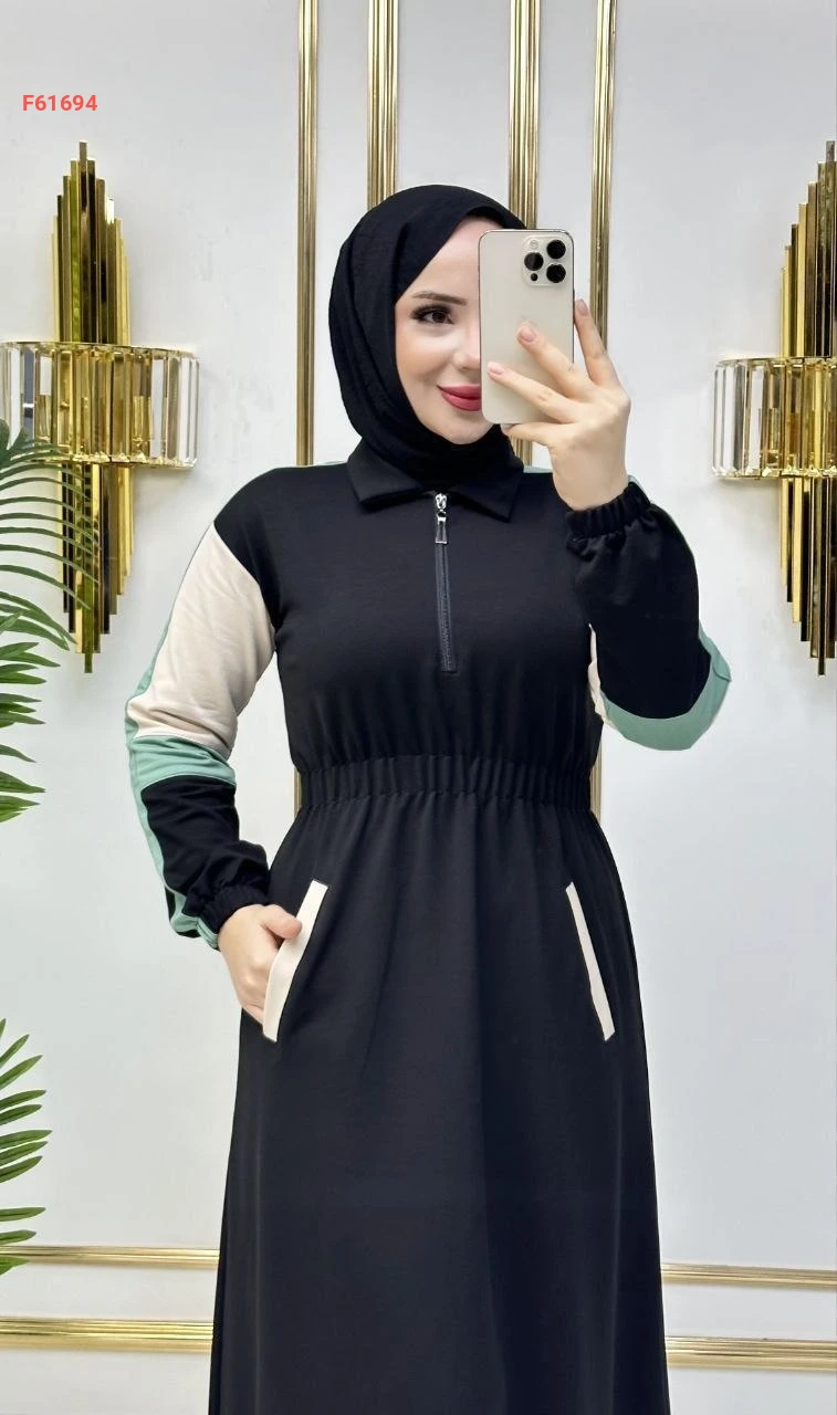 فستان سادة بياقة مرتفعة بسحاب مع زمة خصر وجيب