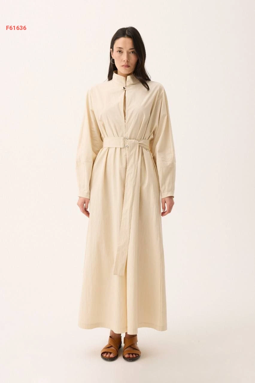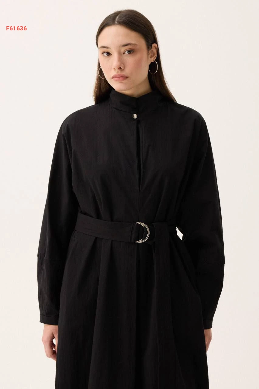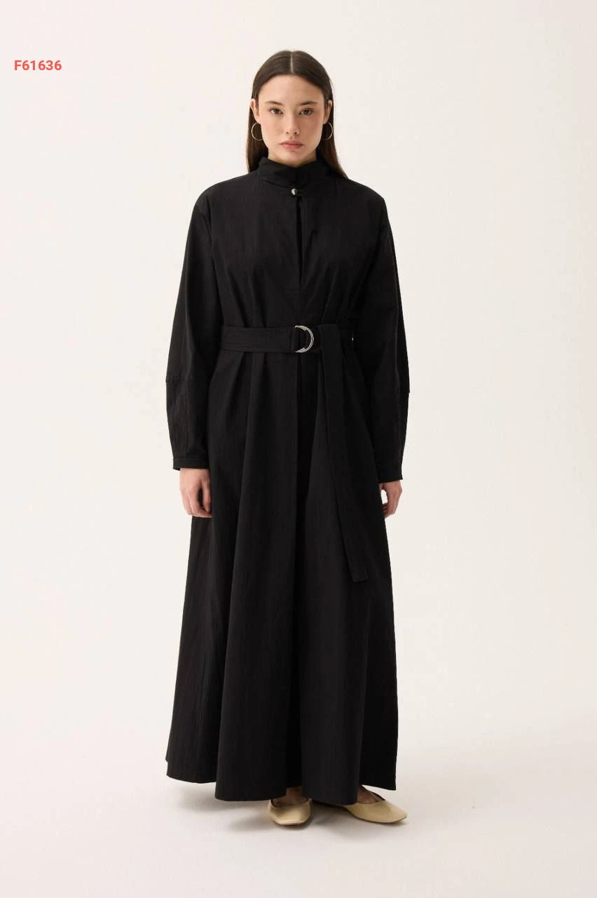 فستان طويل سادة بياقة مرتفعة مع حزام