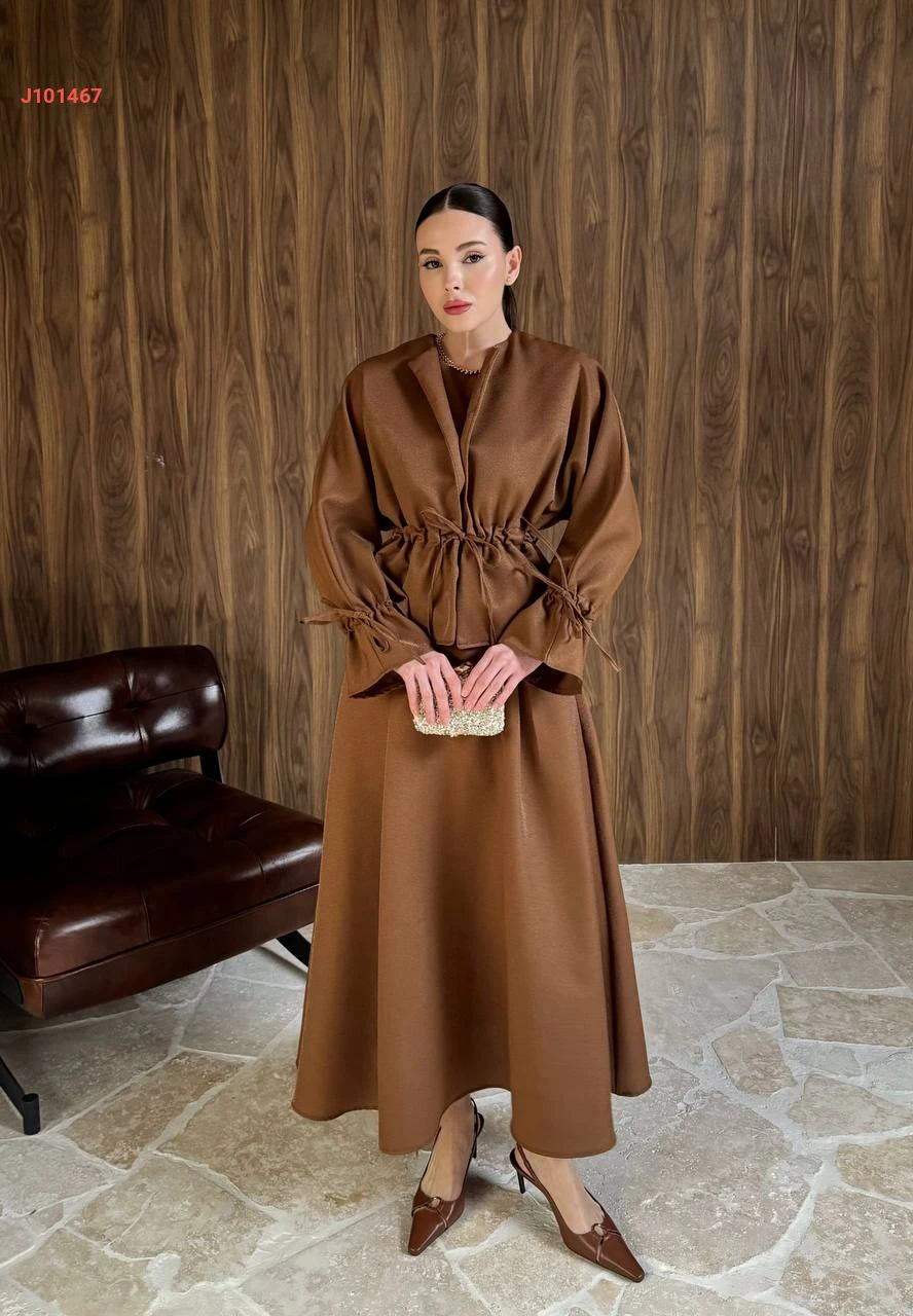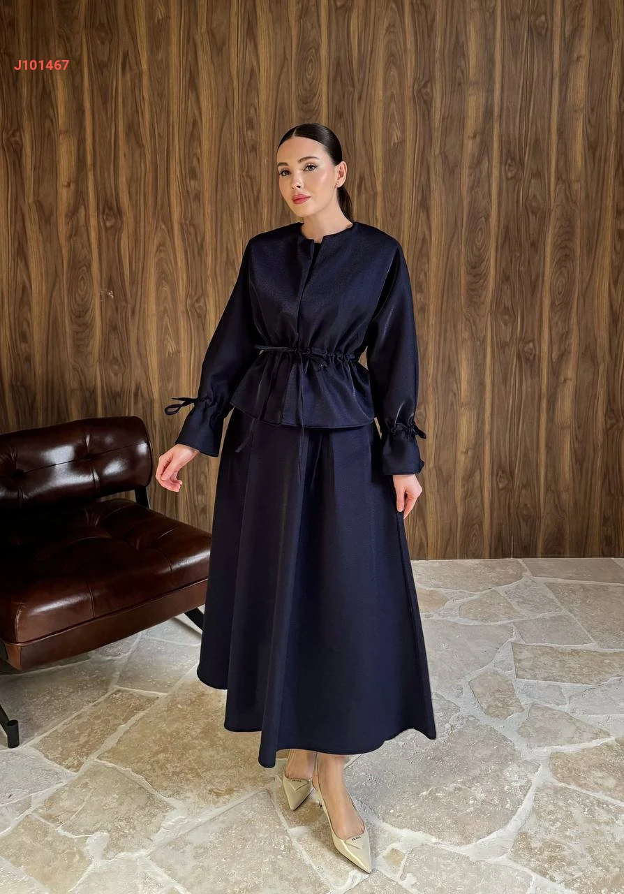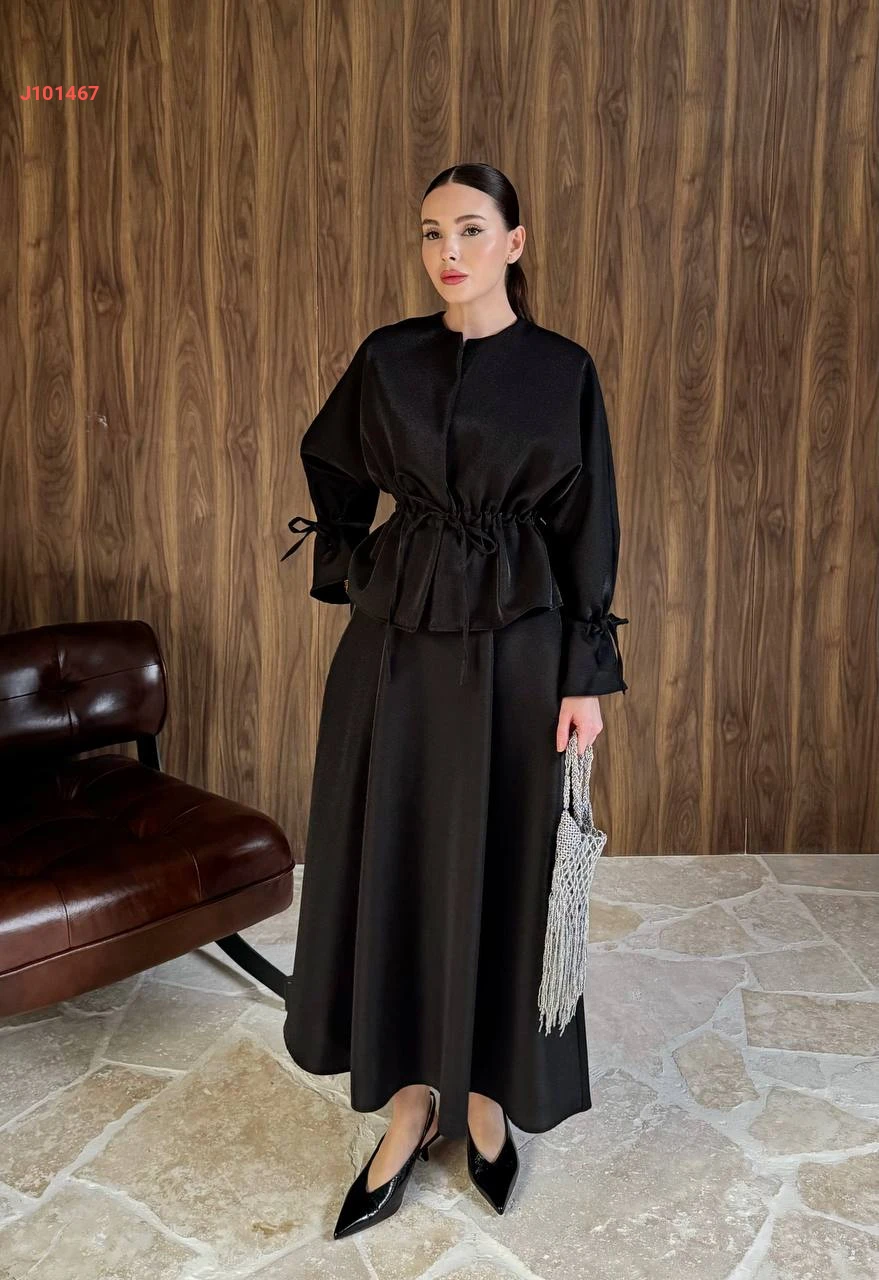 طقم تنورة سادة بزمة خصر مع أكمام مزمومة