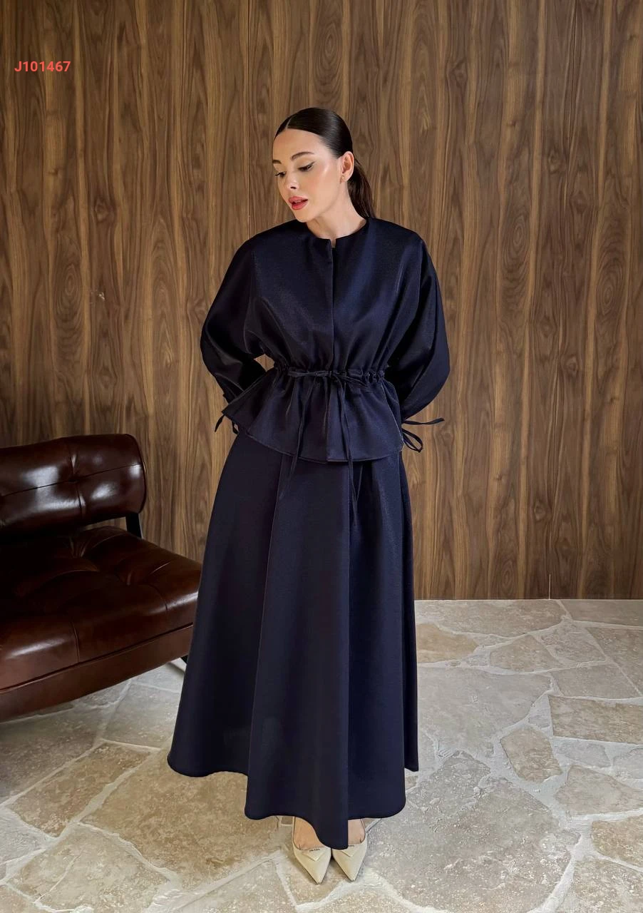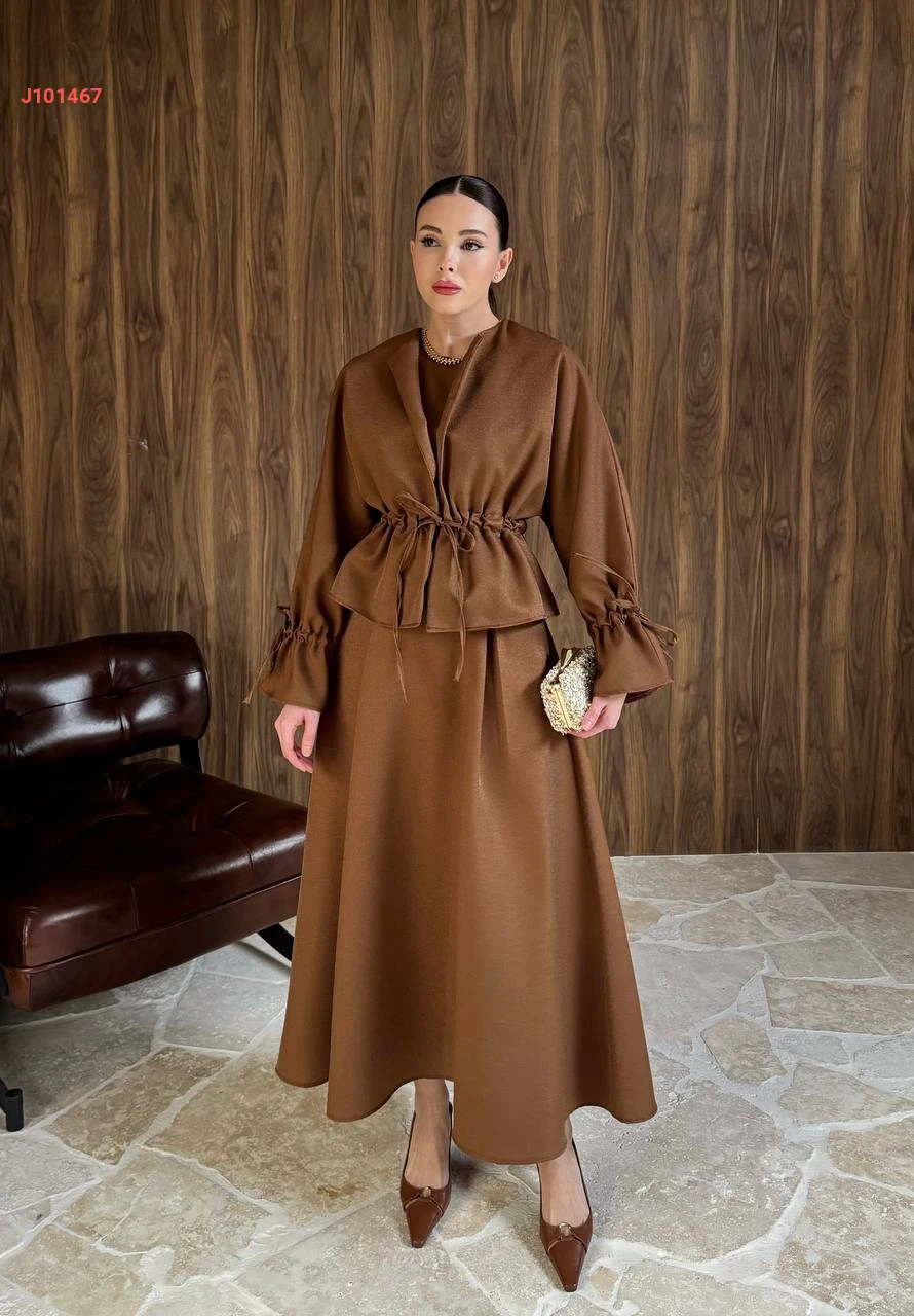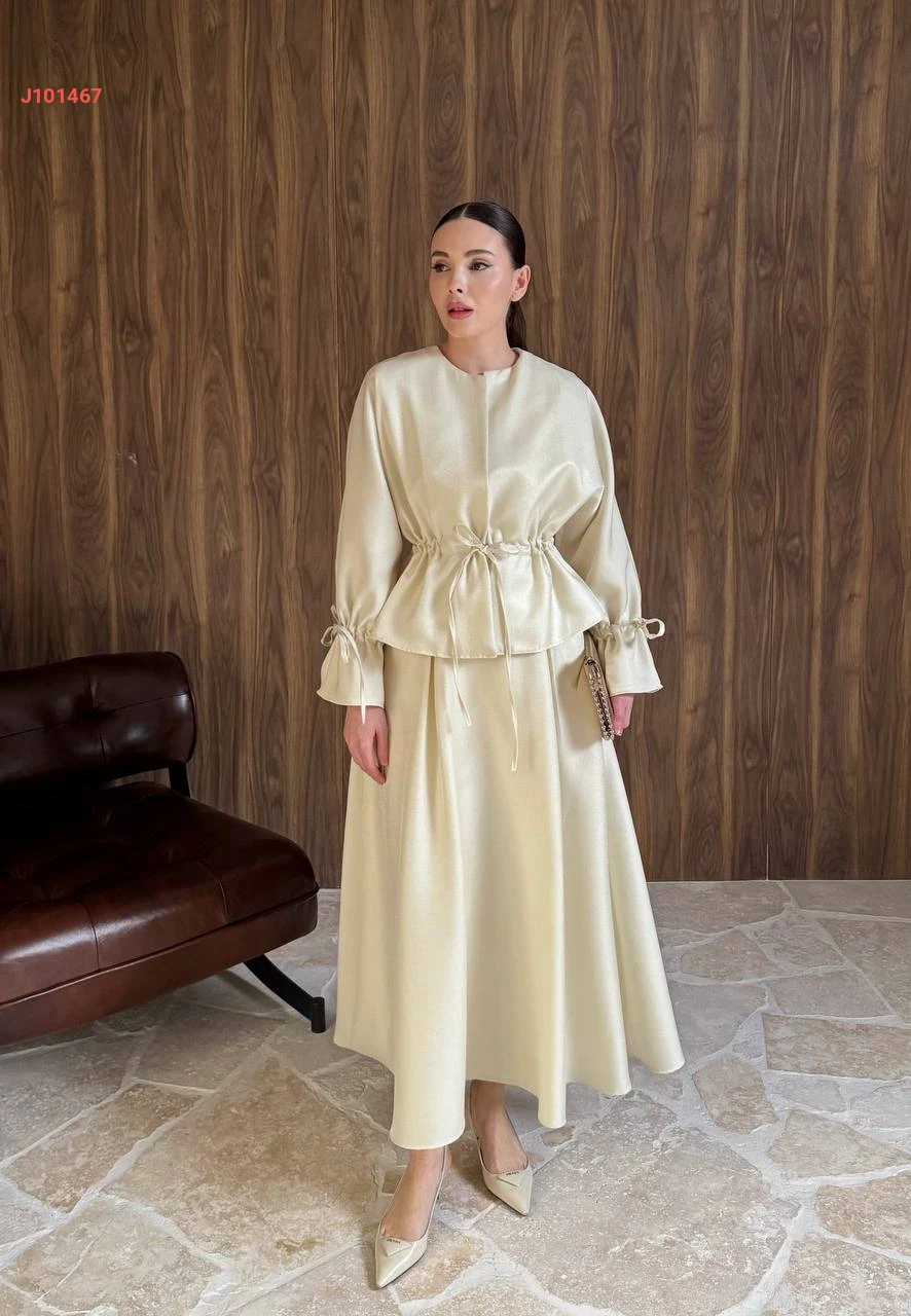 طقم تنورة سادة بزمة خصر مع أكمام مزمومة