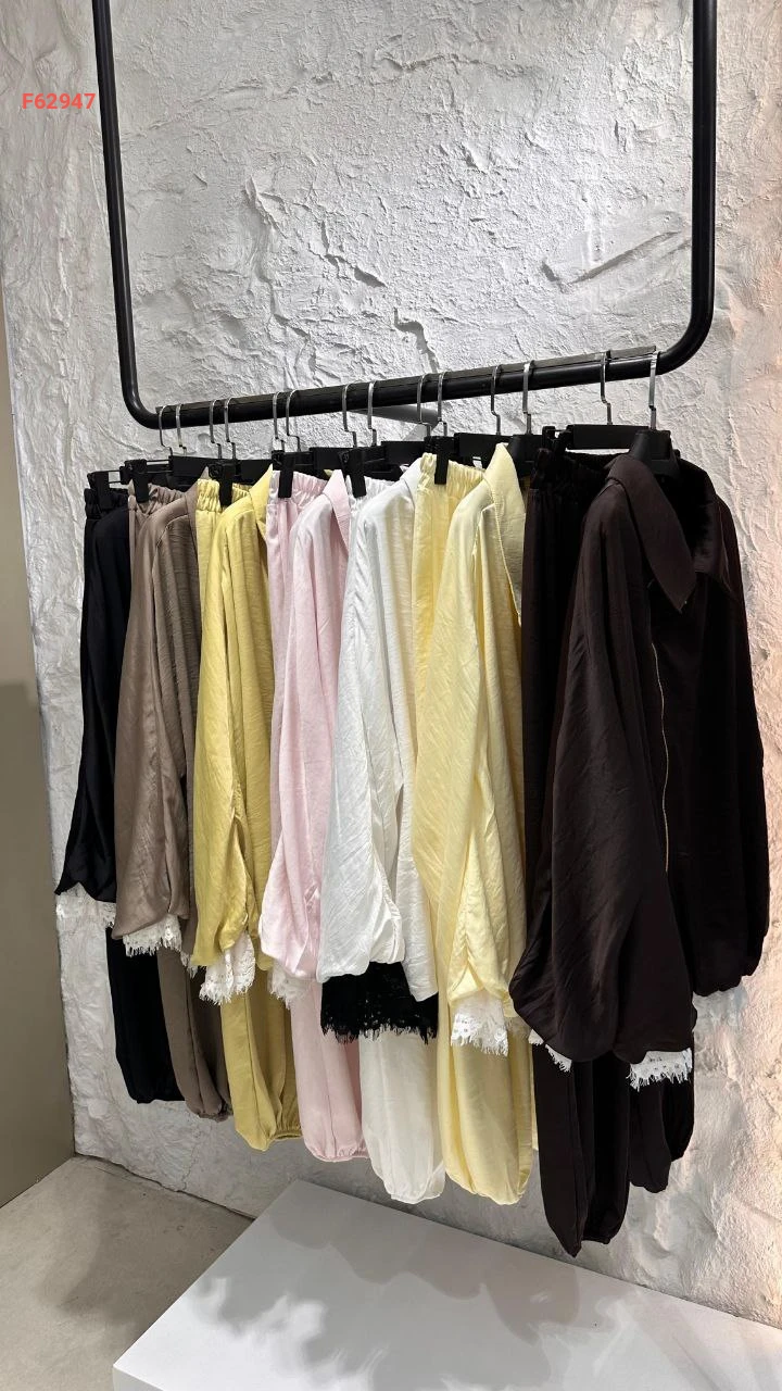 طقم راقٍ من قماش الساتان الناعم، يتميز بجاكيت بياقة كلاسيكية وتفاصيل من الدانتيل عند الأطراف مع بنطلون واسع لإطلالة
