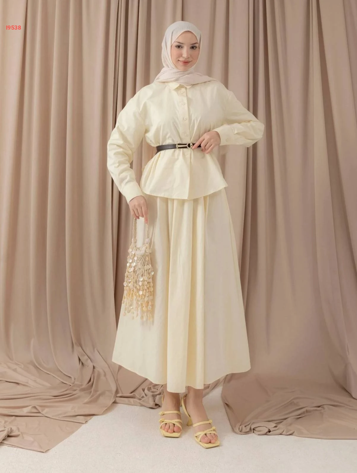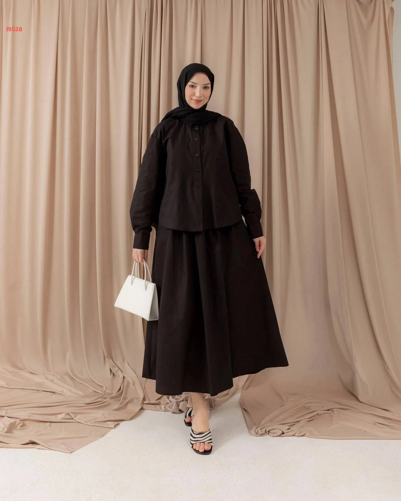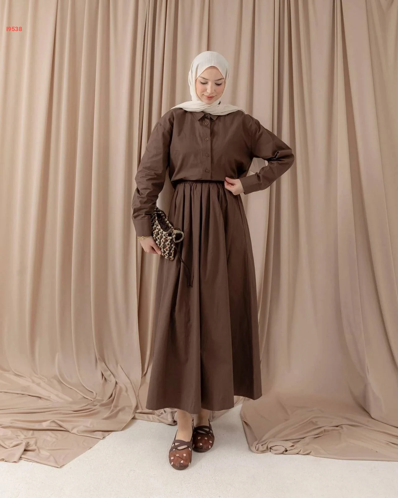 طقم مكوّن من بلوزة فضفاضة بأزرار أمامية وتنورة ميدي مريحة، متوفر بعدة ألوان شتوية