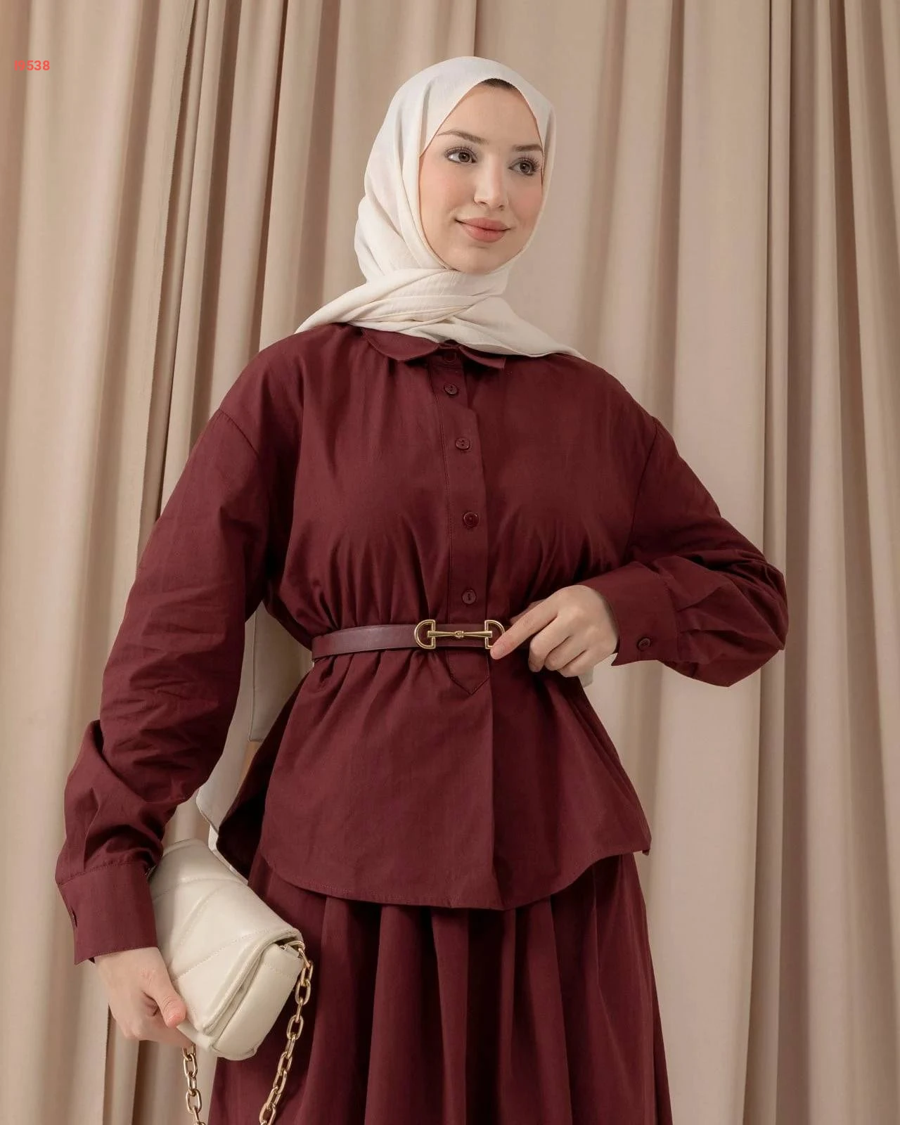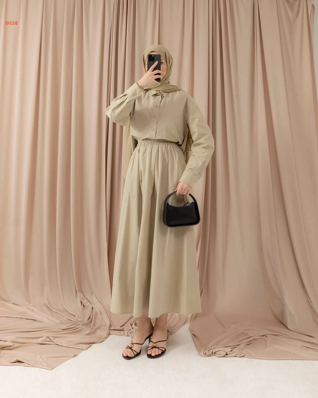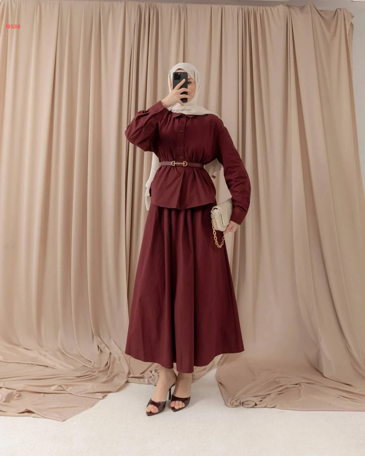 طقم مكوّن من بلوزة فضفاضة بأزرار أمامية وتنورة ميدي مريحة، متوفر بعدة ألوان شتوية