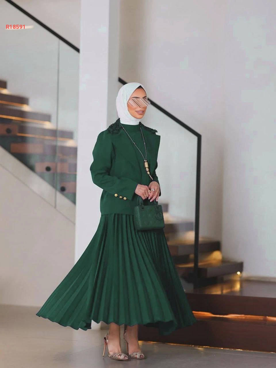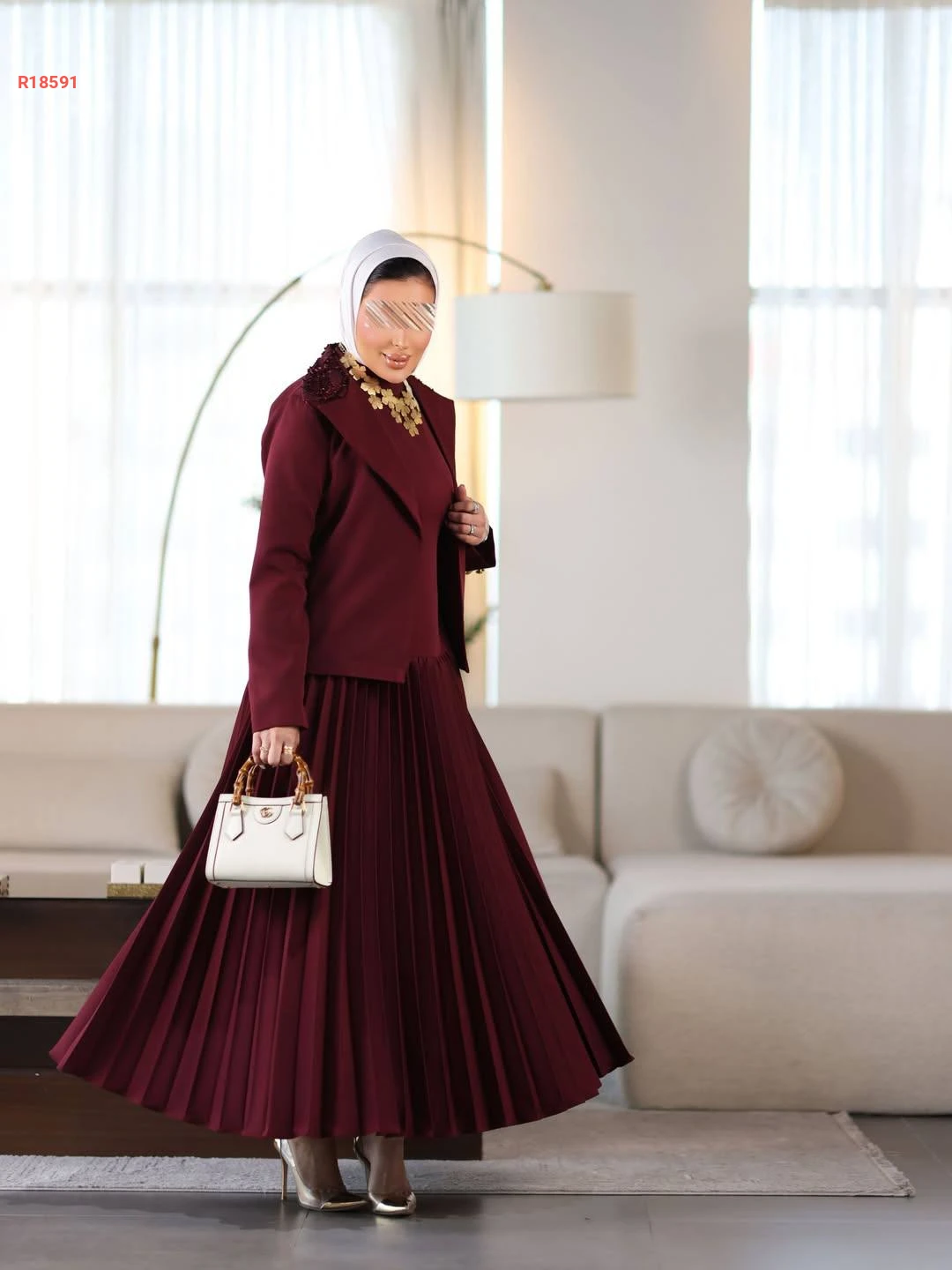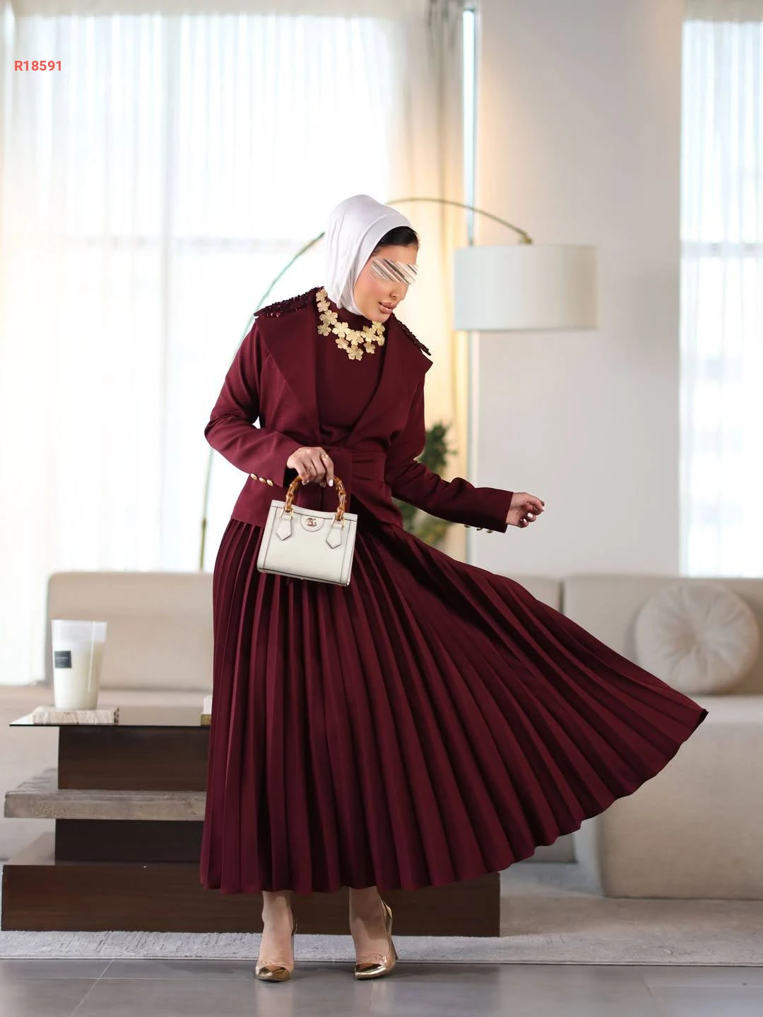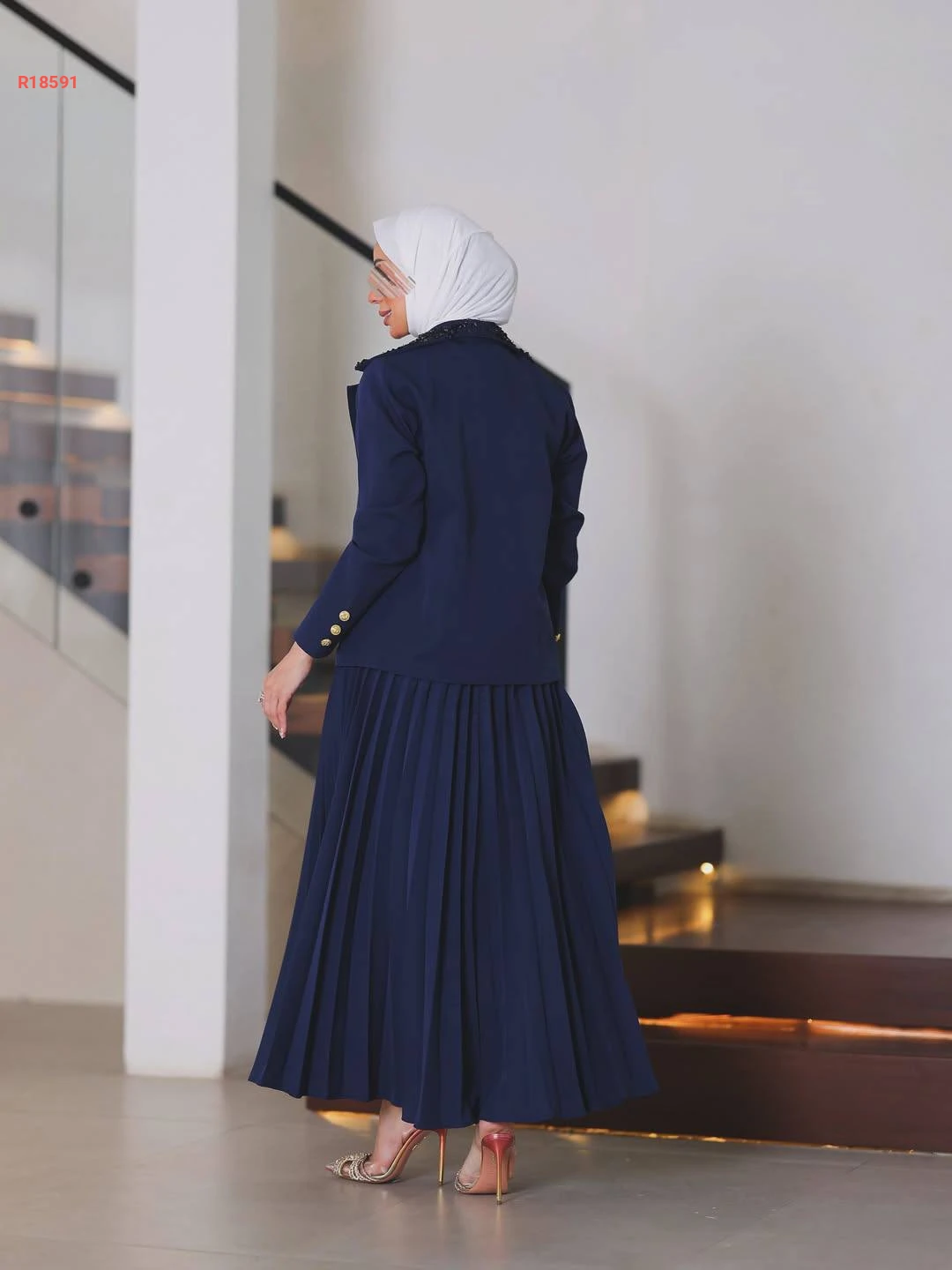 طقم فستان بتنورة كسرات سادة ، مع جاكيت رسمي بياقة عريضة مرصعة بالشك