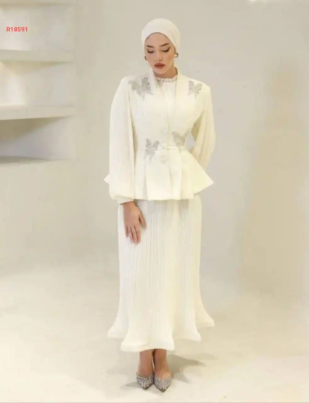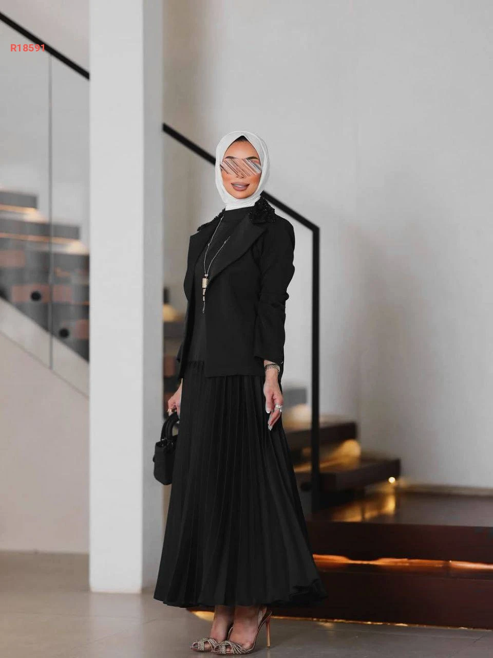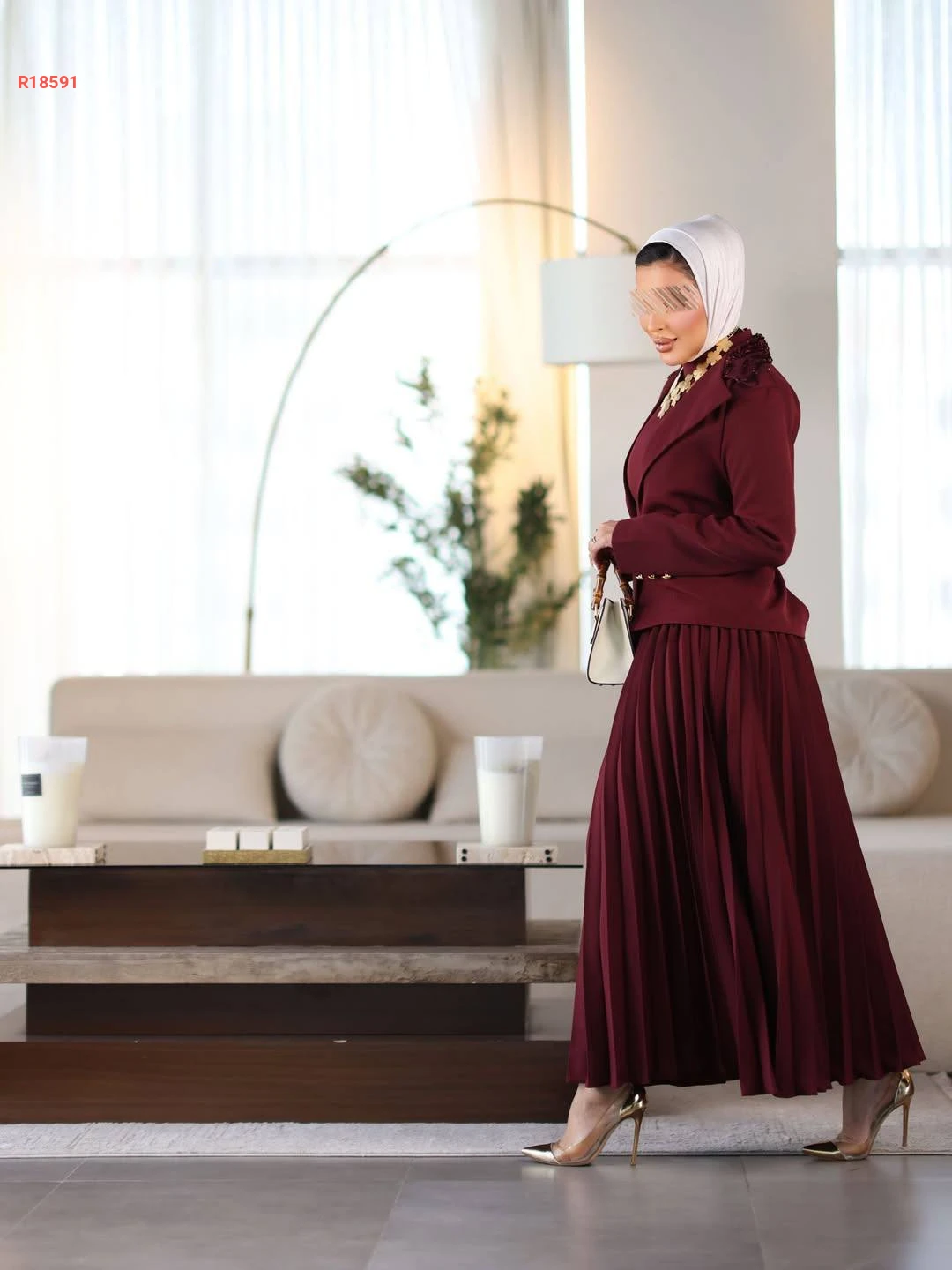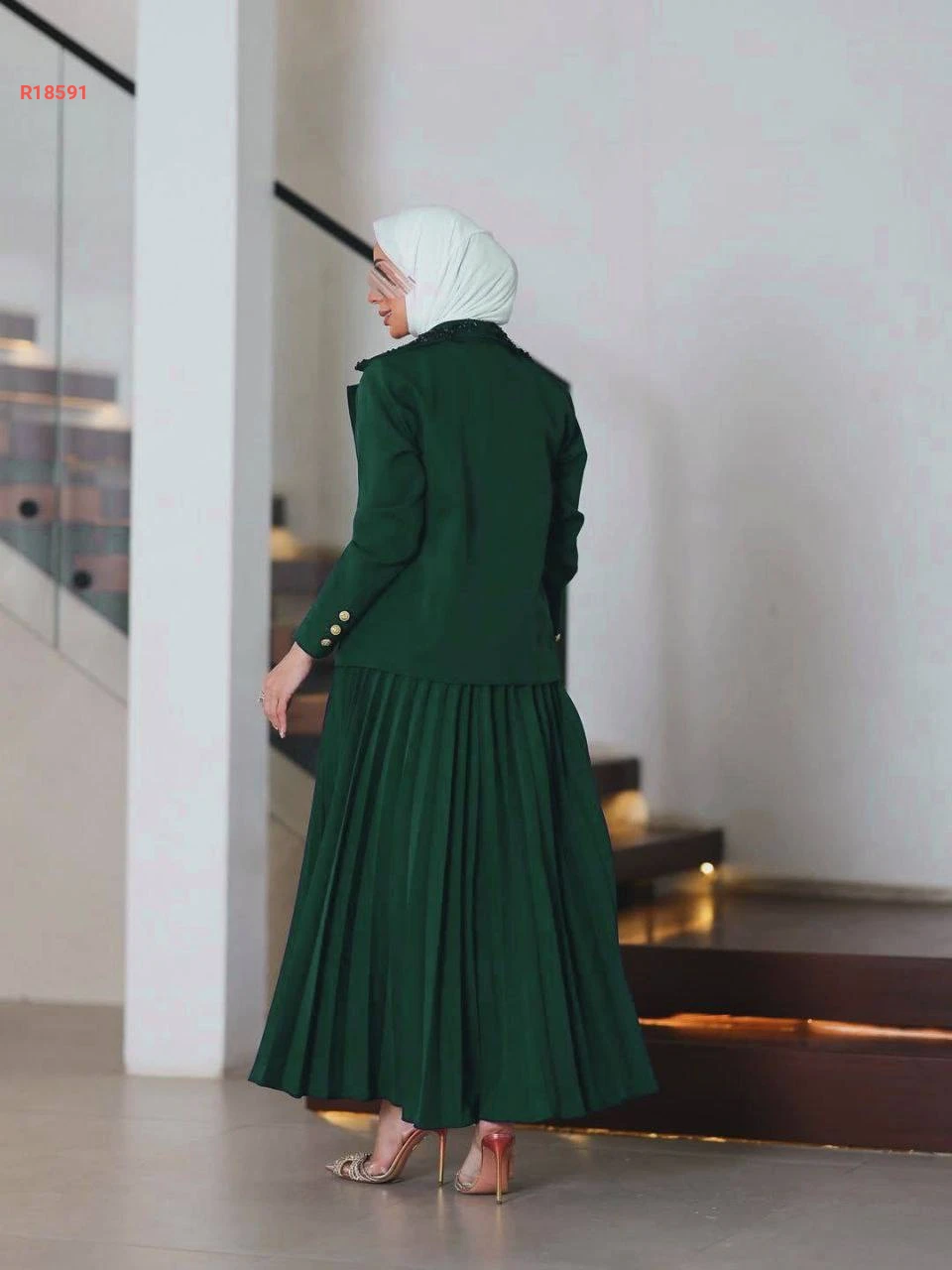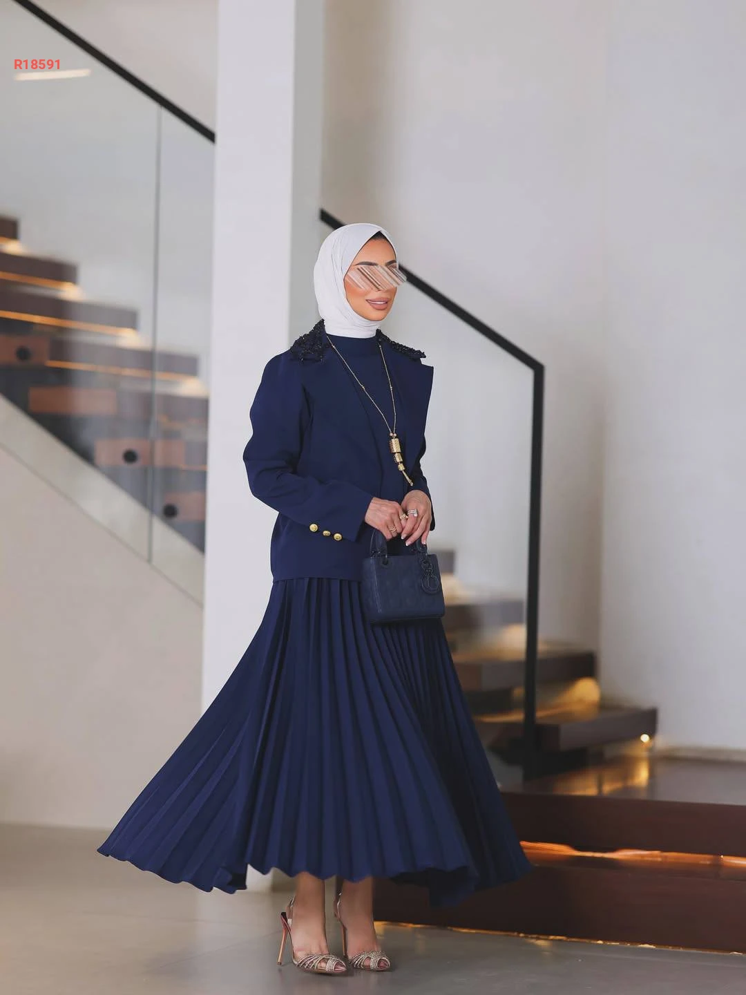 طقم فستان بتنورة كسرات سادة ، مع جاكيت رسمي بياقة عريضة مرصعة بالشك