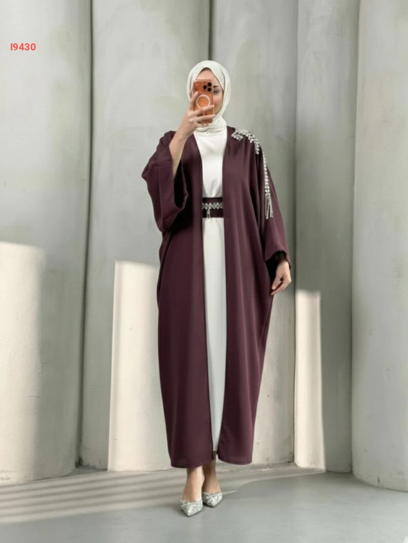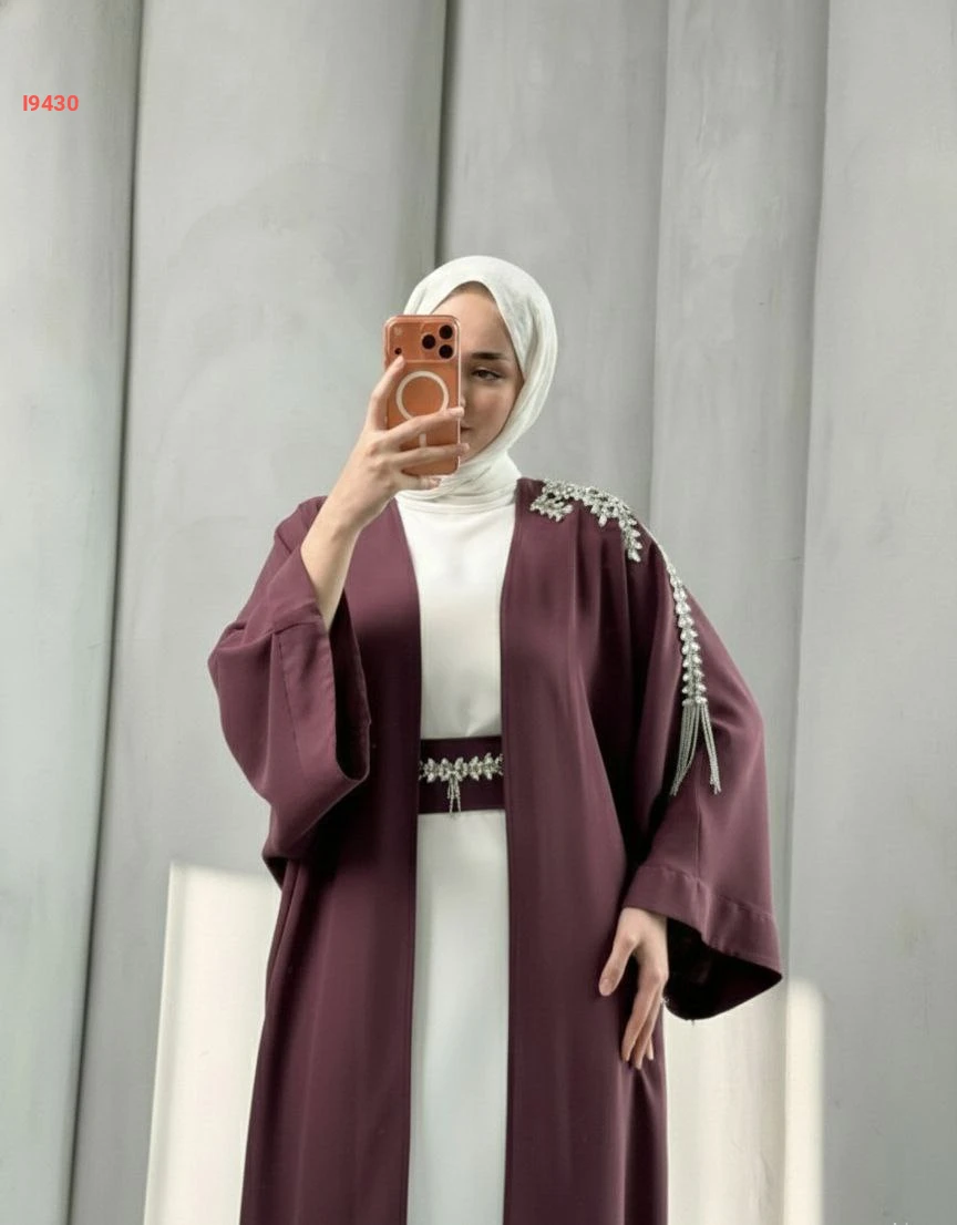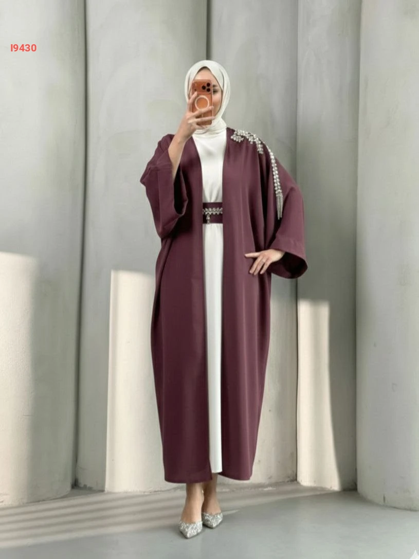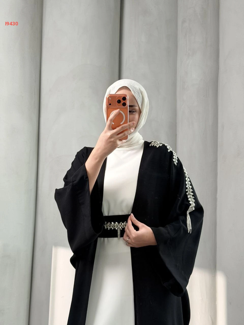 طقم عباية مزينة بالكريستال عند الكتف مع فستان سادة مع حزام