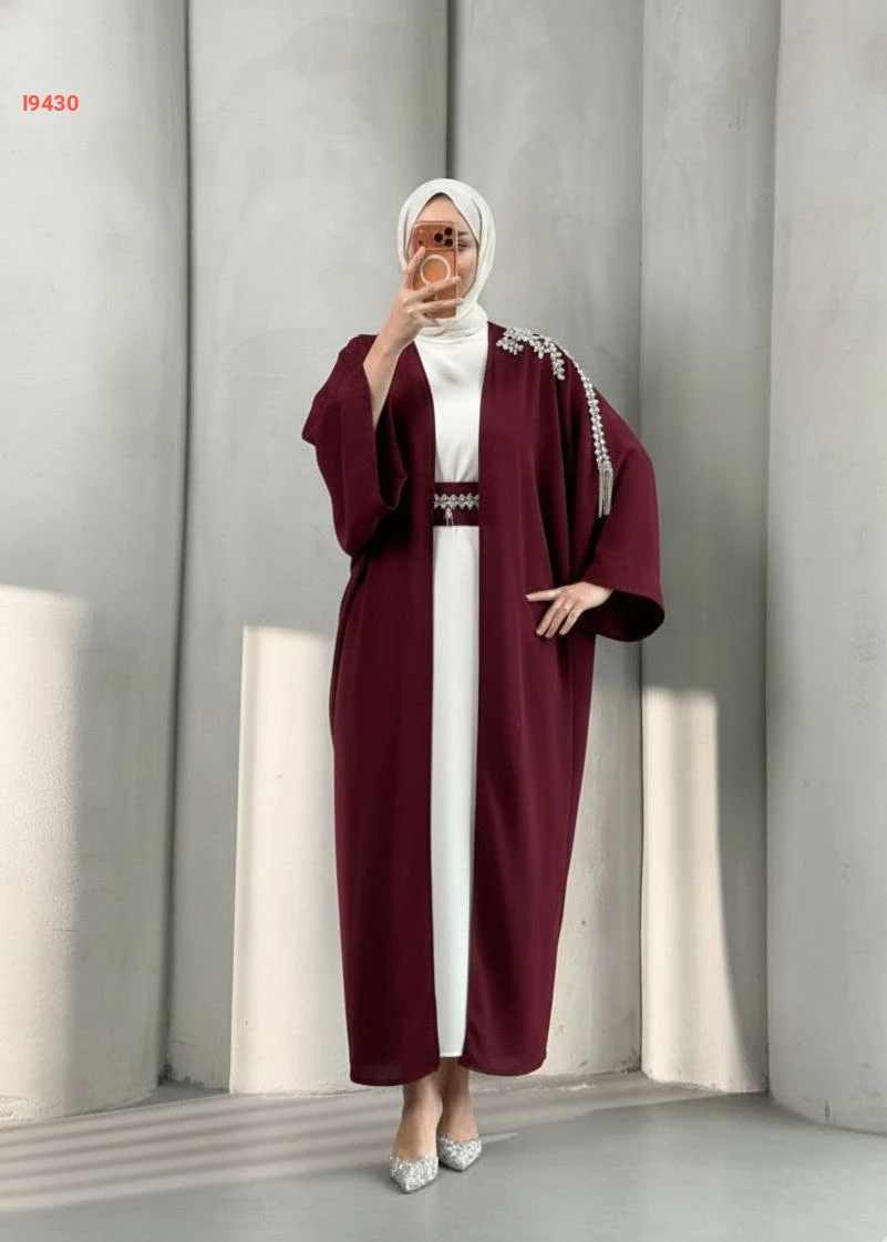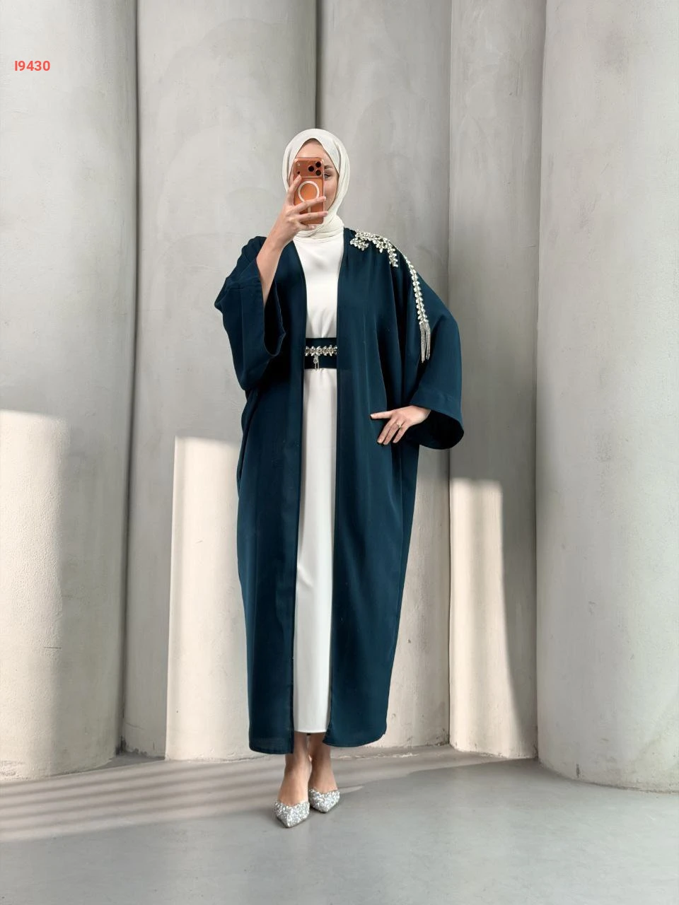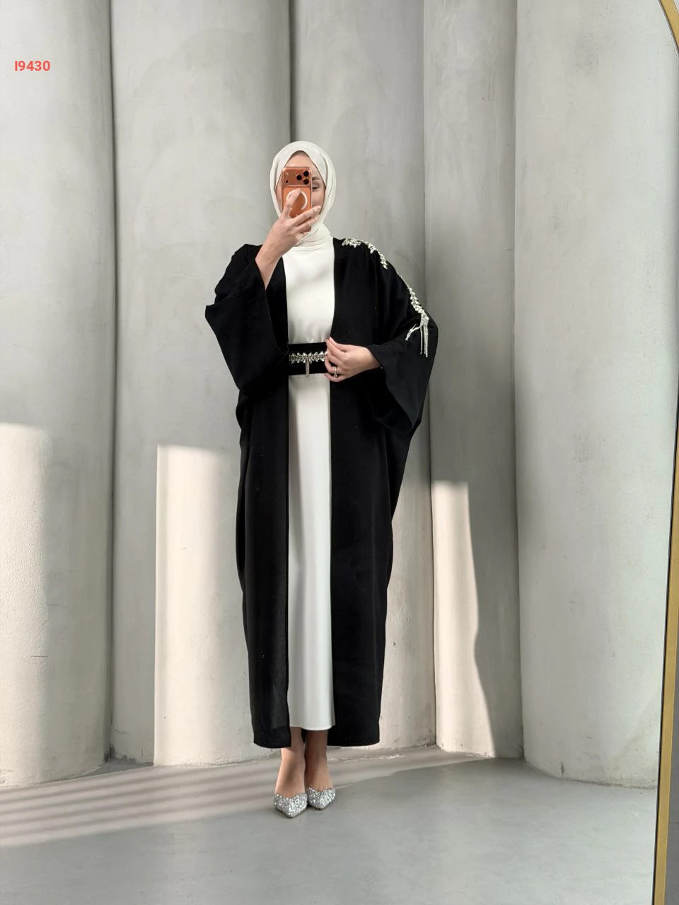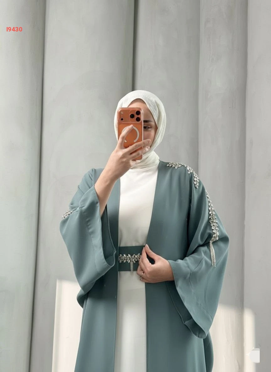 طقم عباية مزينة بالكريستال عند الكتف مع فستان سادة مع حزام