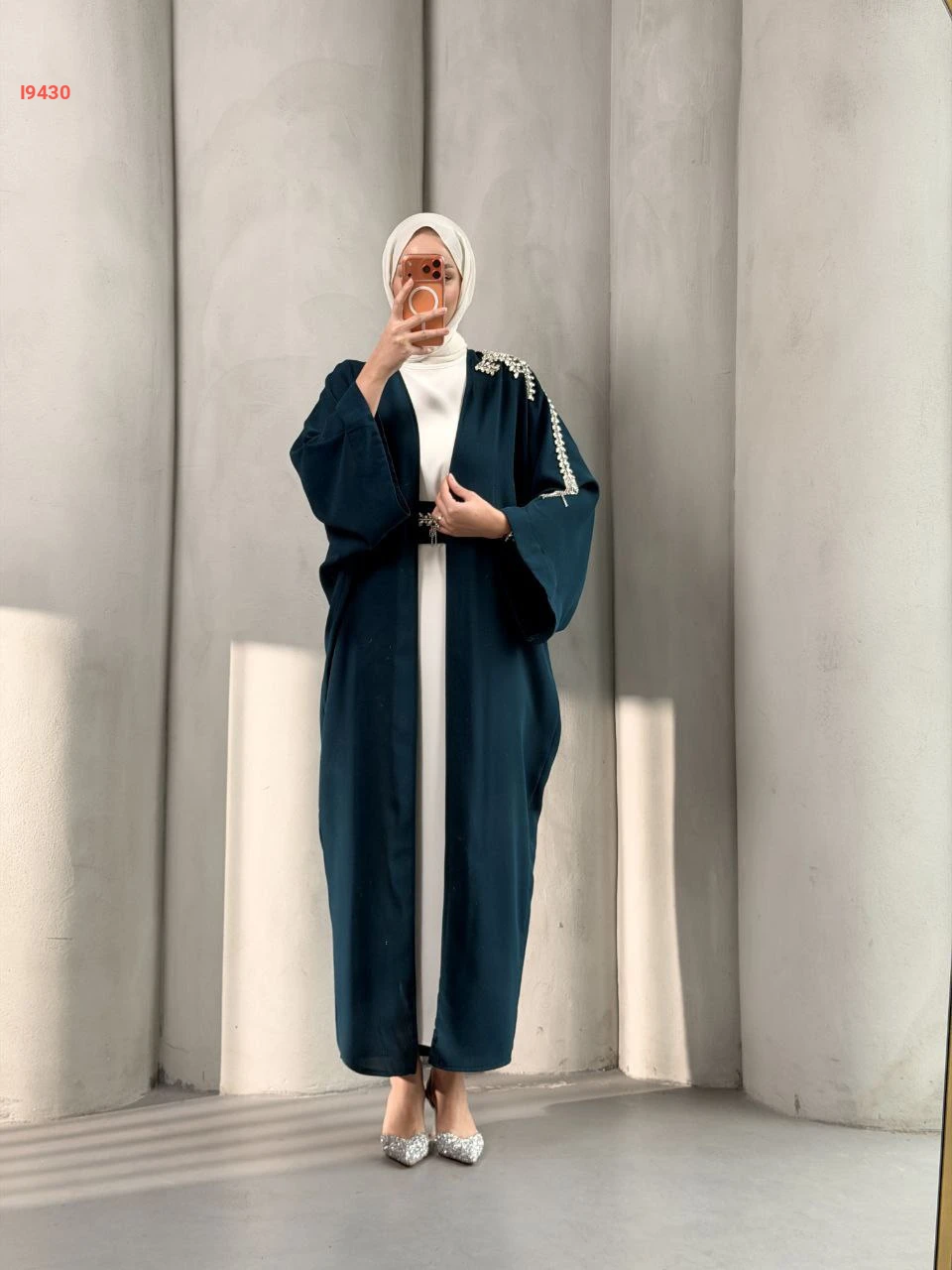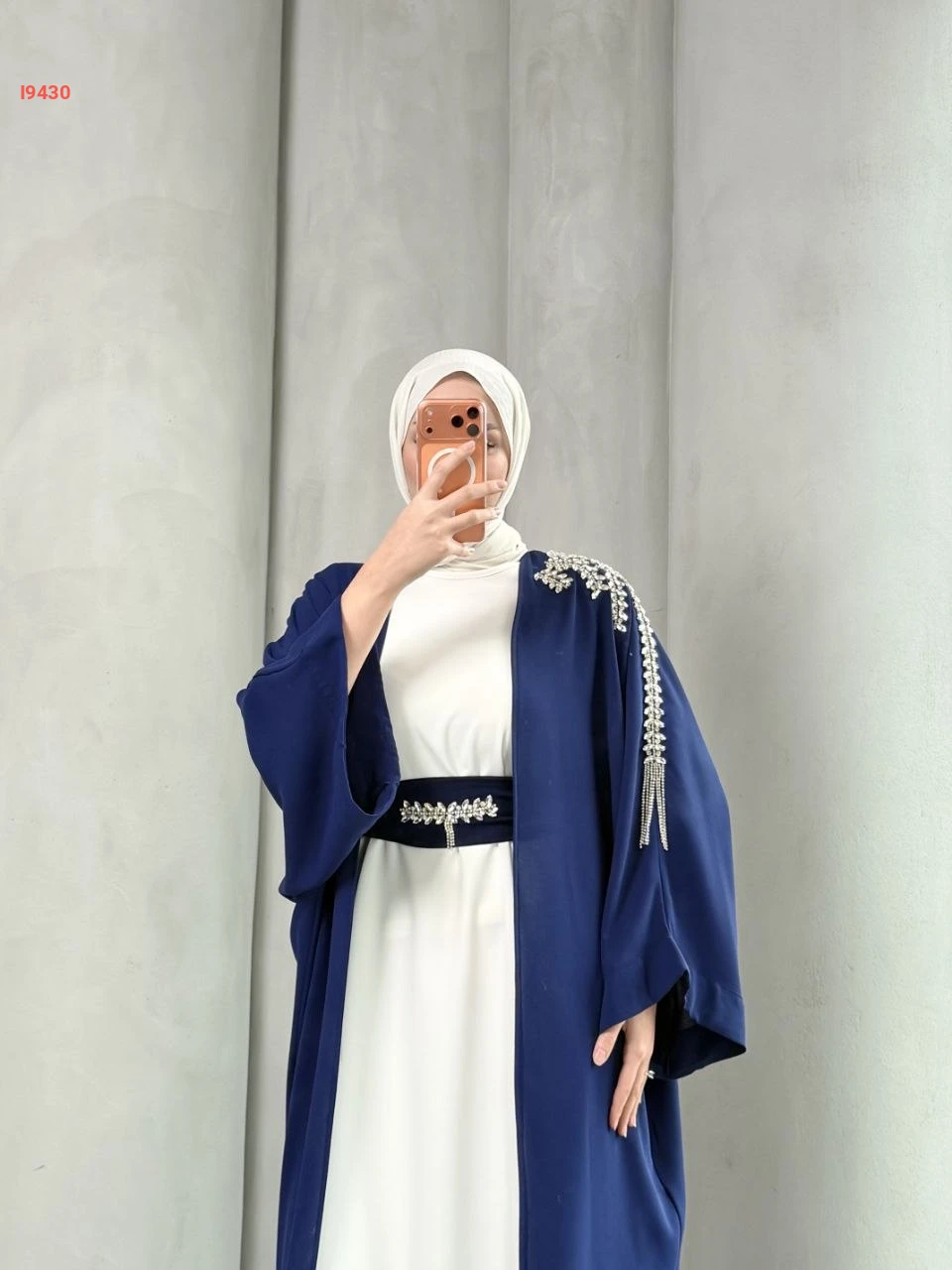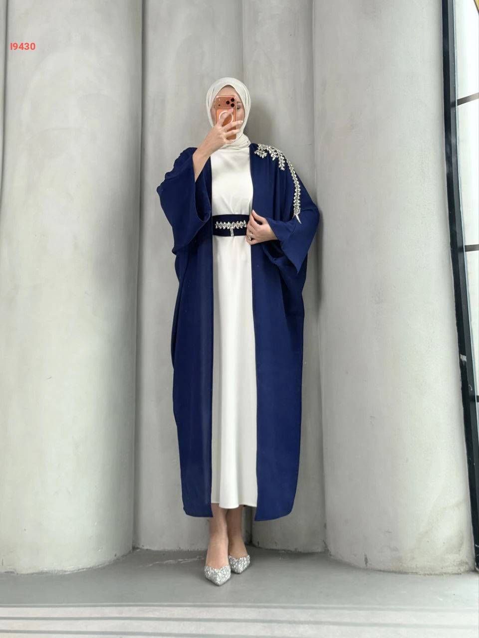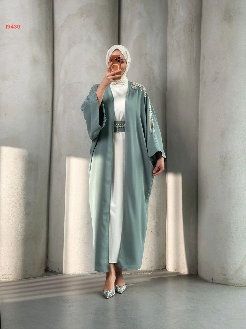 طقم عباية مزينة بالكريستال عند الكتف مع فستان سادة مع حزام