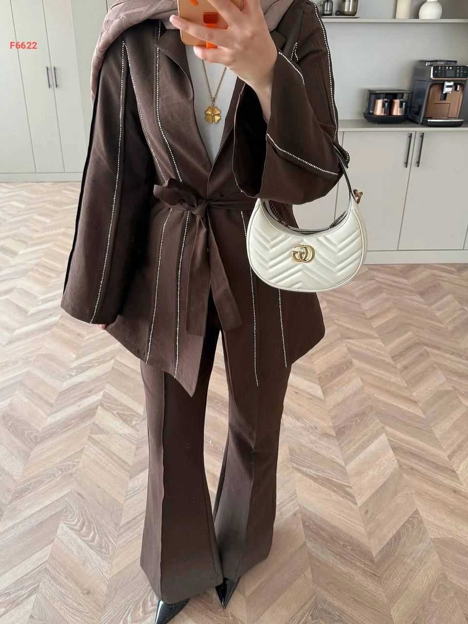 طقم بنطال وجاكيت مزين ألماس بزنار