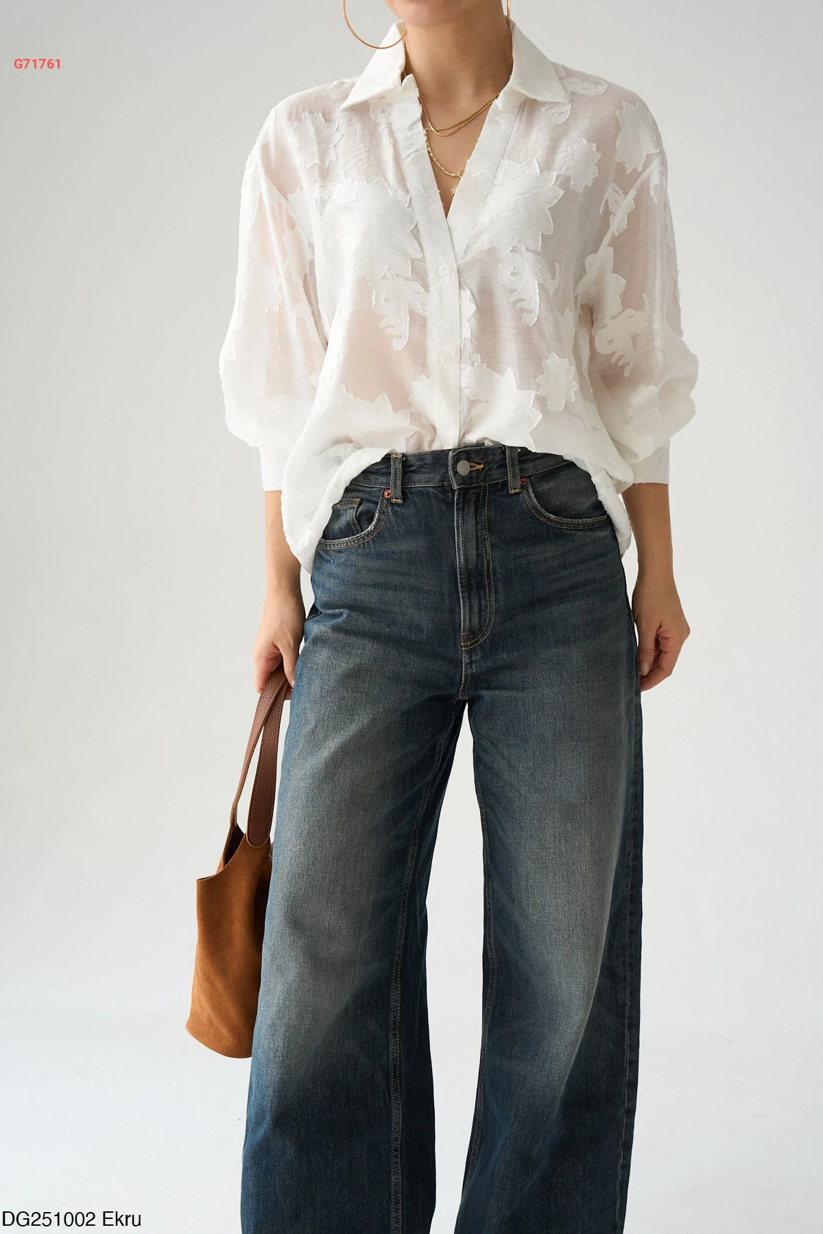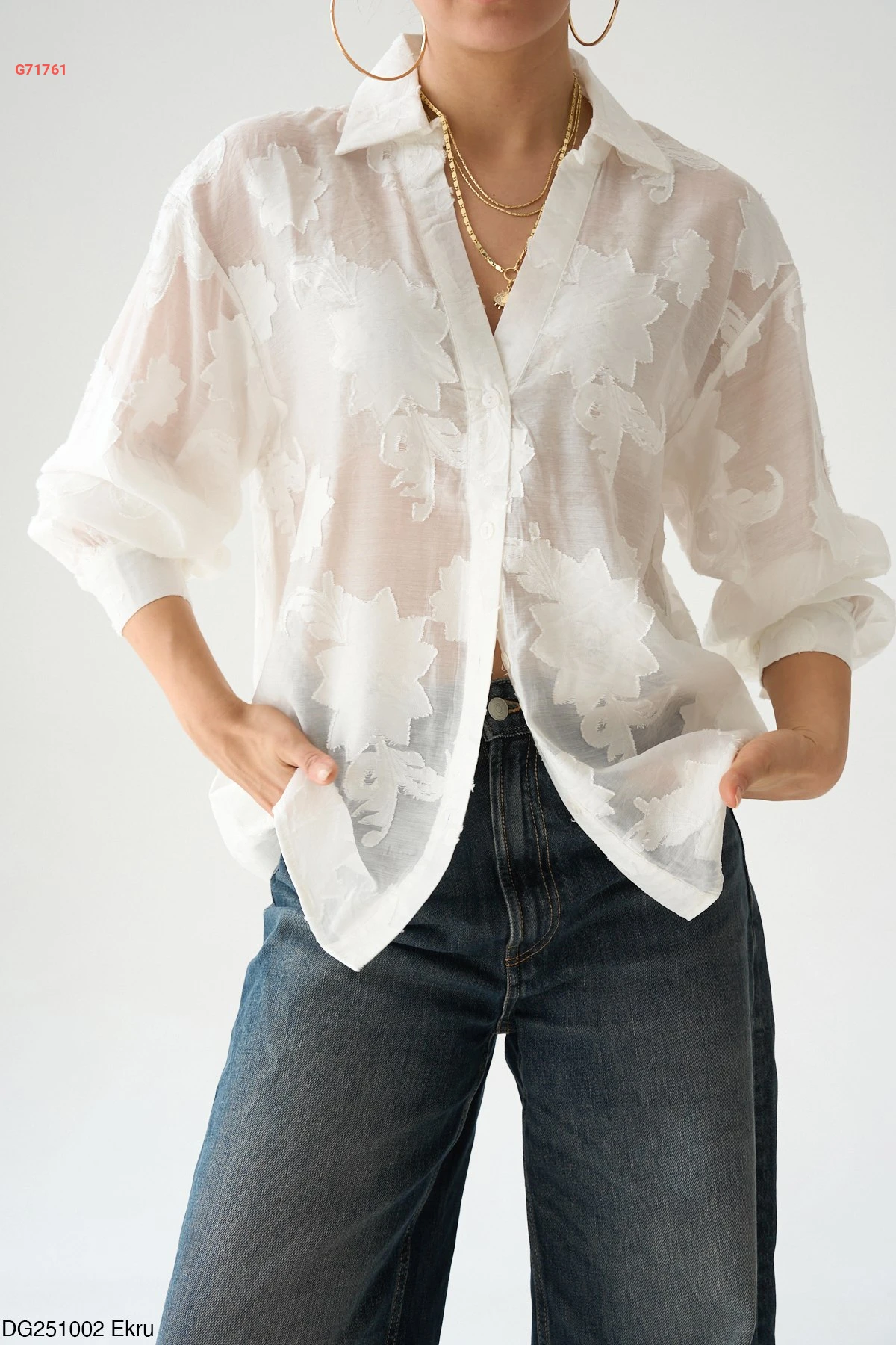 قميص أبيض شفاف بتفاصيل منقوشة