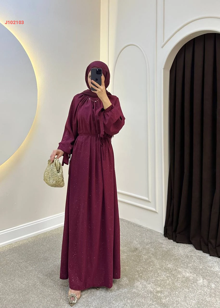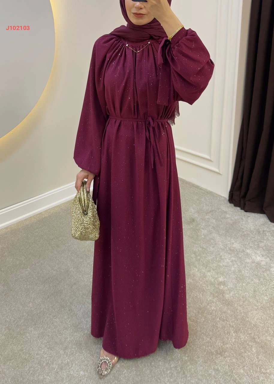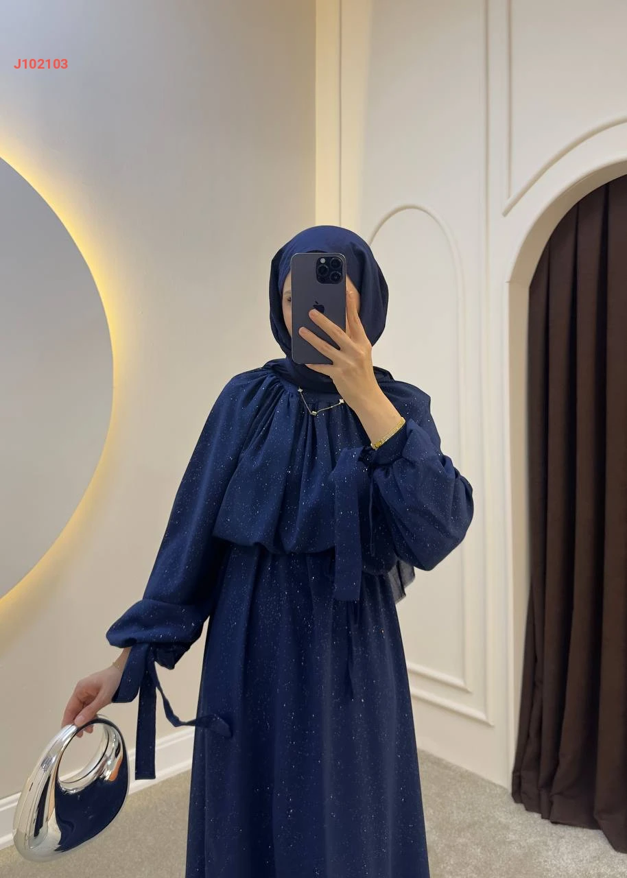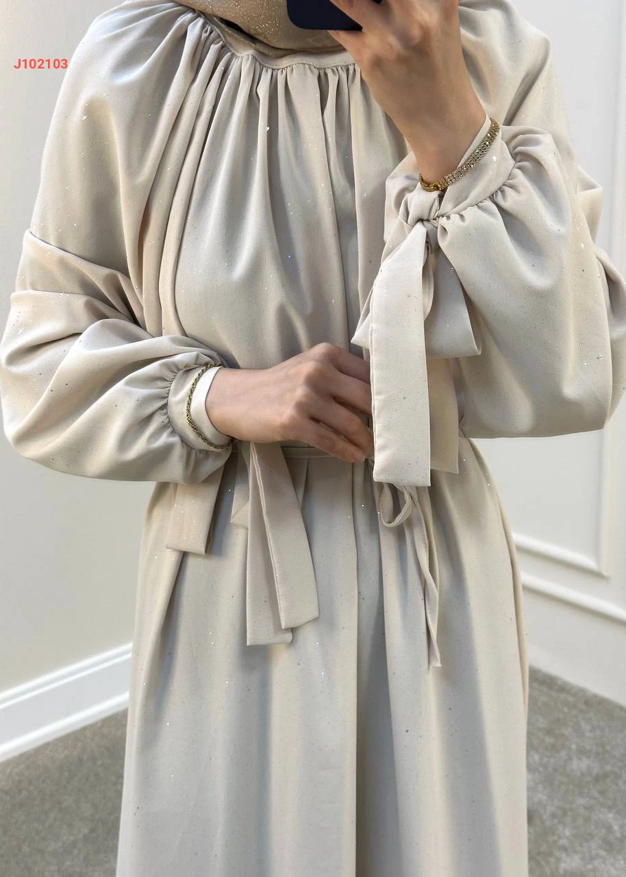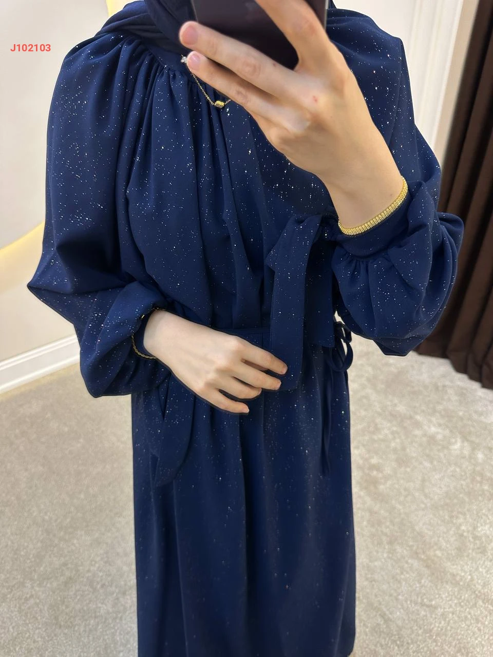فستان سواريه للمحجبات لامع بياقة دائرية مع ربطة عند الأكمام والخصر