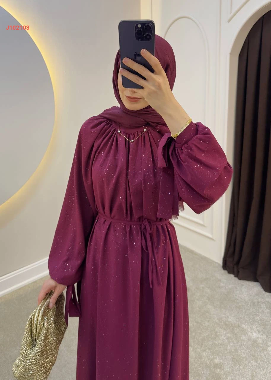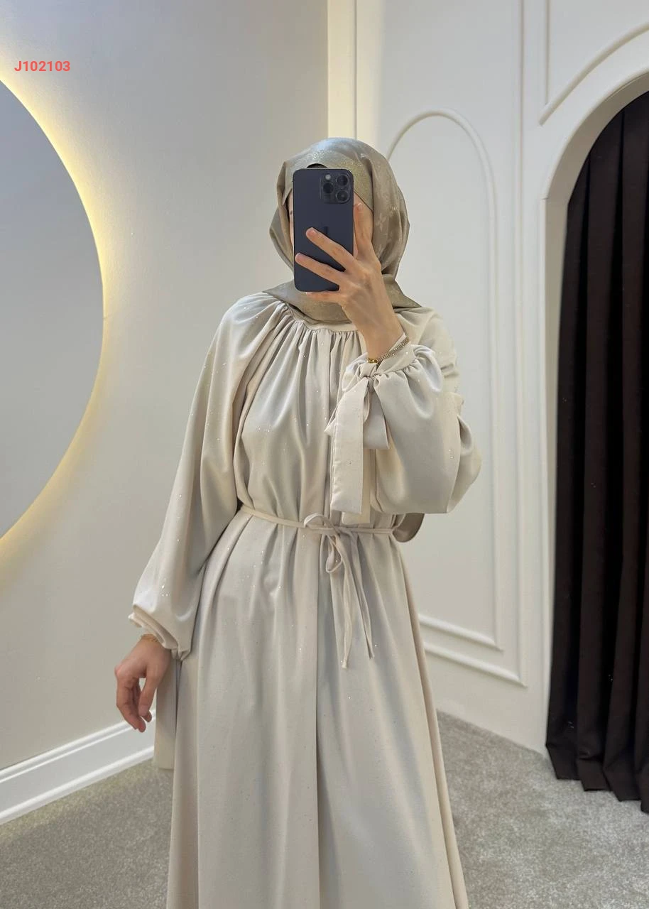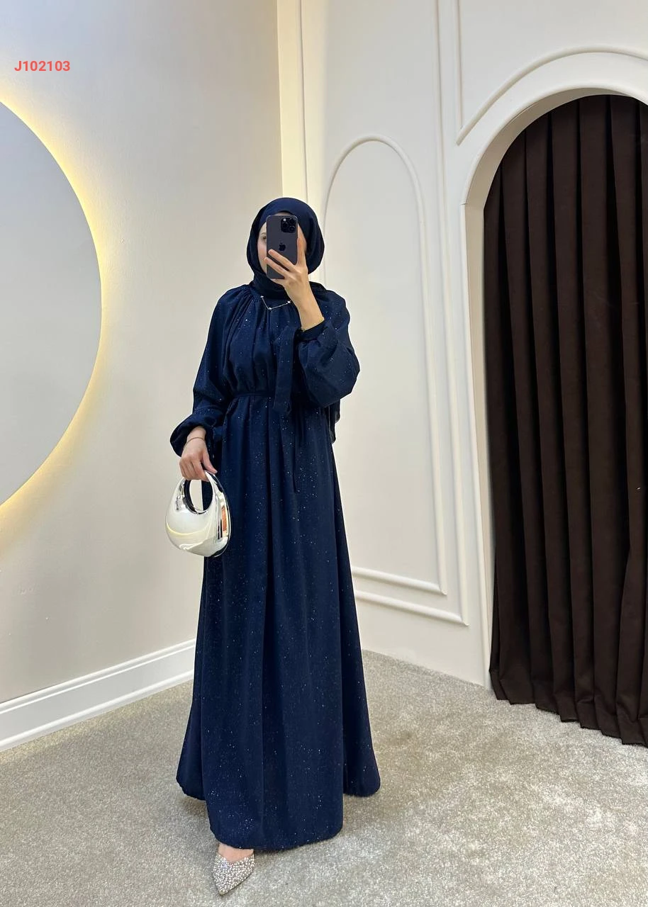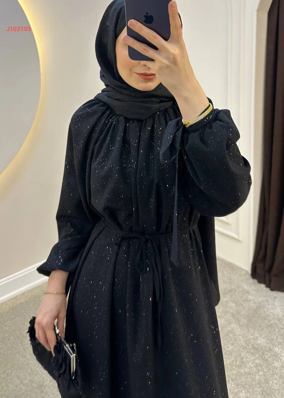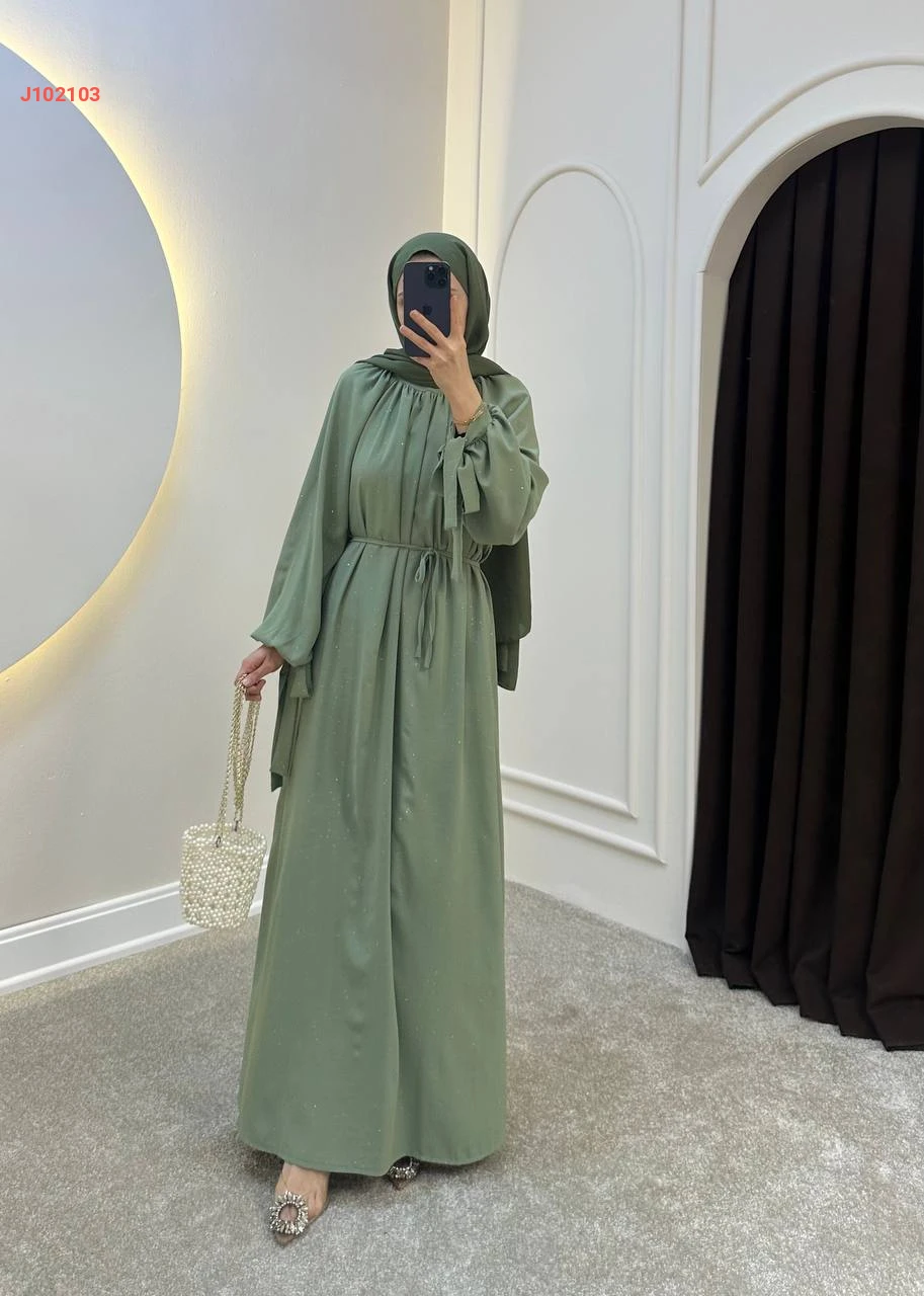 فستان سواريه للمحجبات لامع بياقة دائرية مع ربطة عند الأكمام والخصر
