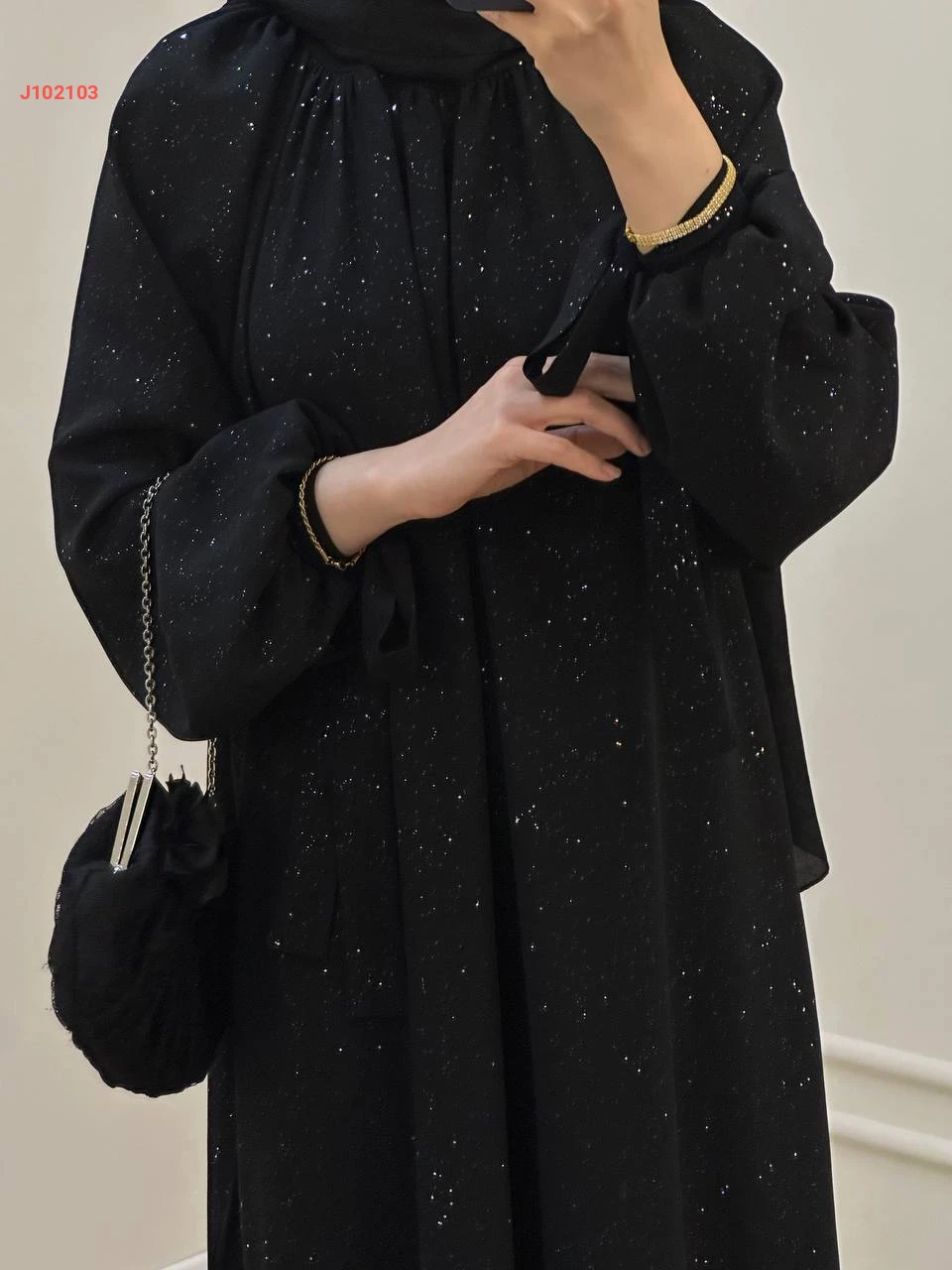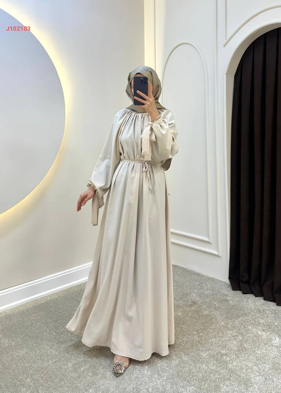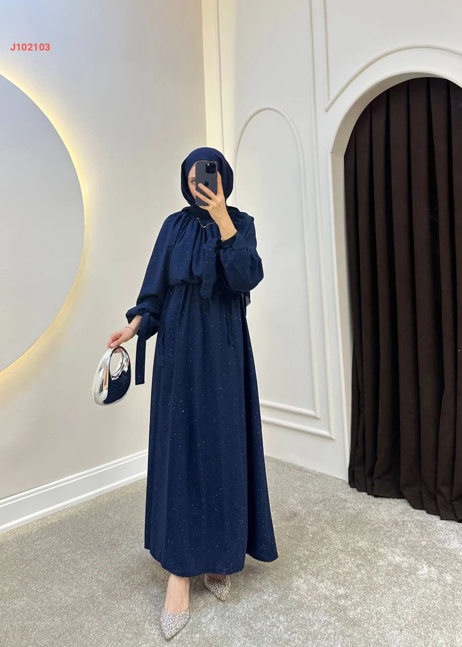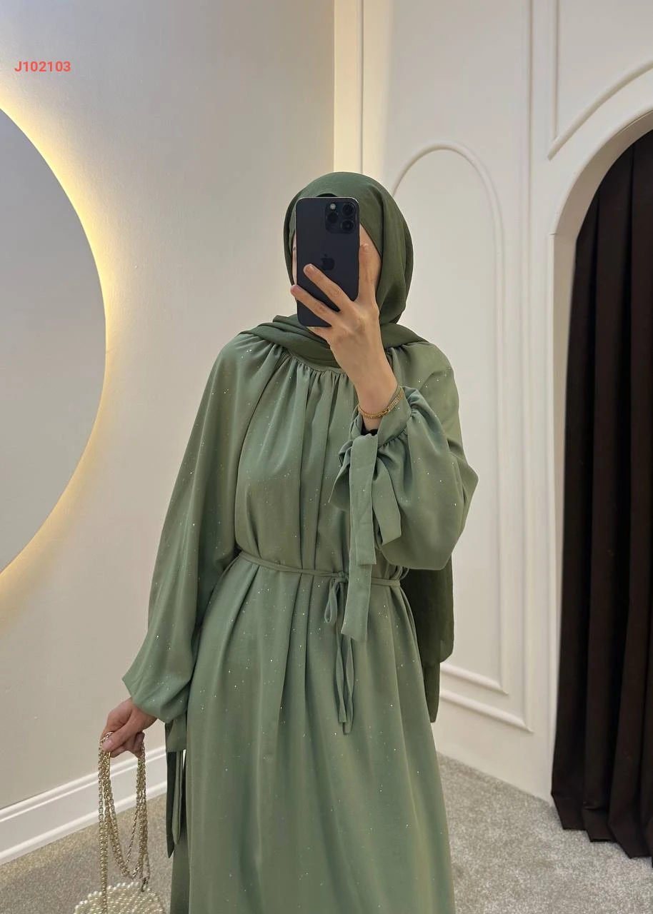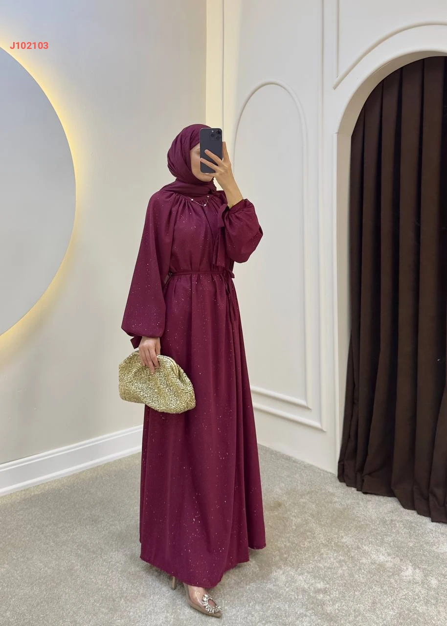 فستان سواريه للمحجبات لامع بياقة دائرية مع ربطة عند الأكمام والخصر
