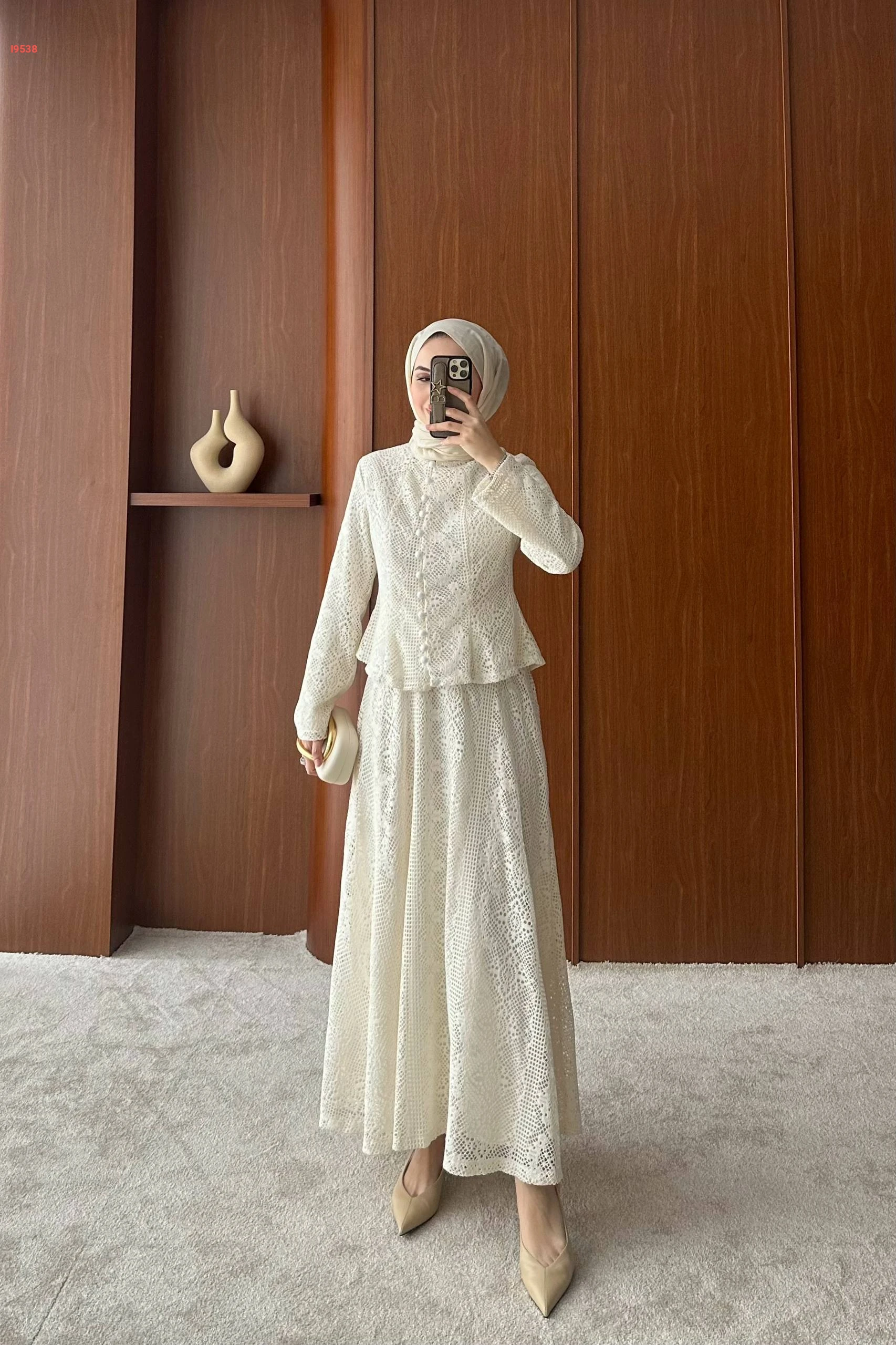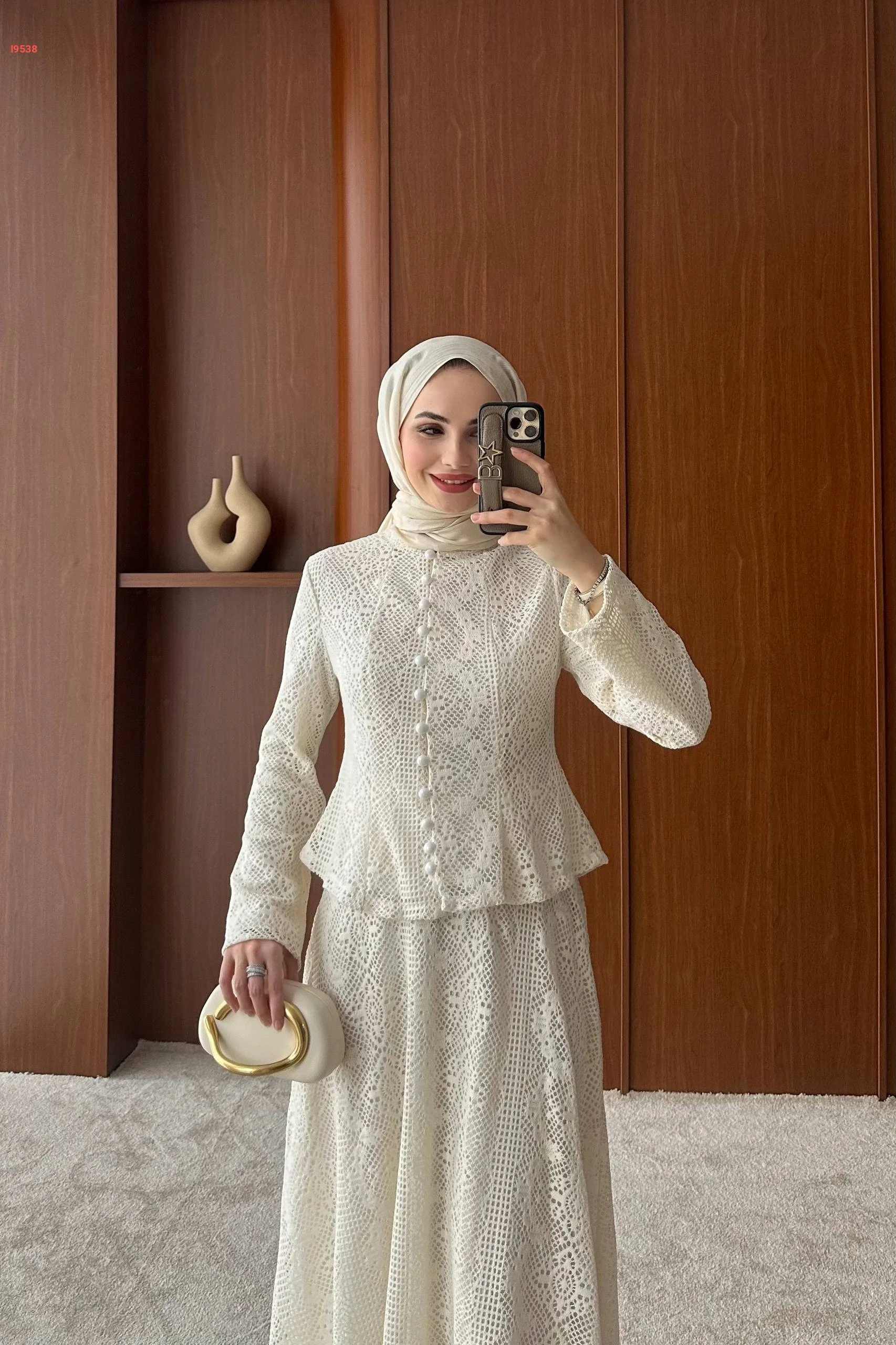 طقم "دانتيل" أبيض ناعم يتكون من سترة بخصر محدد وأزرار لؤلؤية مع تنورة طويلة
