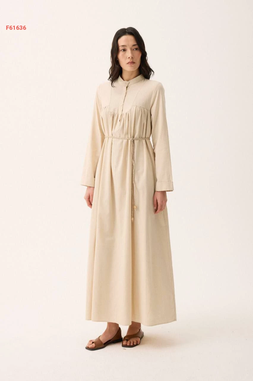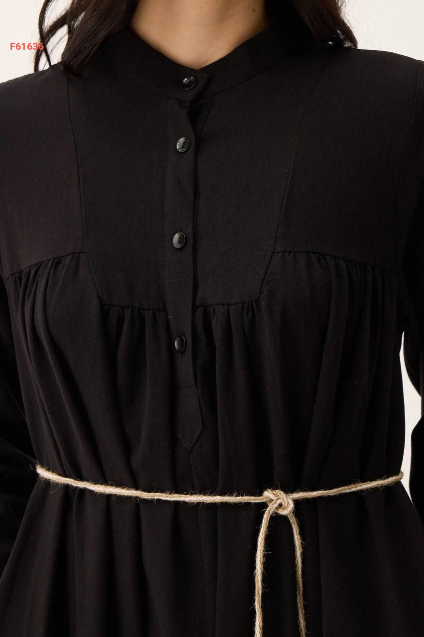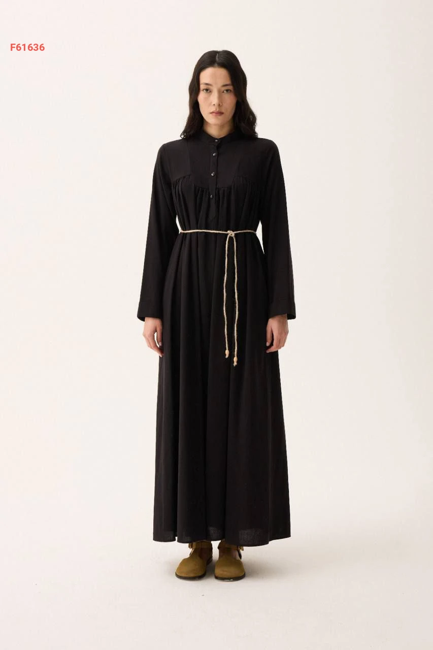 فستان طويل سادة بياقة دائرية بأزرار مع ربطة خصر
