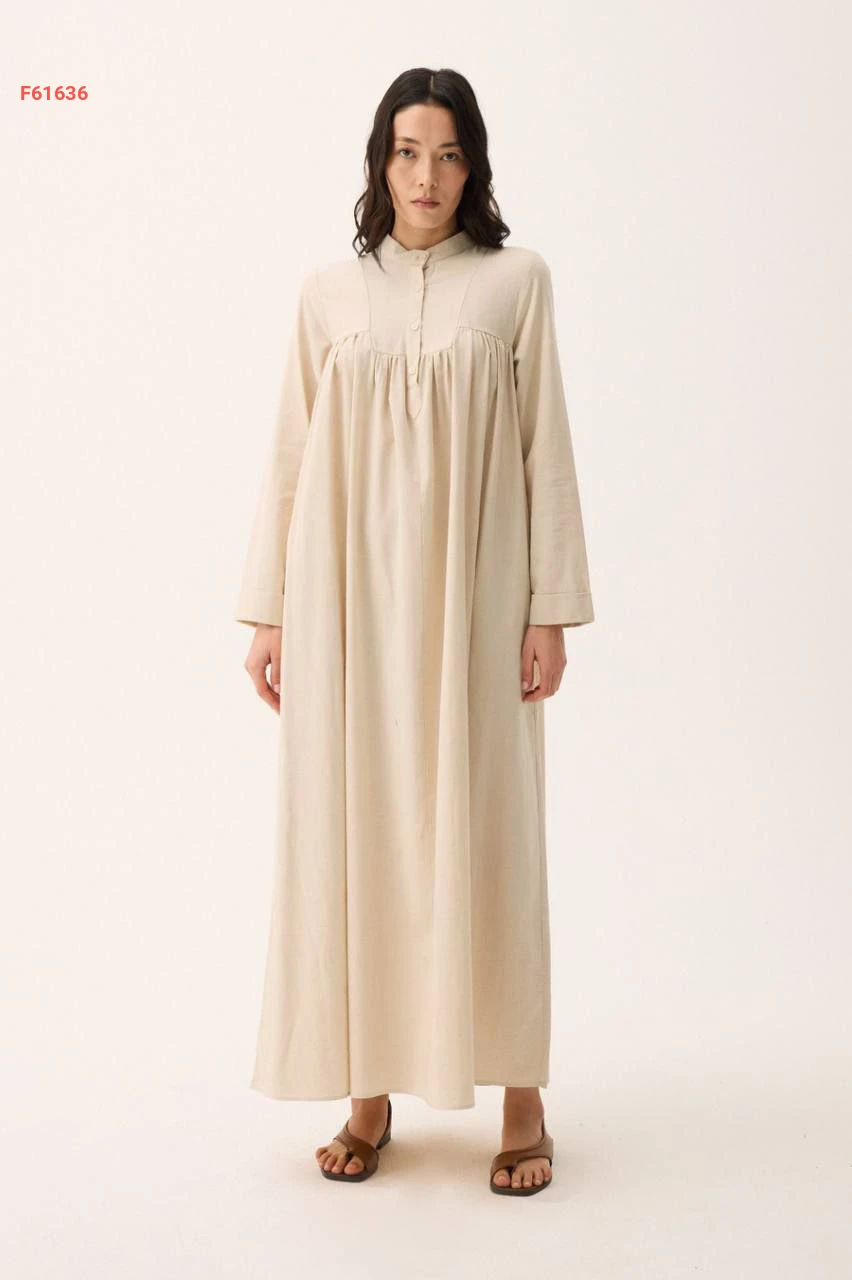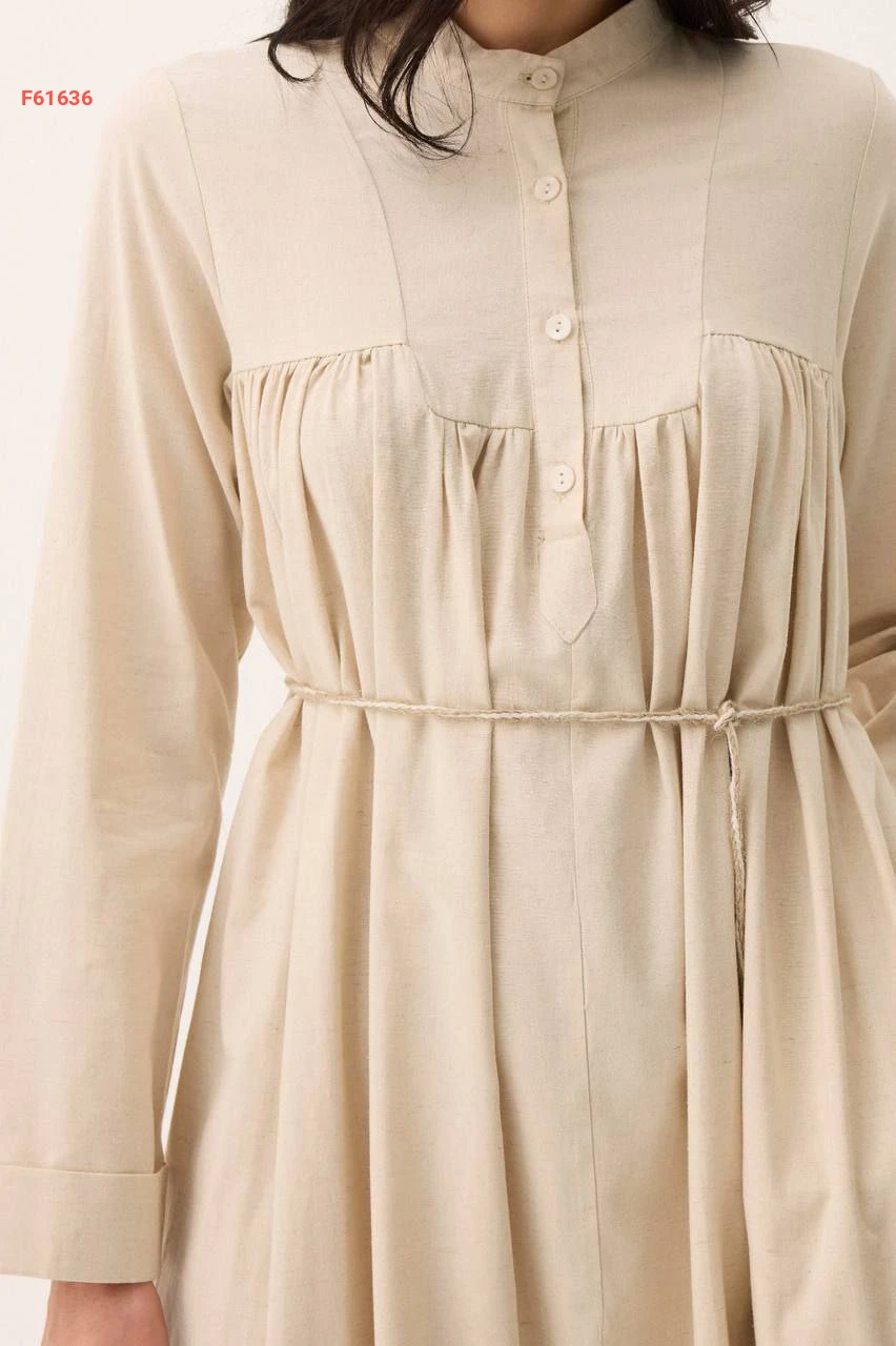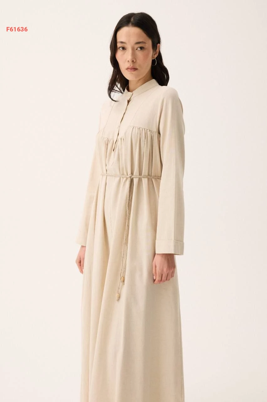 فستان طويل سادة بياقة دائرية بأزرار مع ربطة خصر