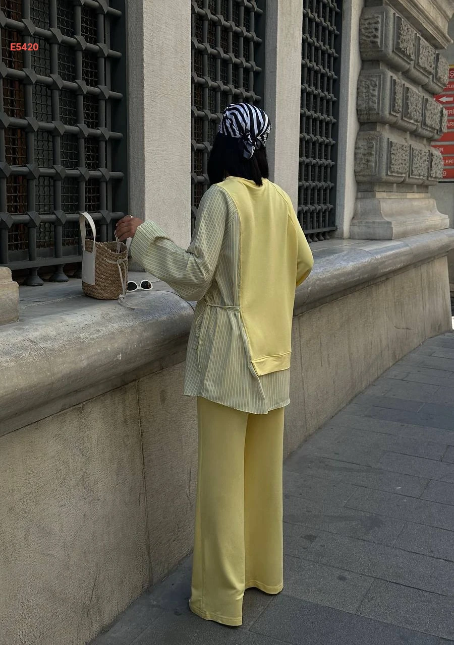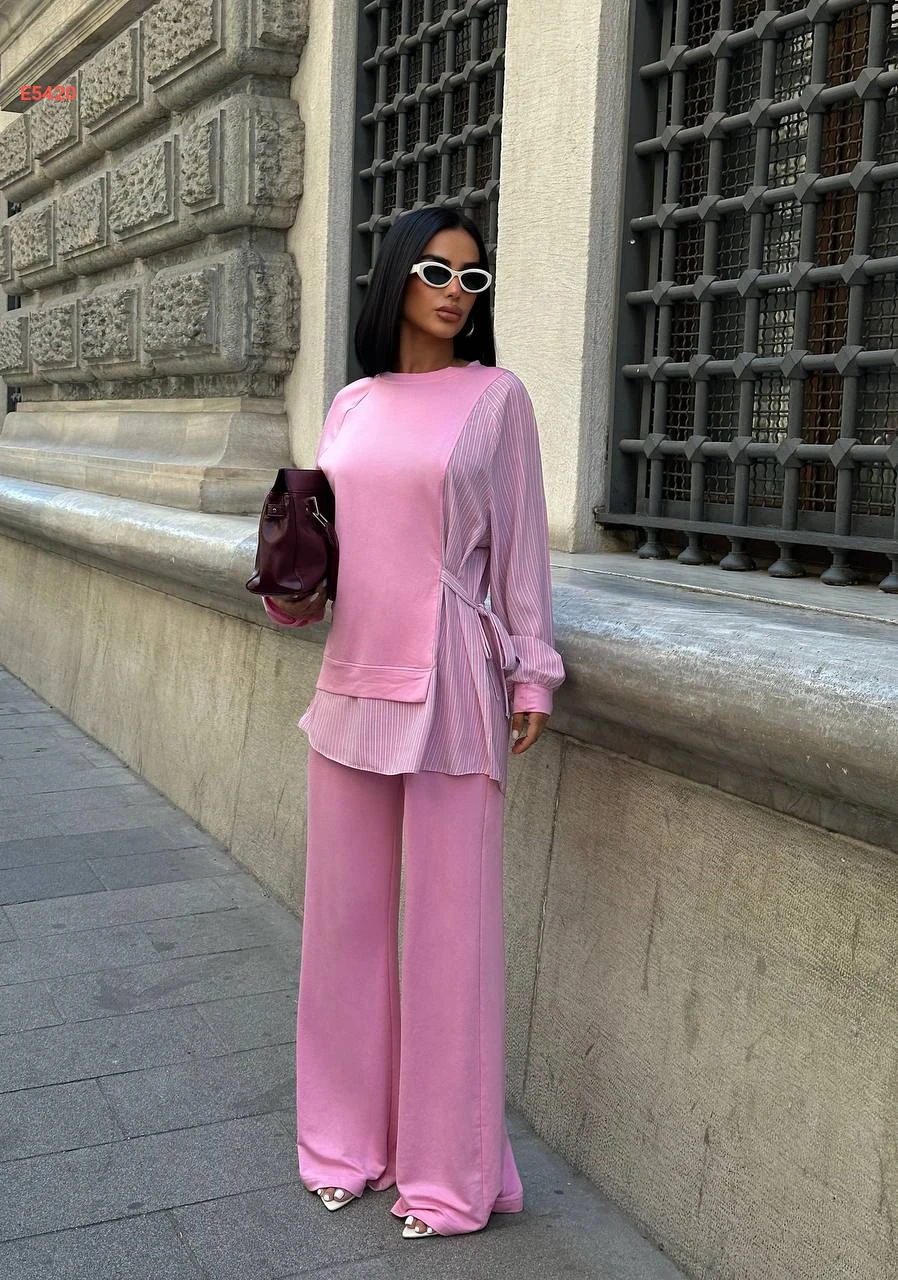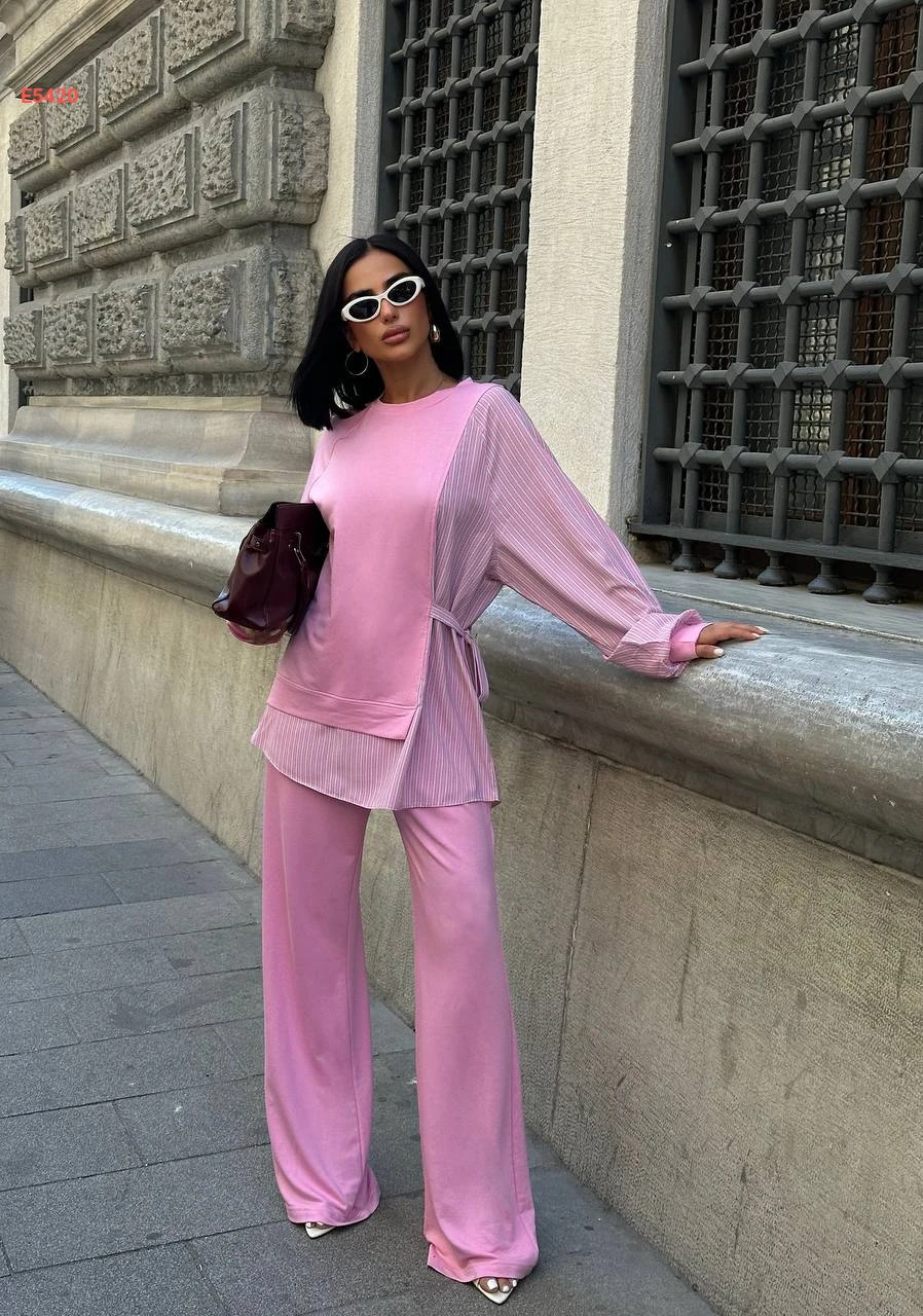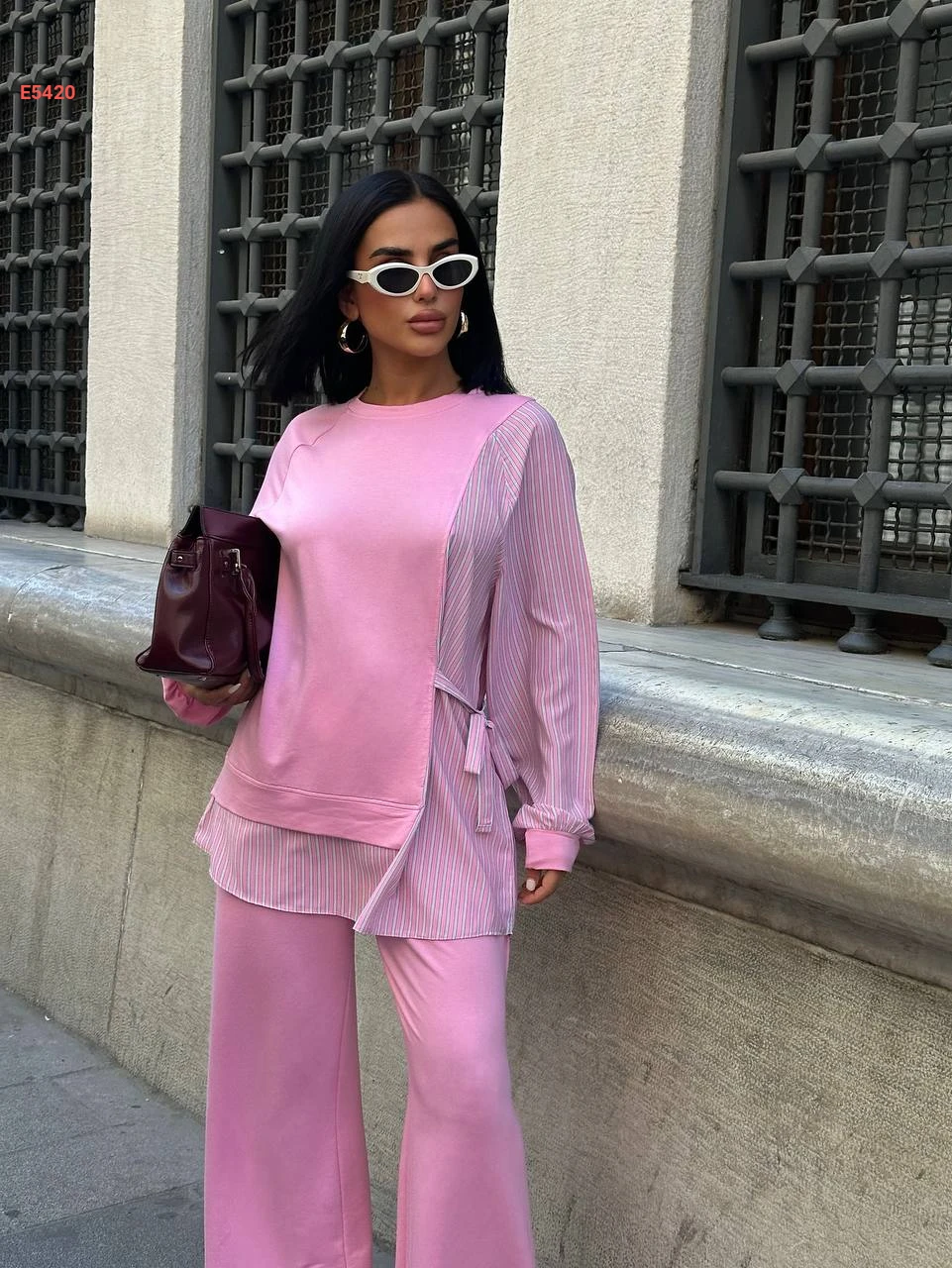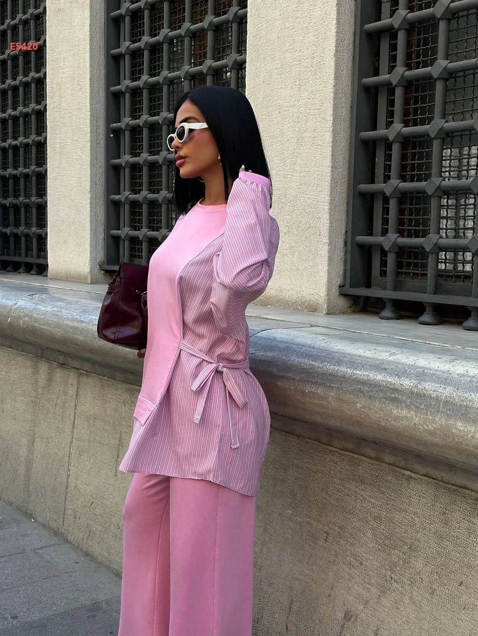 بيجامة قطعتين سادة بياقة دائرية بموديل قميص مخطط مع ربطة خصر جانبية
