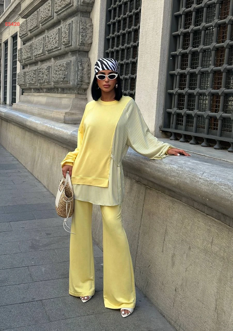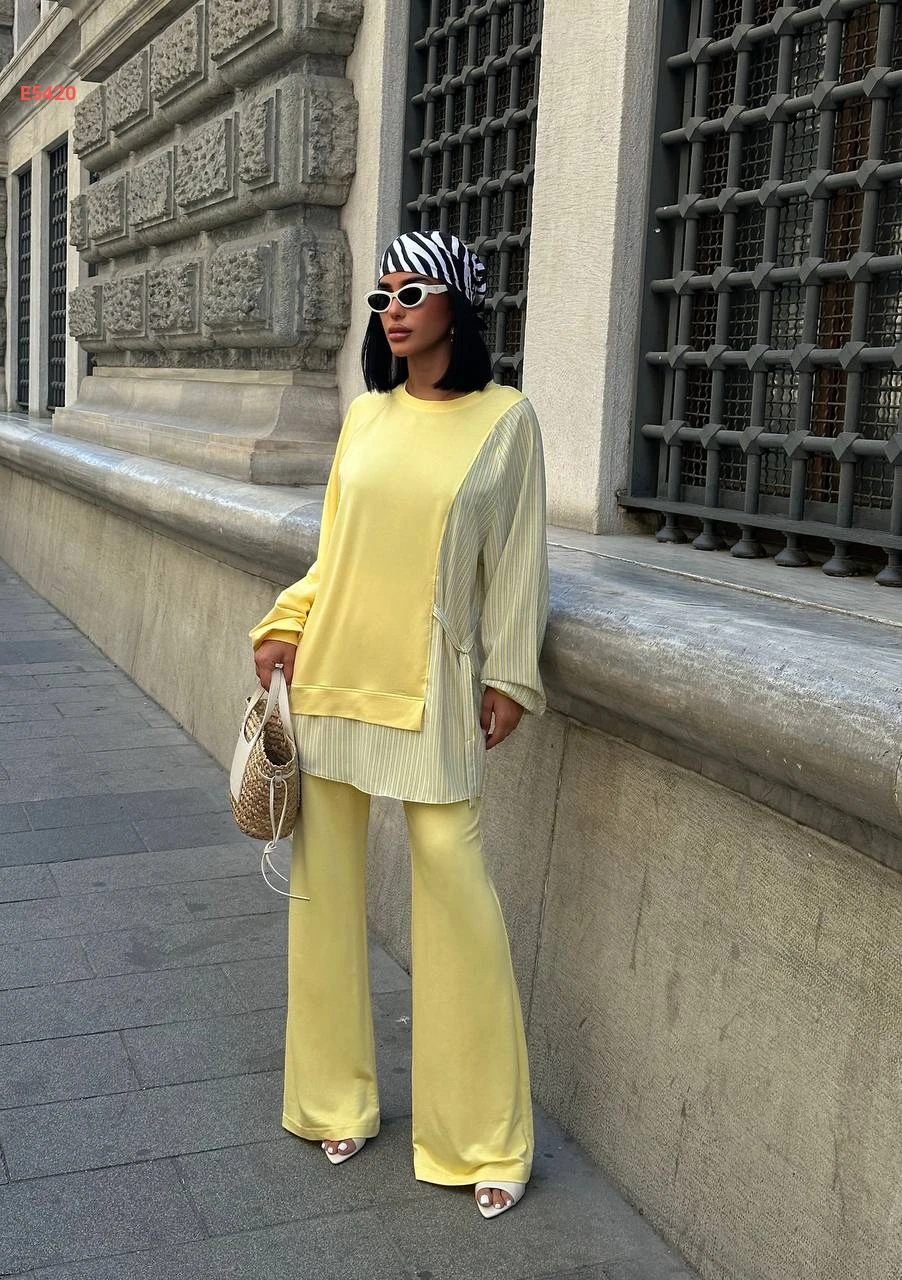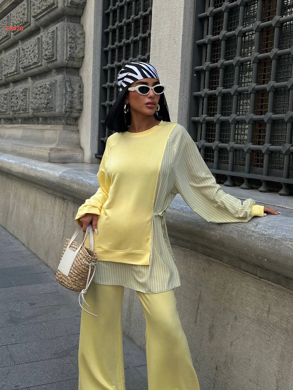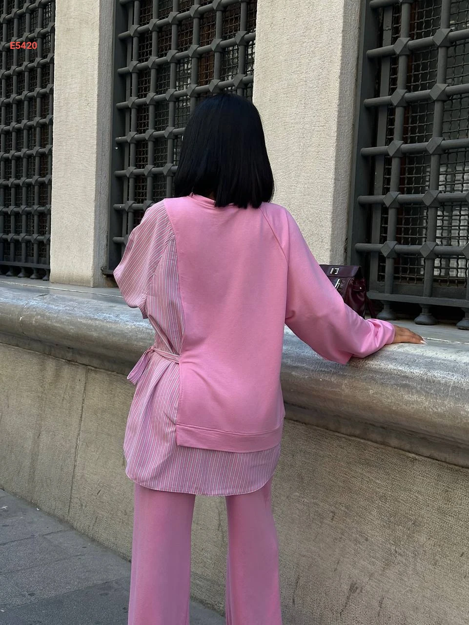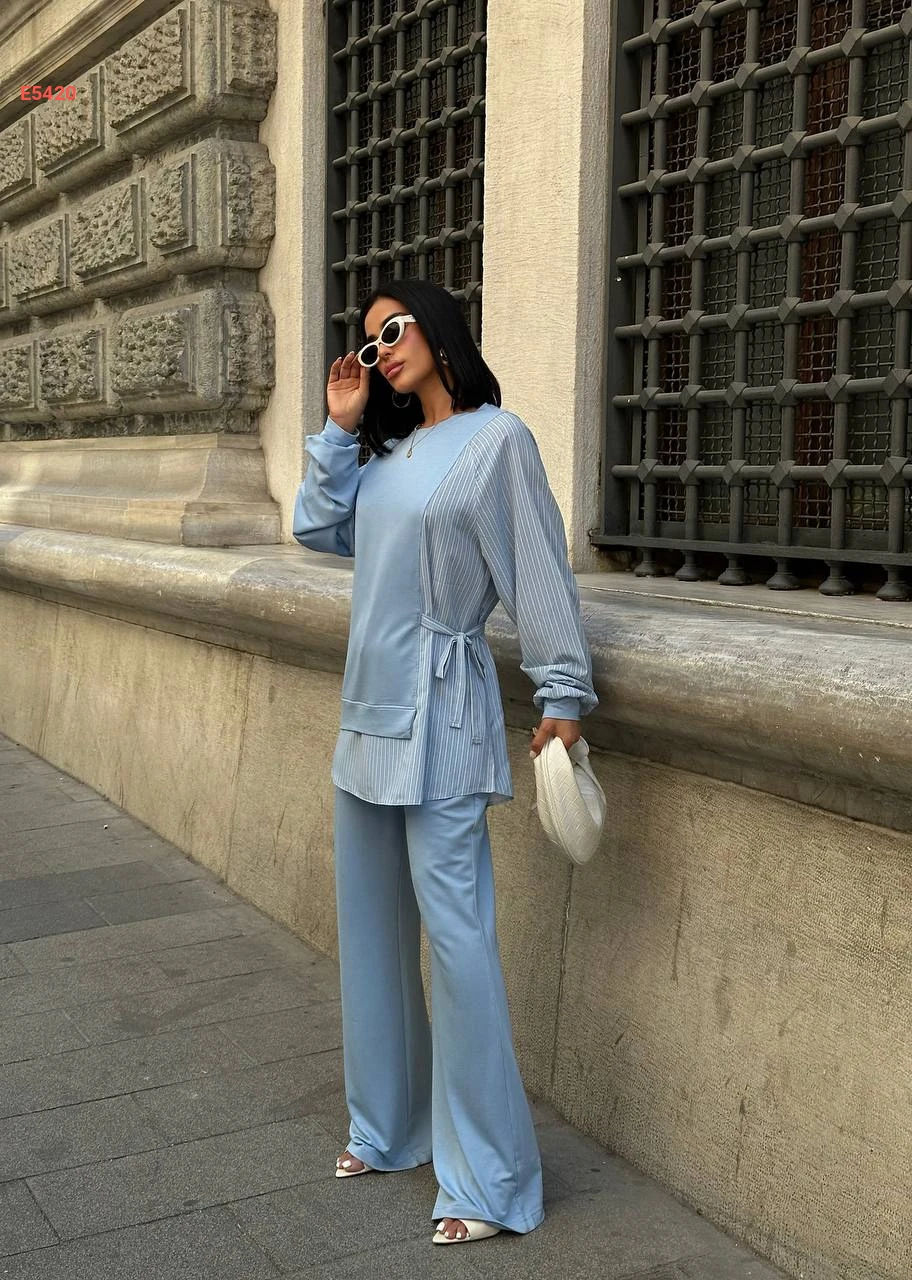 بيجامة قطعتين سادة بياقة دائرية بموديل قميص مخطط مع ربطة خصر جانبية