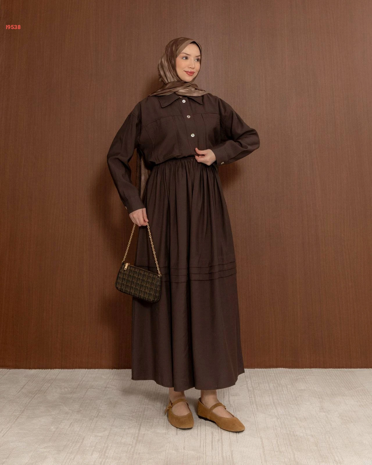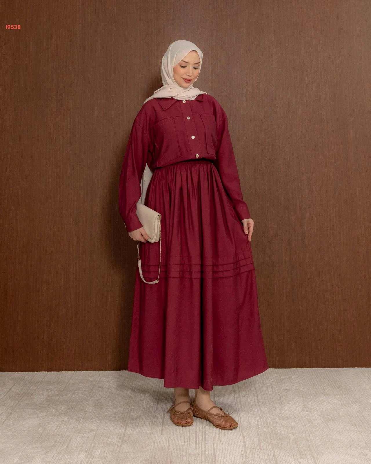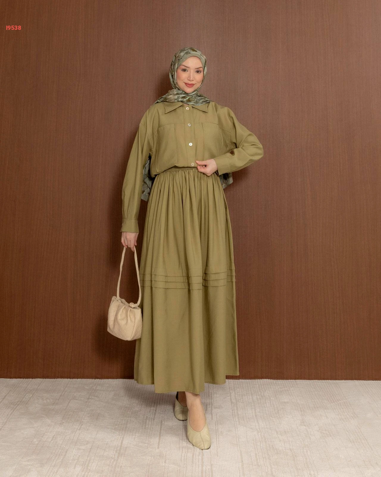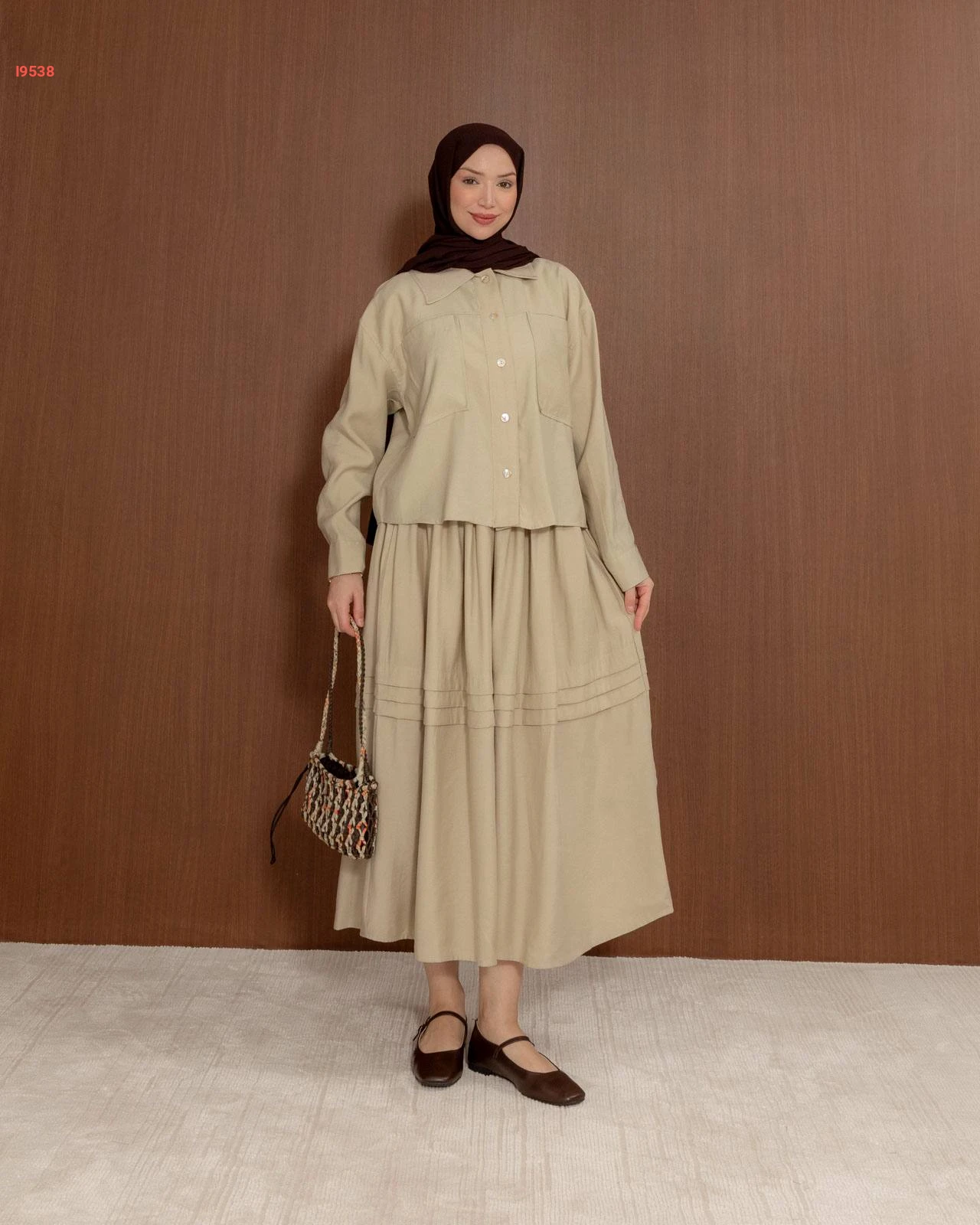 طقم نسائي راقٍ يتكون من تنورة واسعة بكسرات أنيقة وقميص بجيوب أمامية