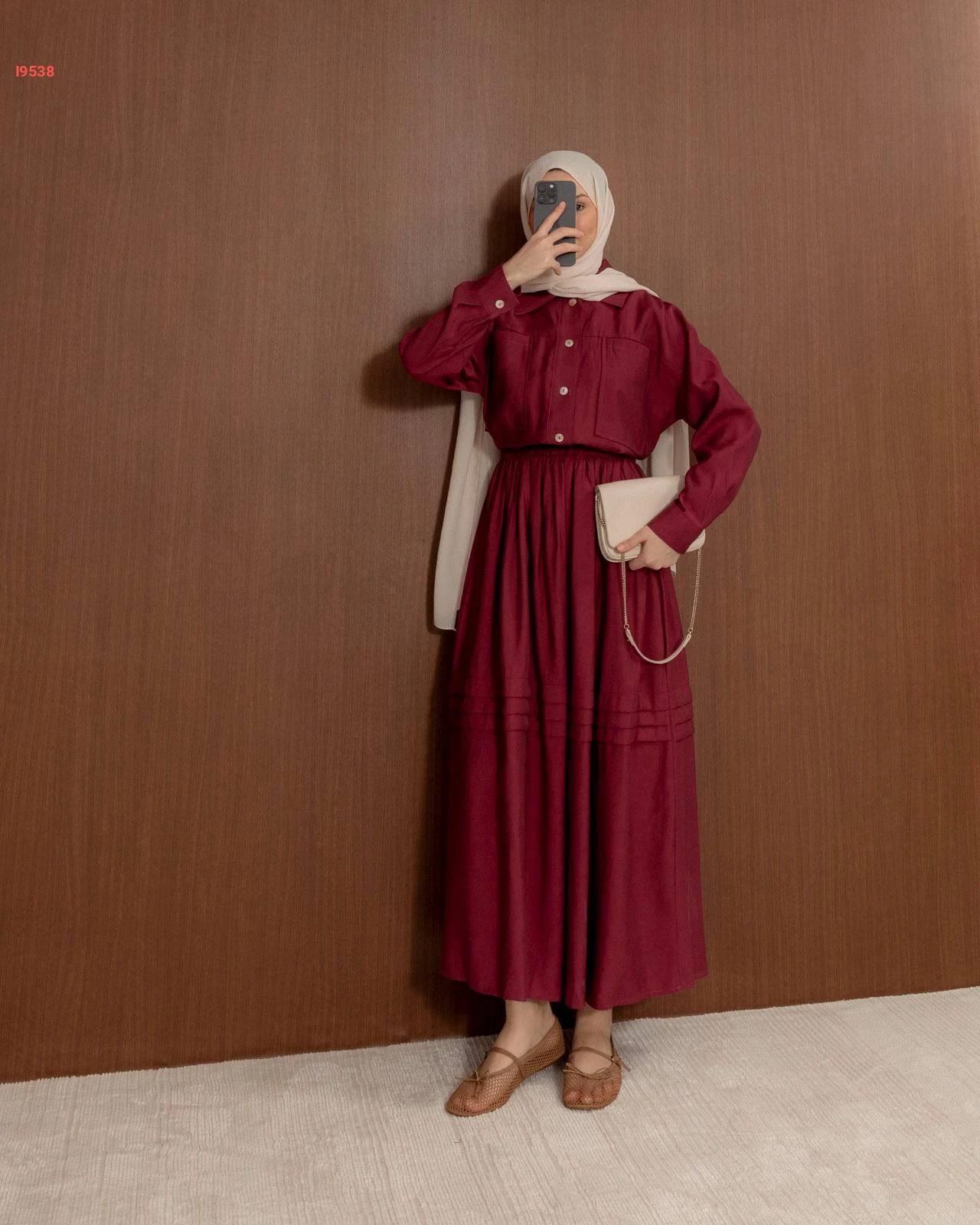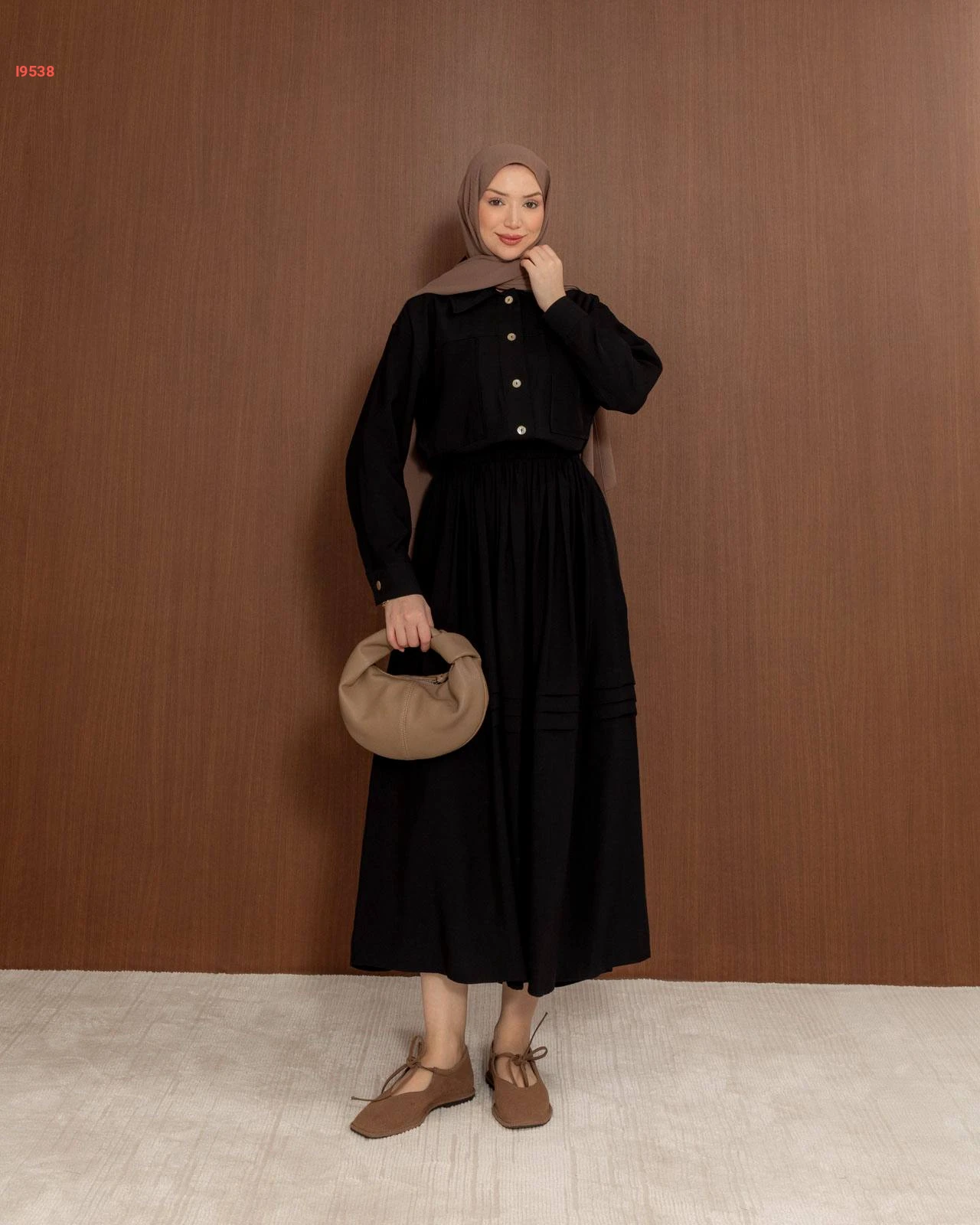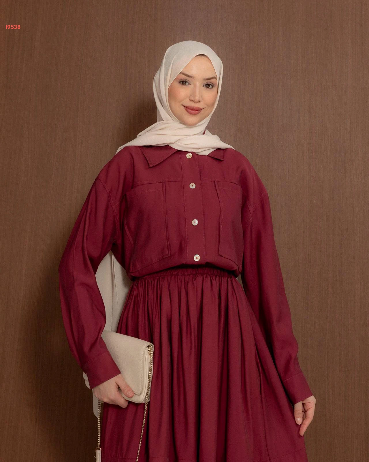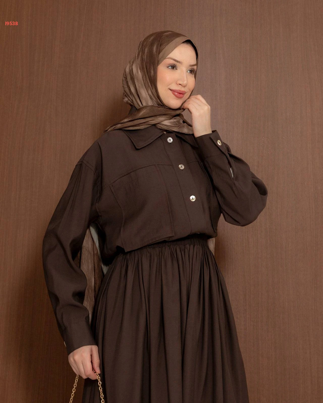 طقم نسائي راقٍ يتكون من تنورة واسعة بكسرات أنيقة وقميص بجيوب أمامية