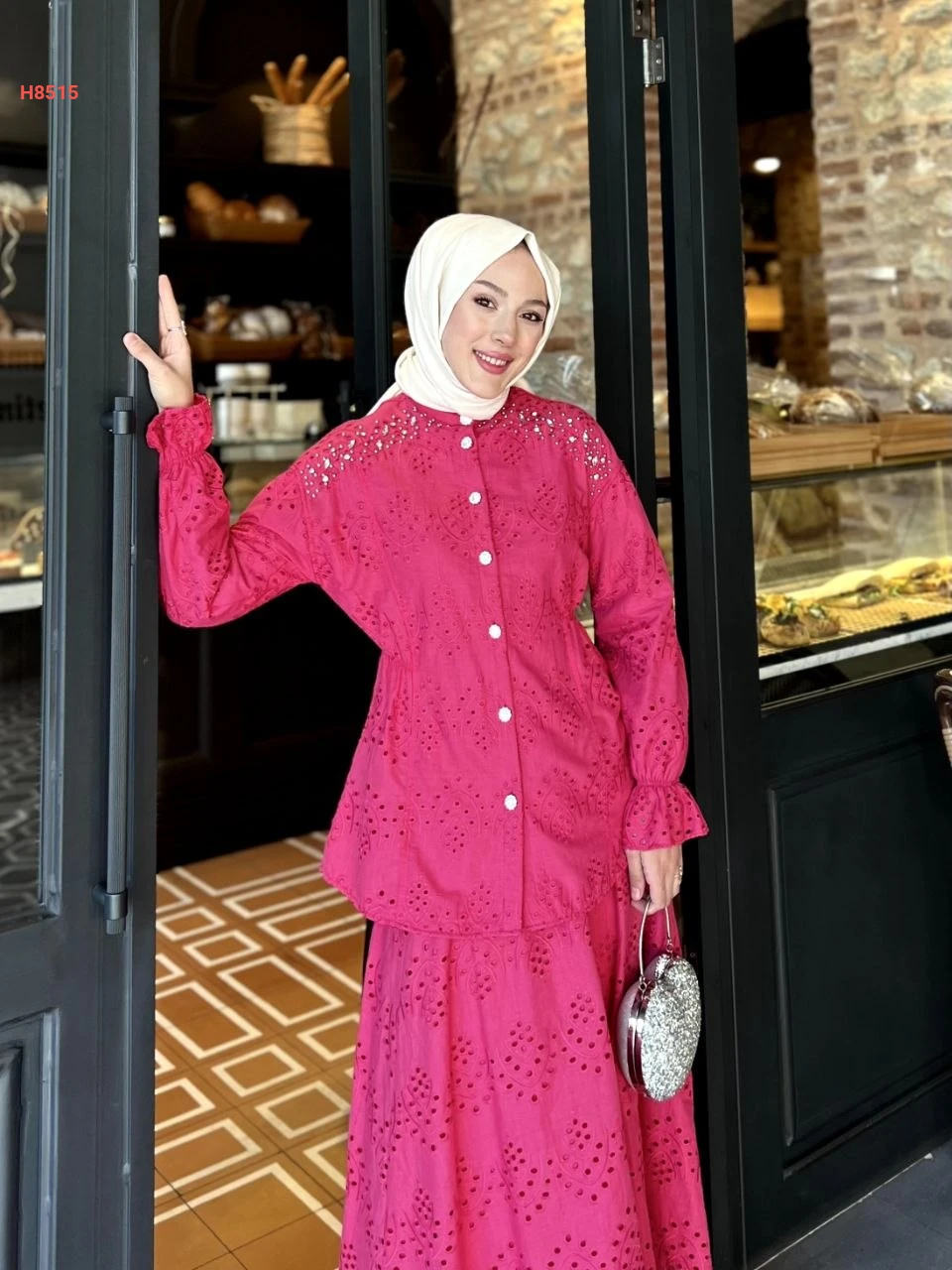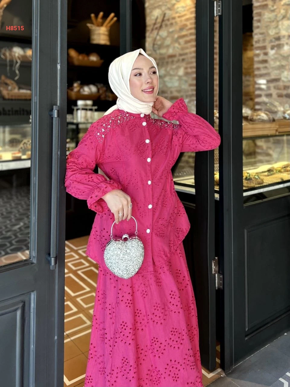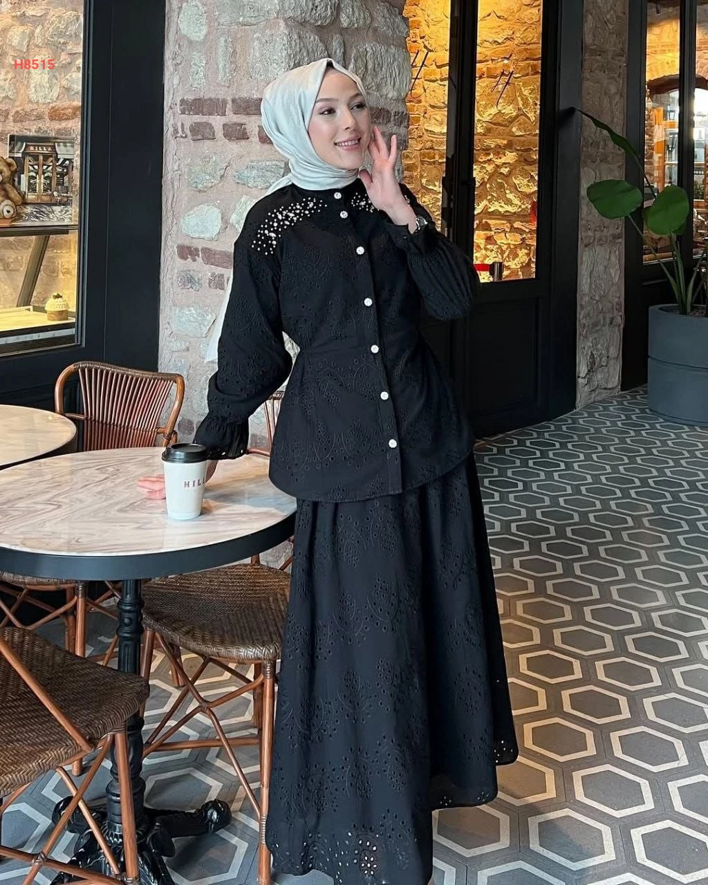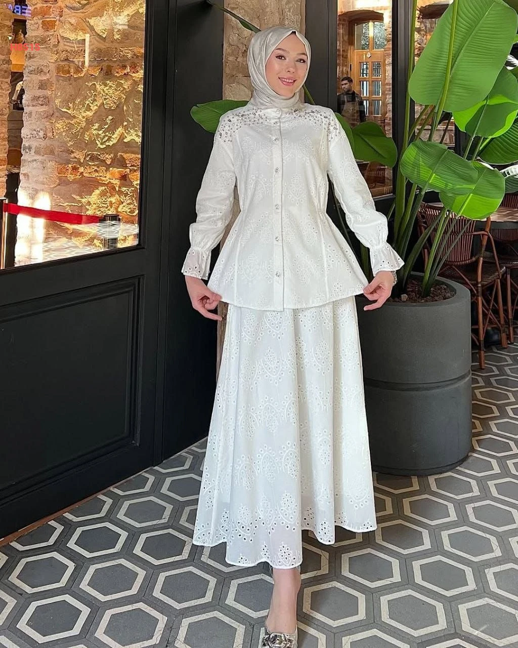 طقم نسائي راقٍ مكون من قطعتين من قماش القطن المخرم، يتميز بقميص مزين بفصوص لامعة على الكتفين وتنورة طويلة واسعة لإطلالة محتشمة وجذابة.